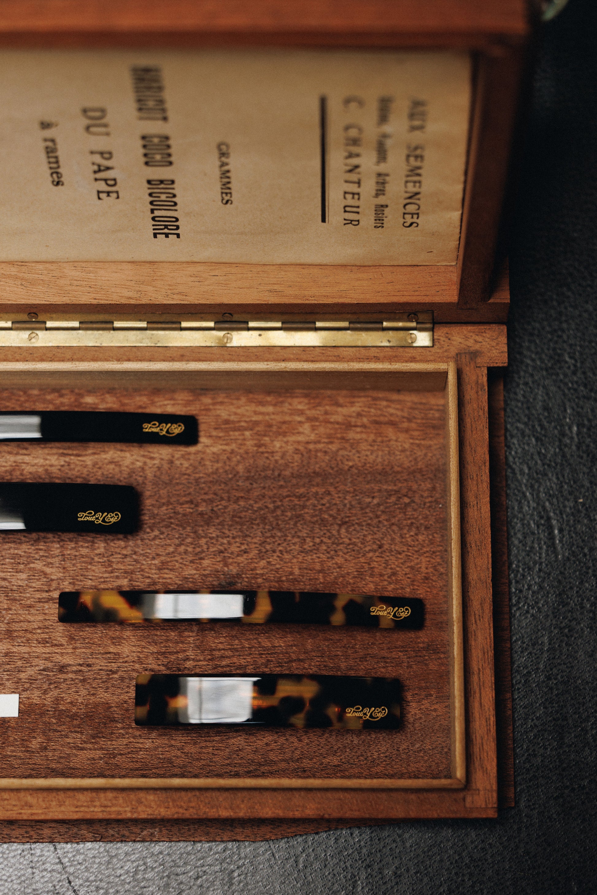 本コレクションは「アセテートの街」として知られるフランス・オヨナ(Oyonnax)で生産されたプレミアムアセテートを使用し、現地で丁寧に製作されました。 オヨナは19世紀後半より、角やセルロイド、アセテートを扱いながら眼鏡やアクセサリー産業を発展させてきた地域であり、繊細な成形技術と完璧な仕上げによって世界的な評価を得ています。