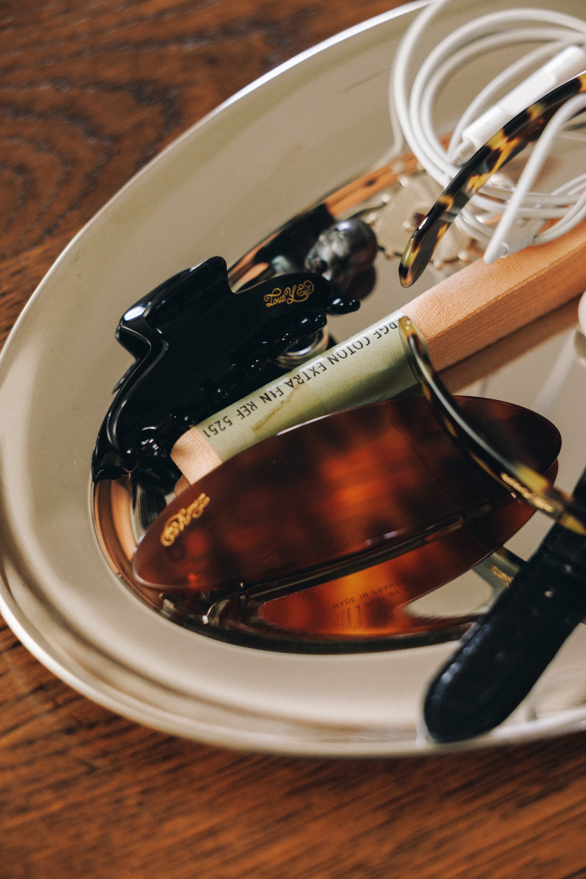 アセテートは、コットンや木材パルプから得られるセルロースを原料とした天然素材です。 合成プラスチックとは異なり、柔らかな手触りと自然な艶、深みのある色合いを持ち、色が素材全体に均一に染み込んでいるため、長く使用しても鮮やかさと光沢を保ちます。 プラスチックよりも質感・品質ともに優れていますが、製作工程が複雑でコストが高いため、高級眼鏡フレームやヘアアクセサリーに用いられることが多い素材です。 その中でもオヨナで仕上げられたアセテートは、ガラスのように滑らかな表面、鮮明な色と模様、そして優れた耐久性により、長く美しい形を保ちます。