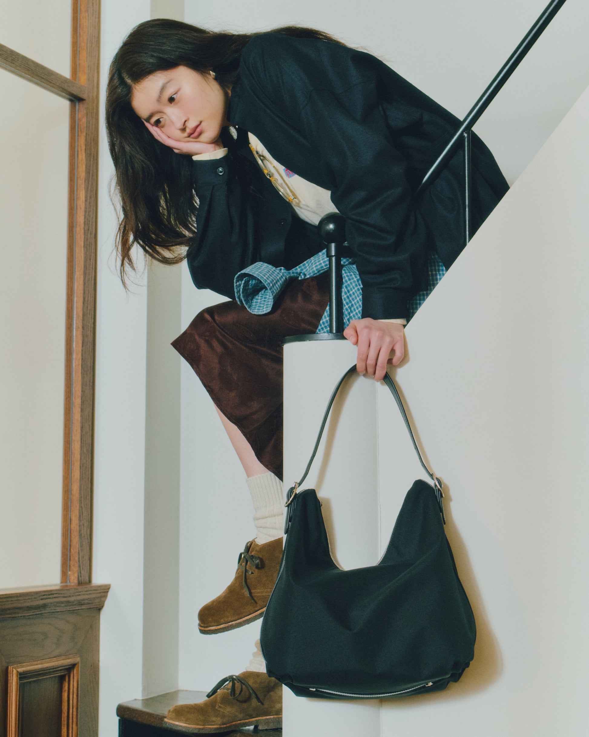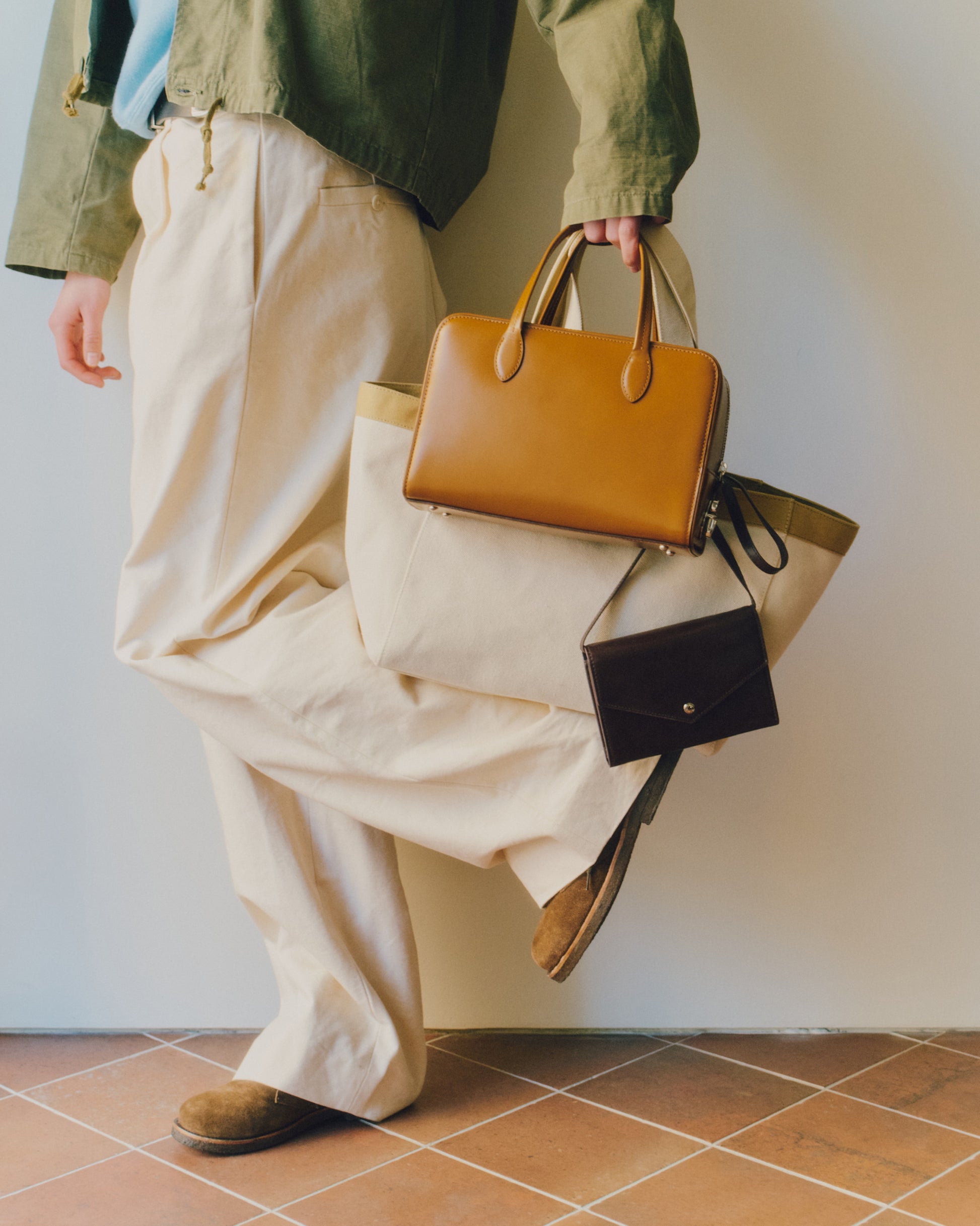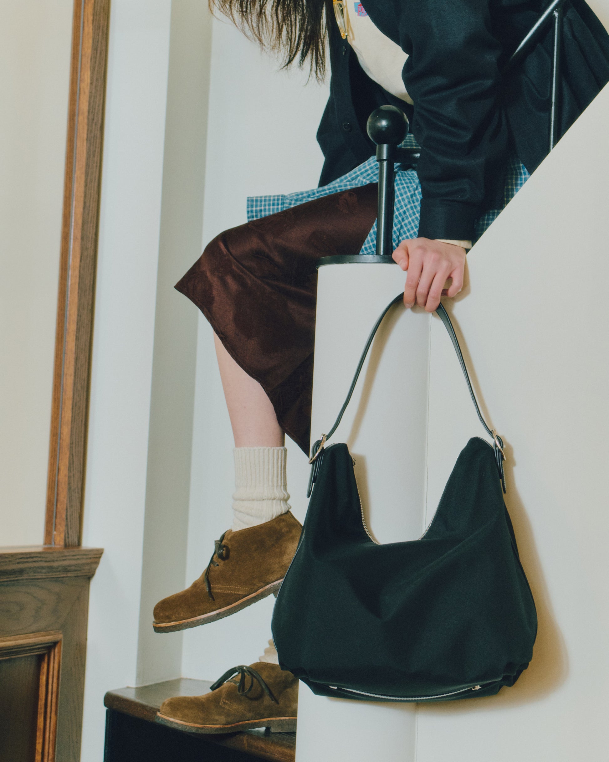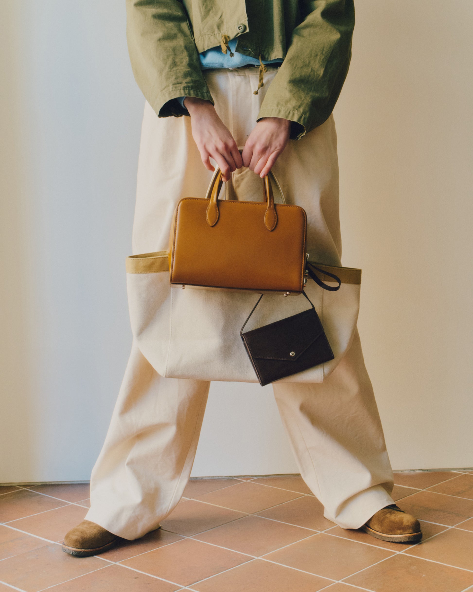 スエードの牛革を使用し、革の表情に応じて色味がほのかに変化する、奥行きのある質感が特徴です。