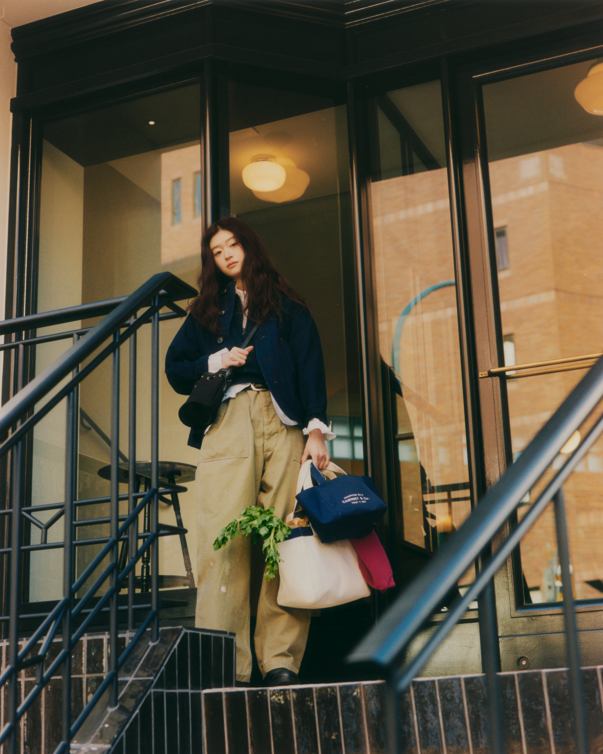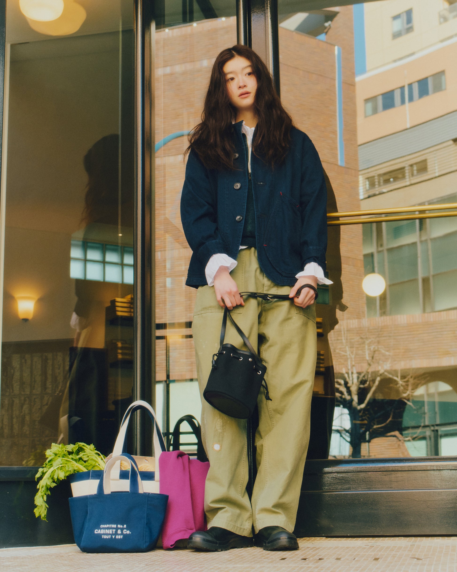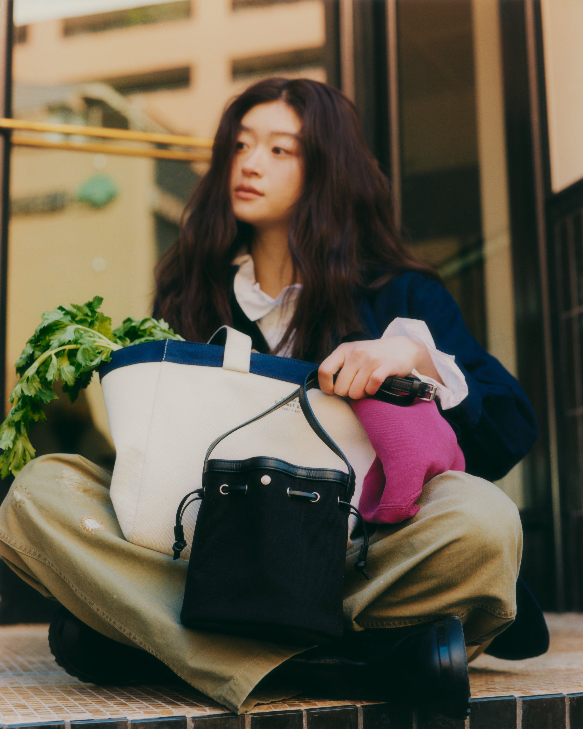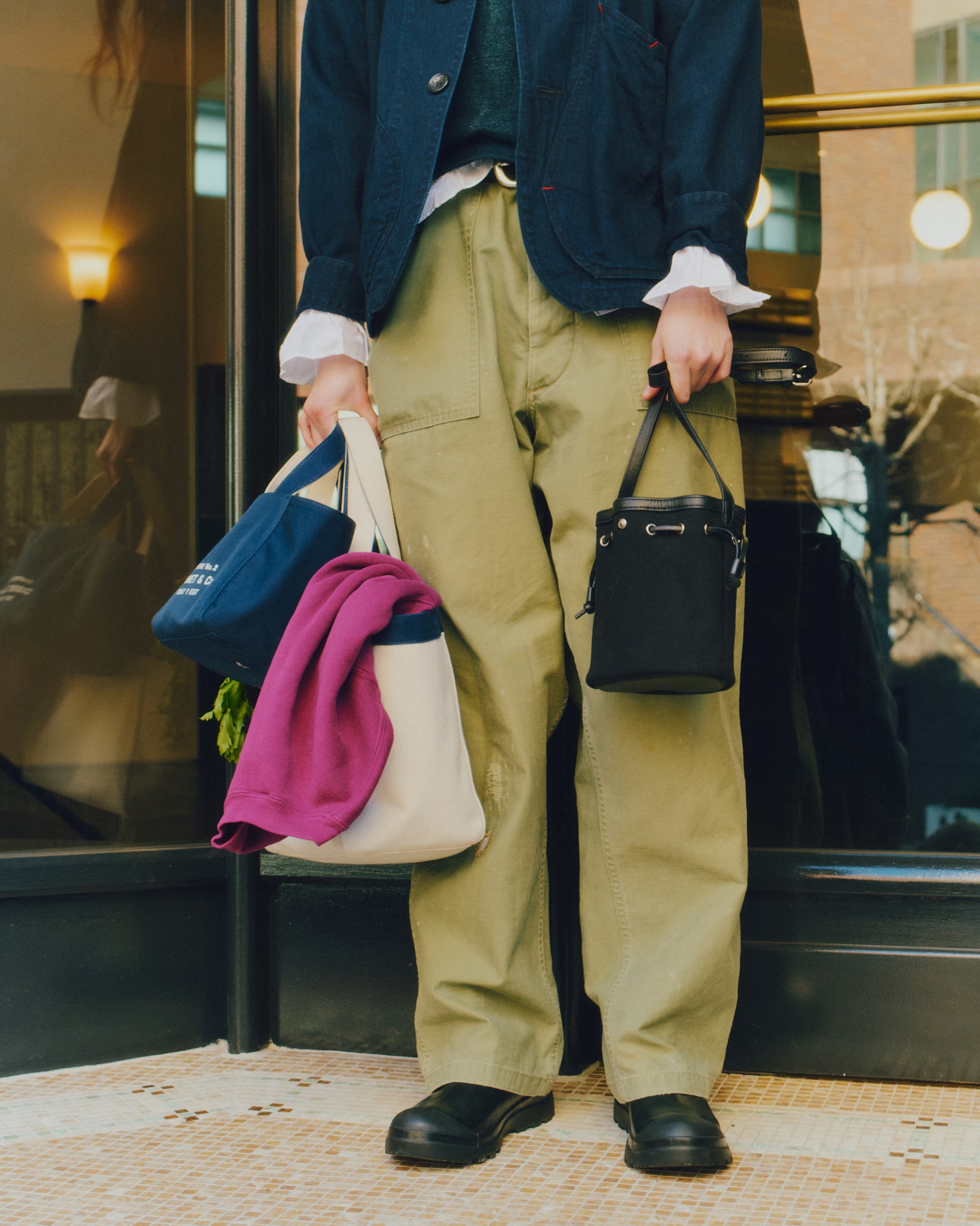 コットンキャンバス素材で作られた CABINET & Co. トートバッグは、リバーシブル仕様で1つのバッグに2つの雰囲気を楽しめます。表面はアイボリー、裏地はネイビーで配色されており、裏返して使用すると異なる印象を演出できます。しっかりとしたキャンバス素材で形が安定しており、外側には小さめの CABINET & Co. ロゴプリント、内側には反転カラーのプリントが施され、どちらの面も完成度の高い仕上がりです。サイズはスモールとラージの2種類で、スモールはトートとして、ラージはショルダーとしてご使用いただけます。