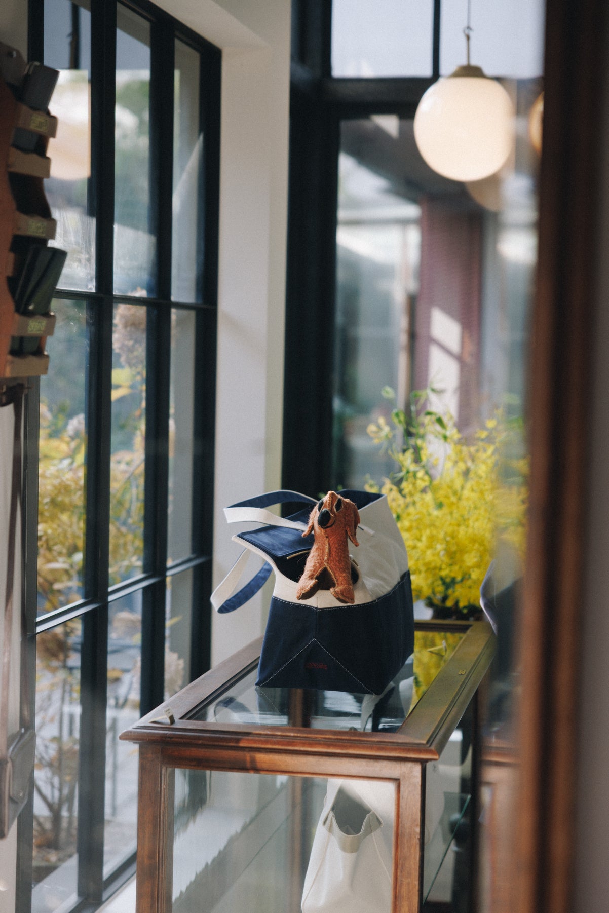 底部のネイビー部分にはワックスコーティングされたキャンバスを使用しており、汚れに強く、バッグの形をしっかり保つための底板は取り外し可能です。