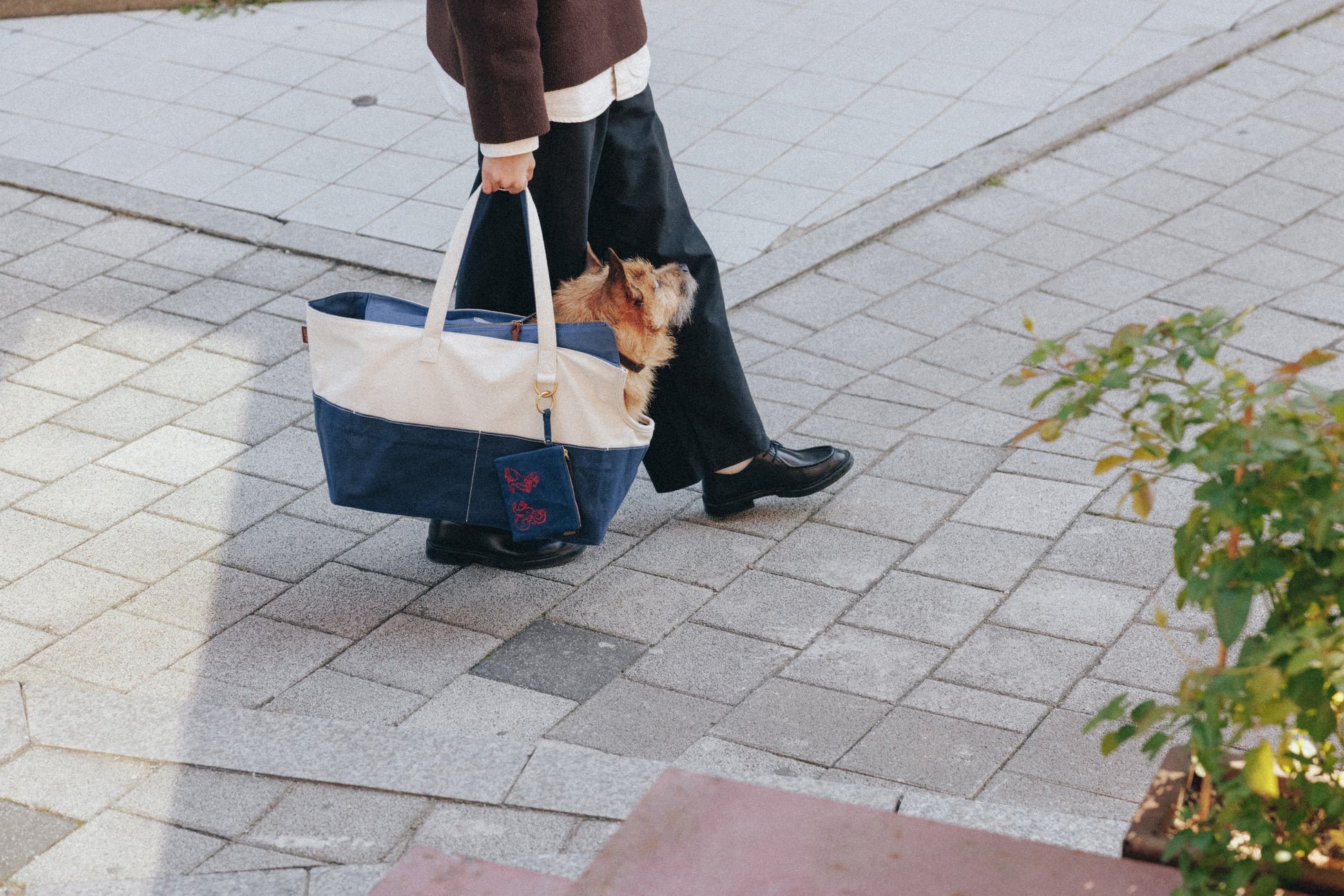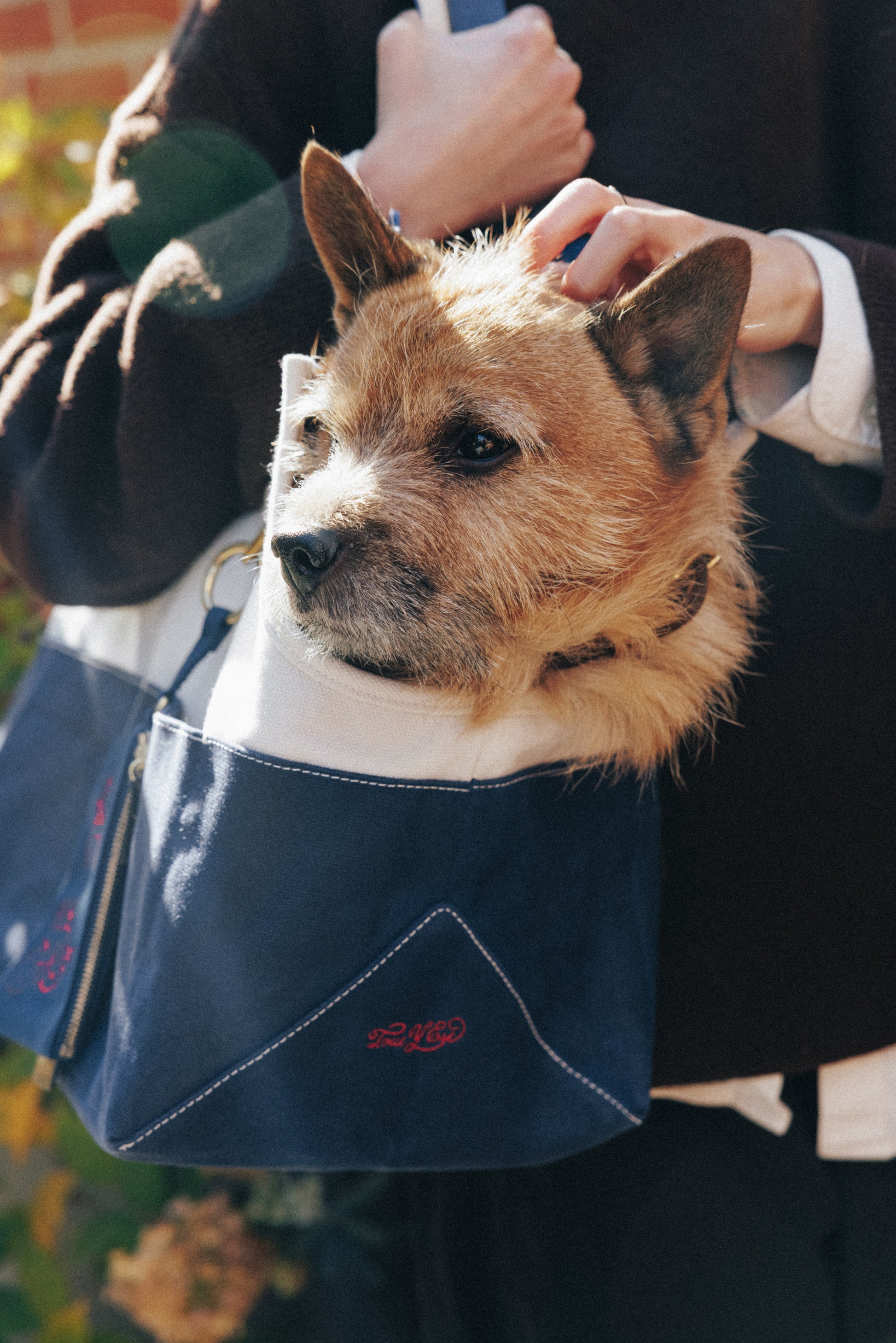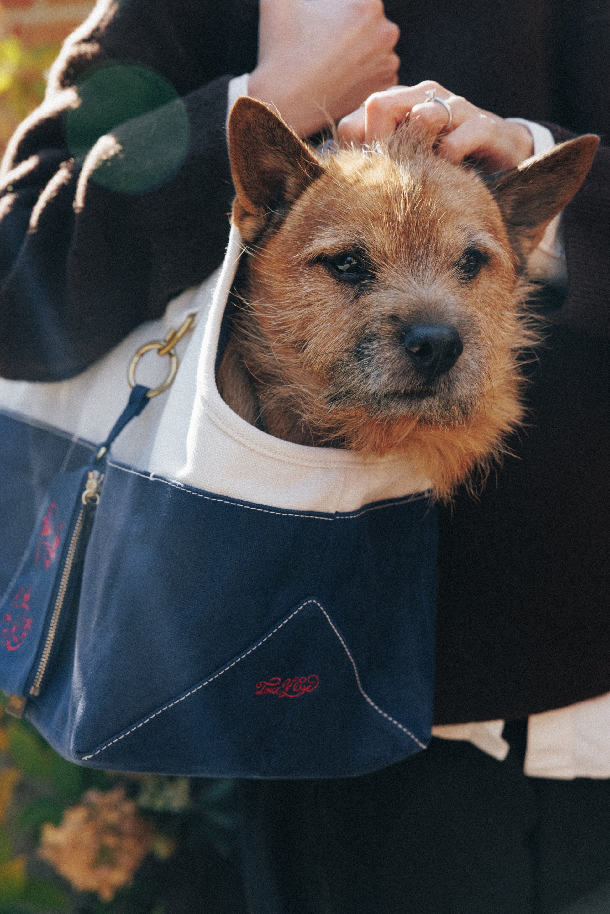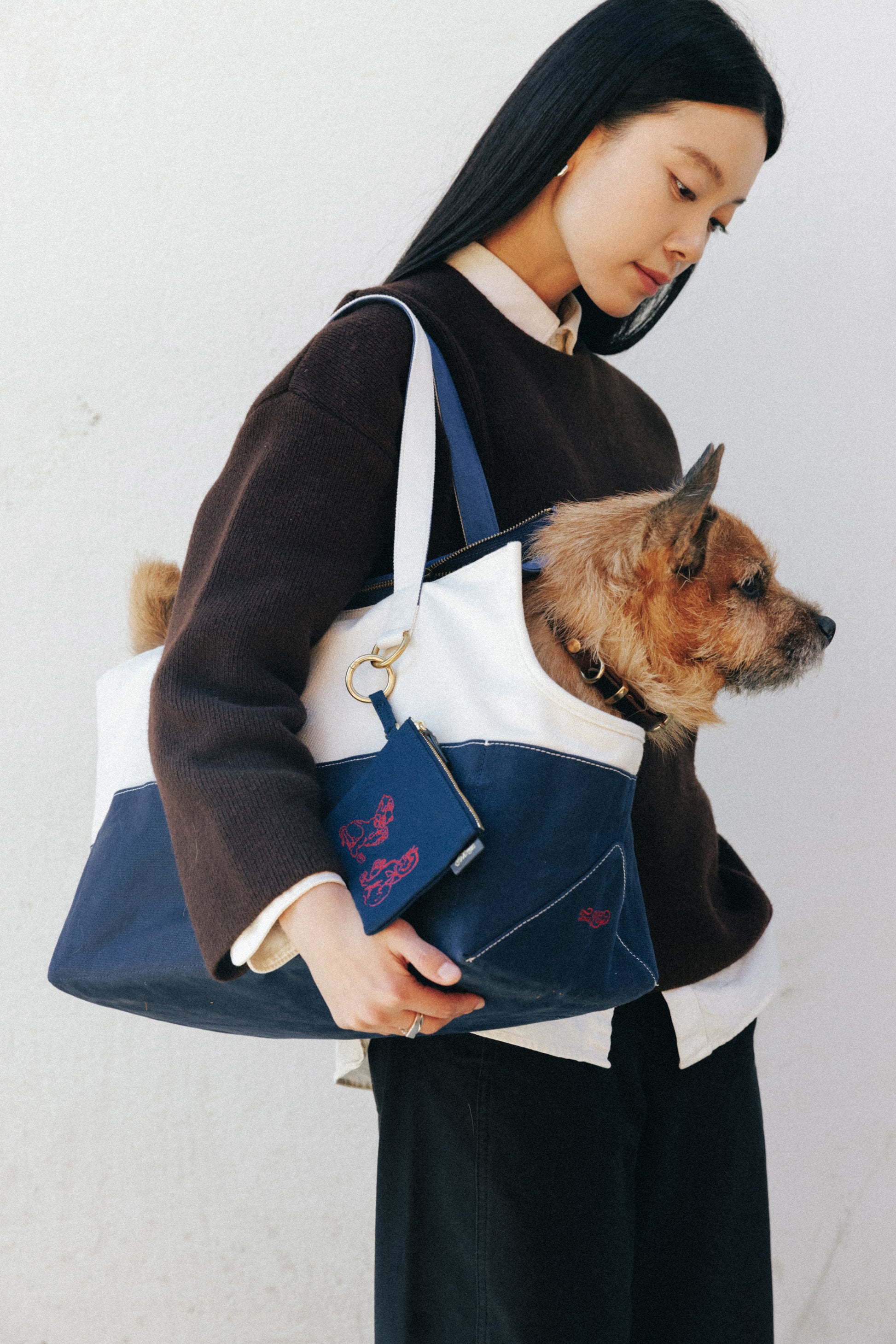 コットンキャンバスとブラスで作られたペット用キャリーバッグです。