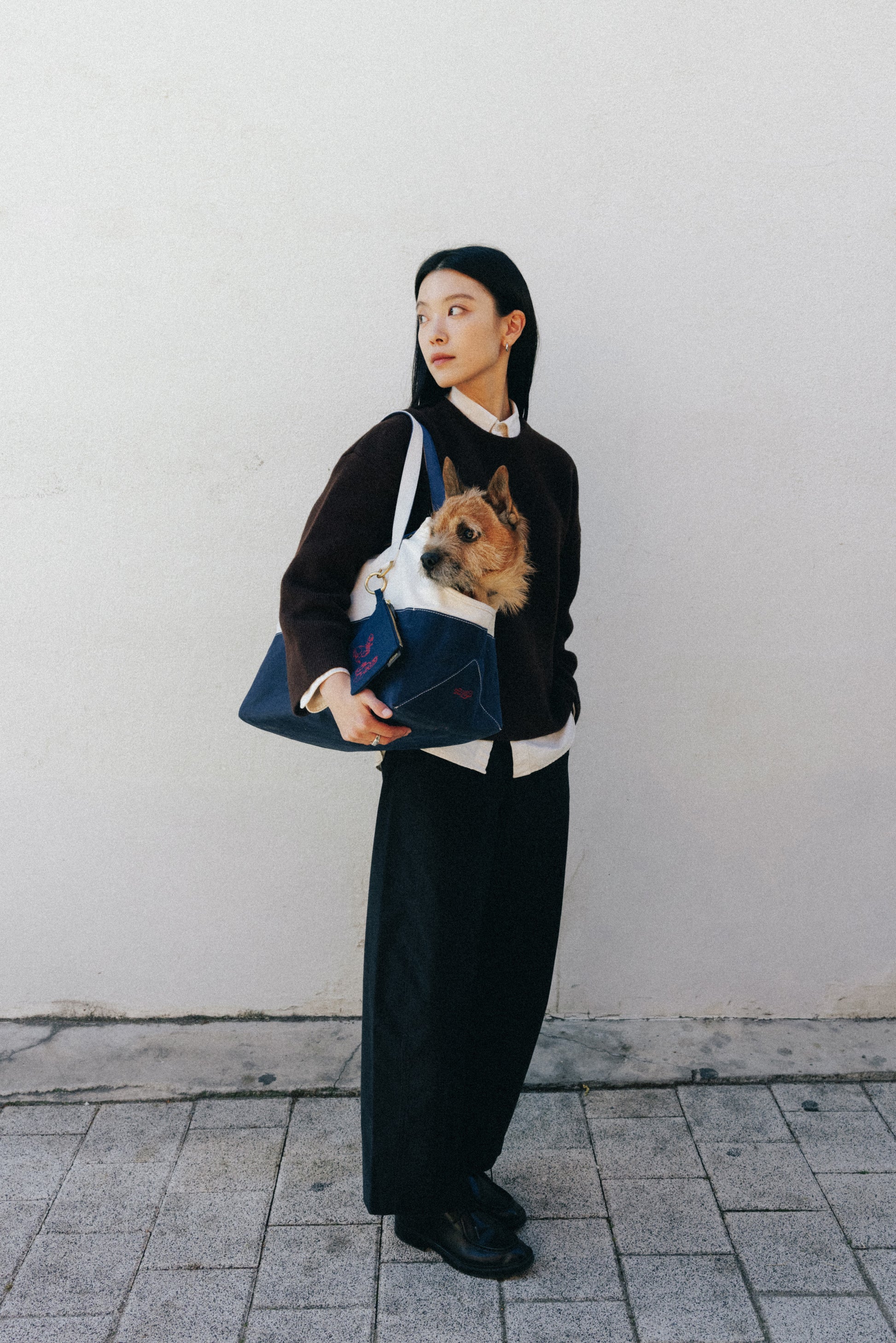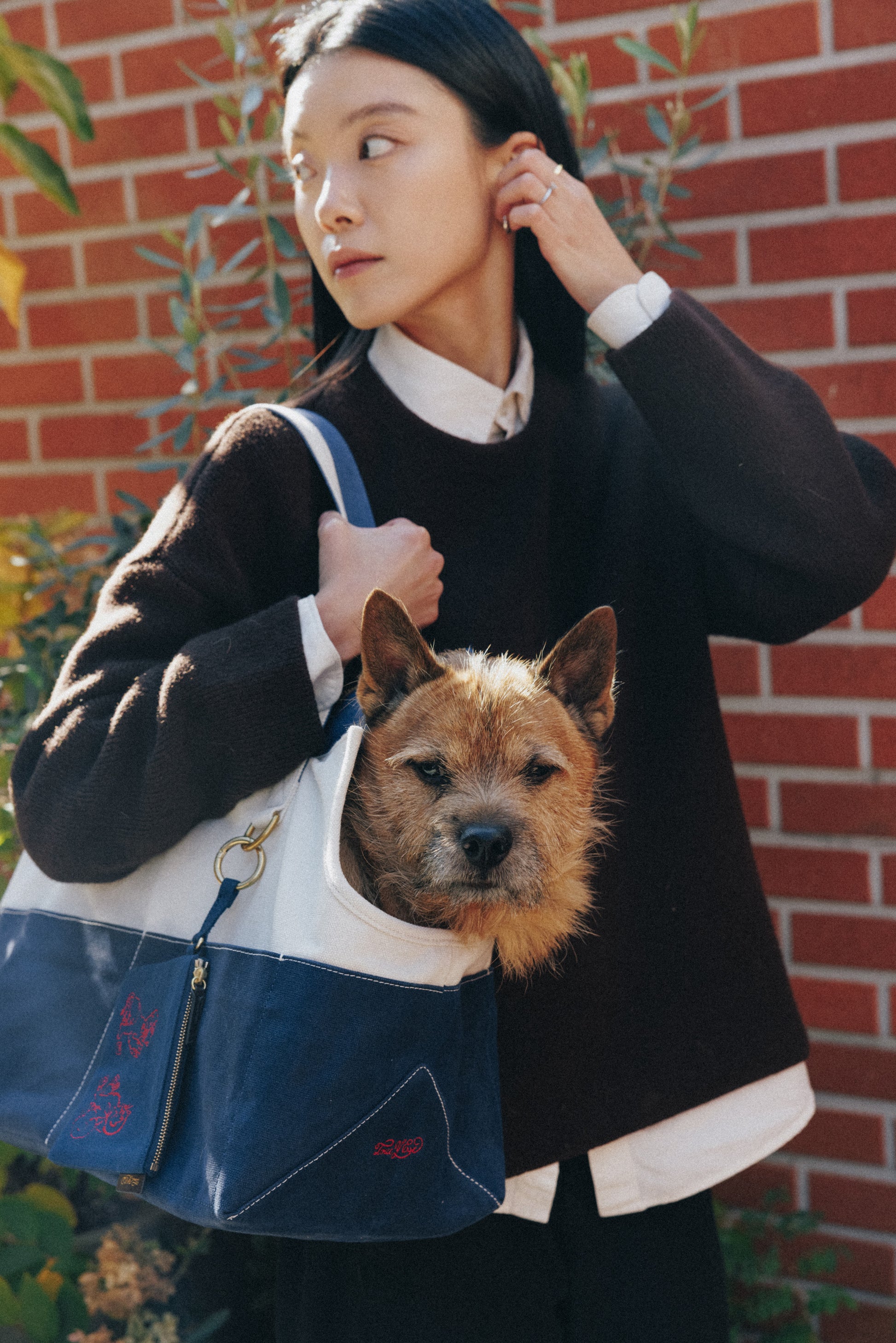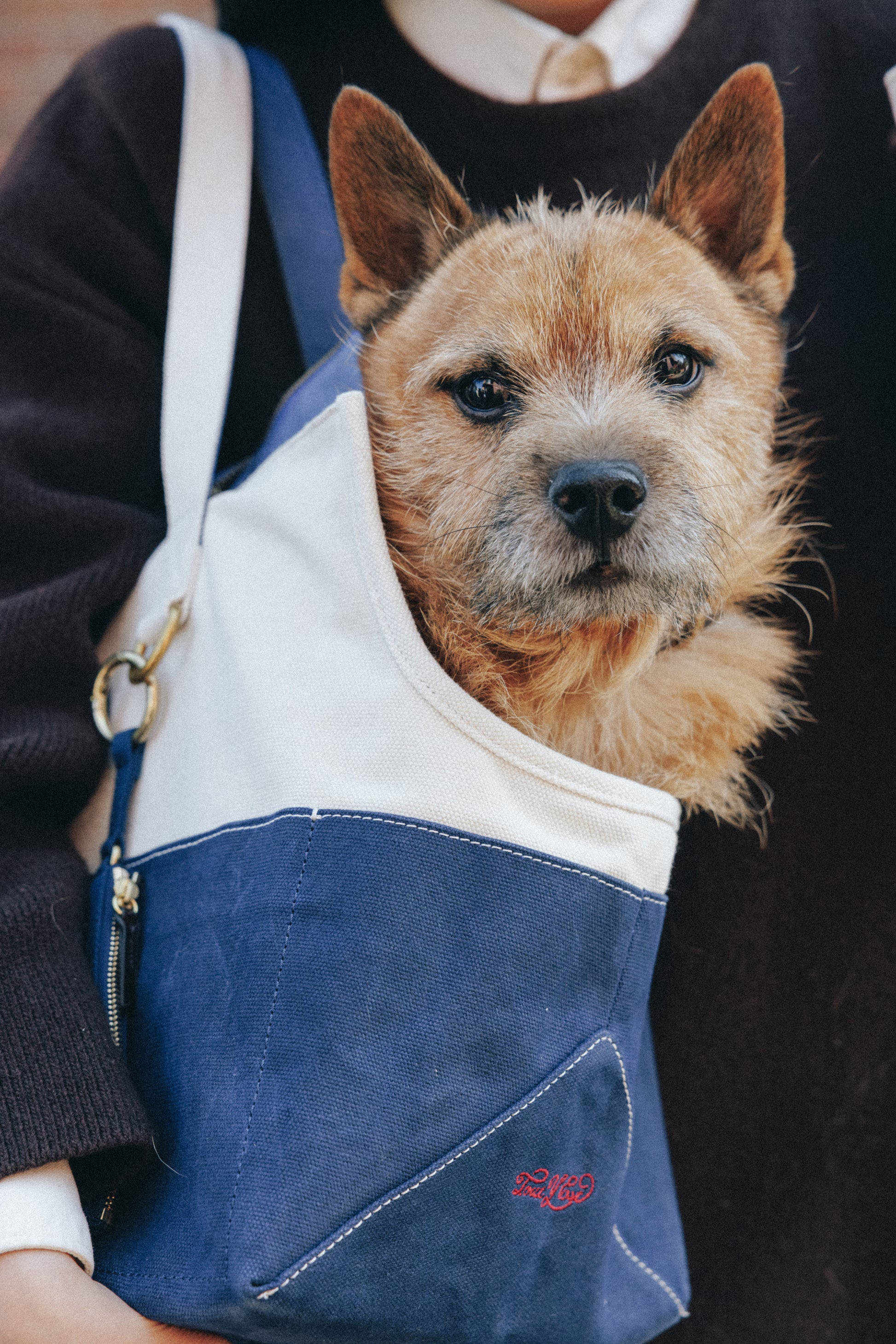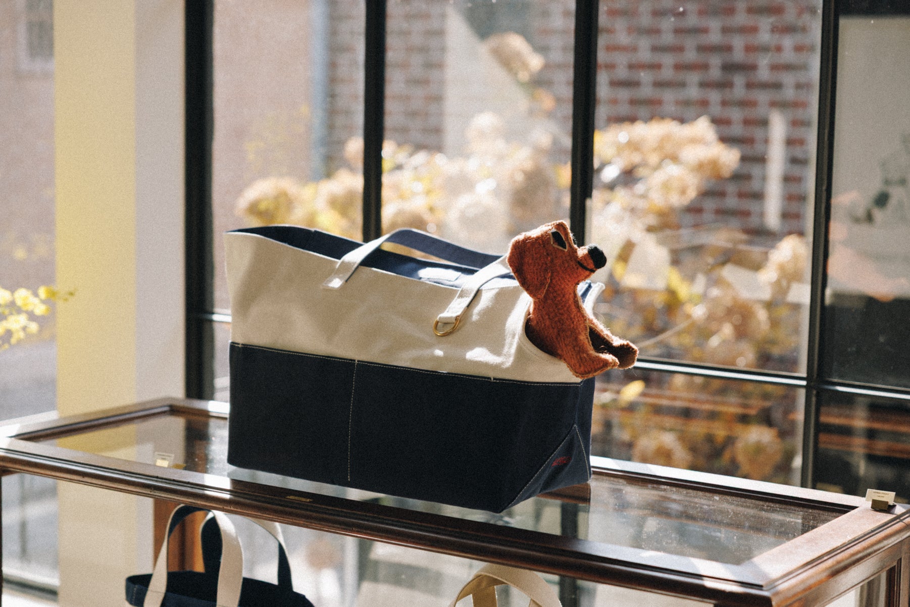 コットンキャンバスとブラスで作られたペット用キャリーバッグです。