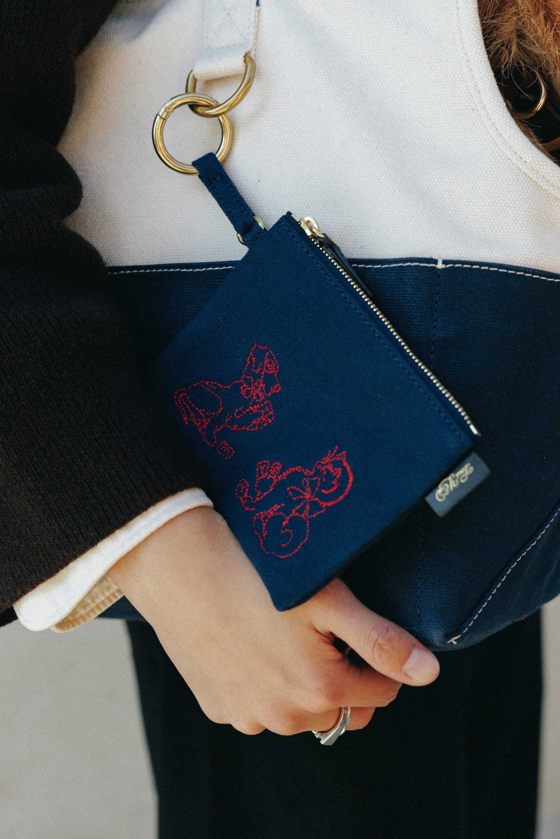 ジッパーカバーの上部にはロゴラベル、側面には「TOUT Y EST」の刺繍と金箔ロゴ入りレザータブがあしらわれています。