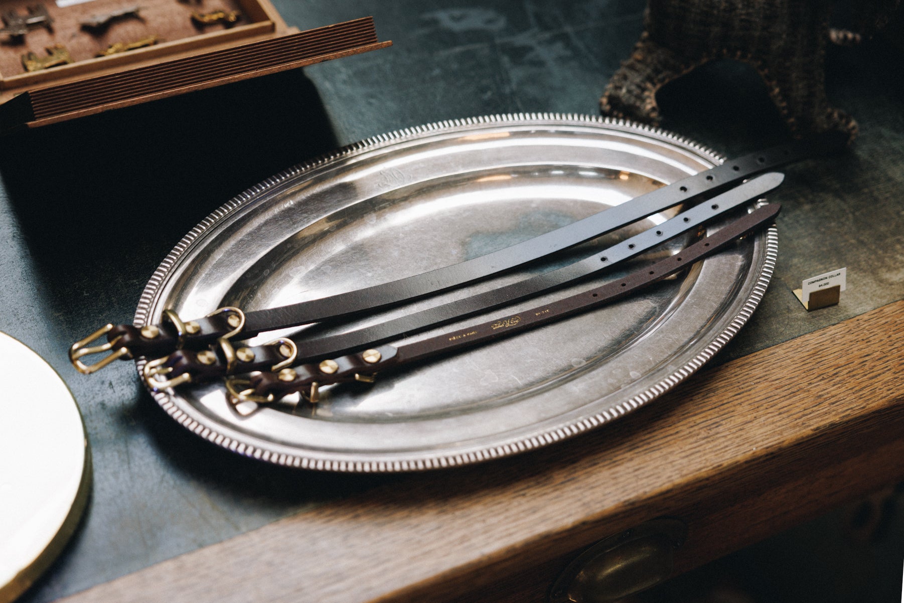 しっかりとしたレザーストラップに真鍮製のバックルとDリングを固定し、耐久性を高めています。