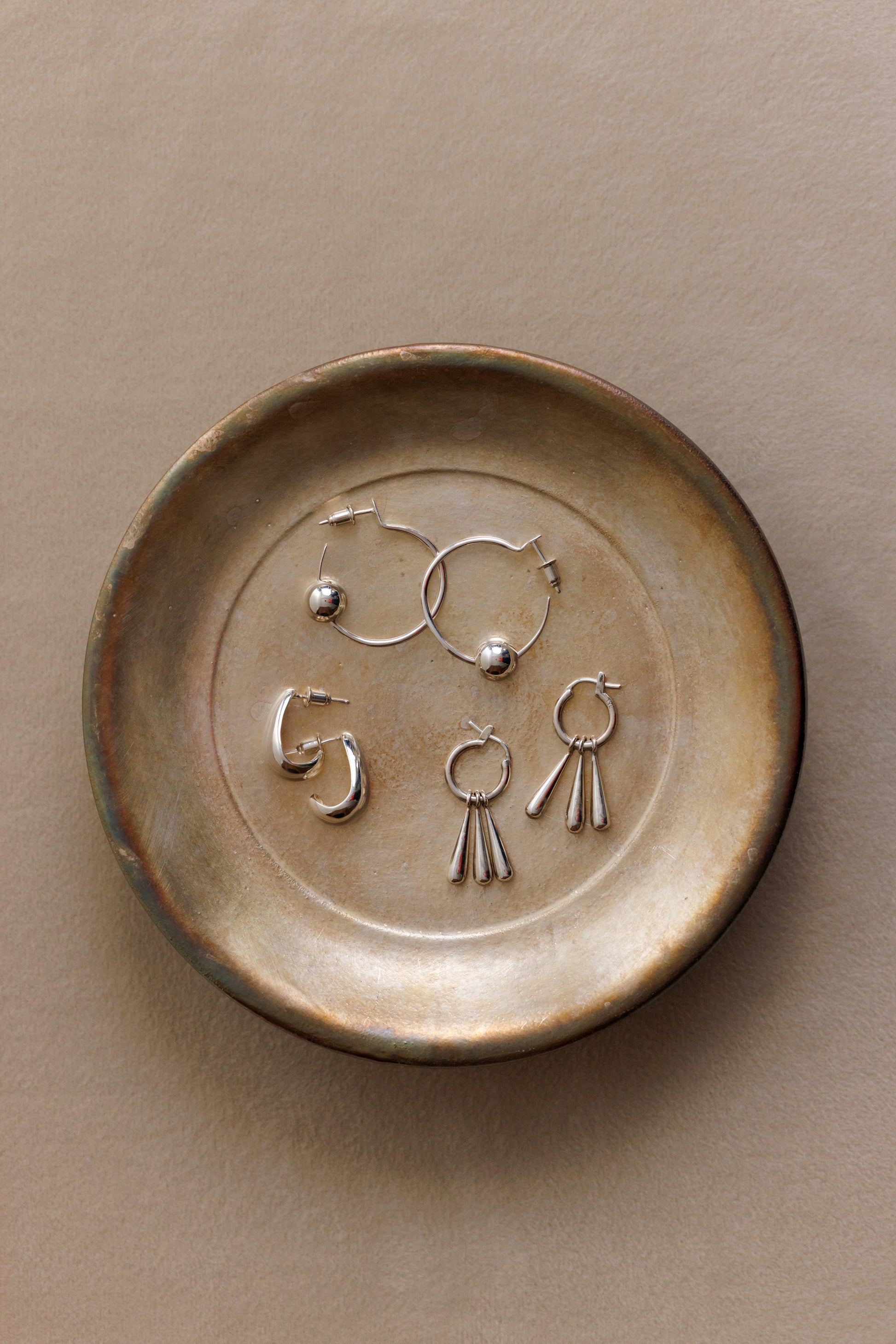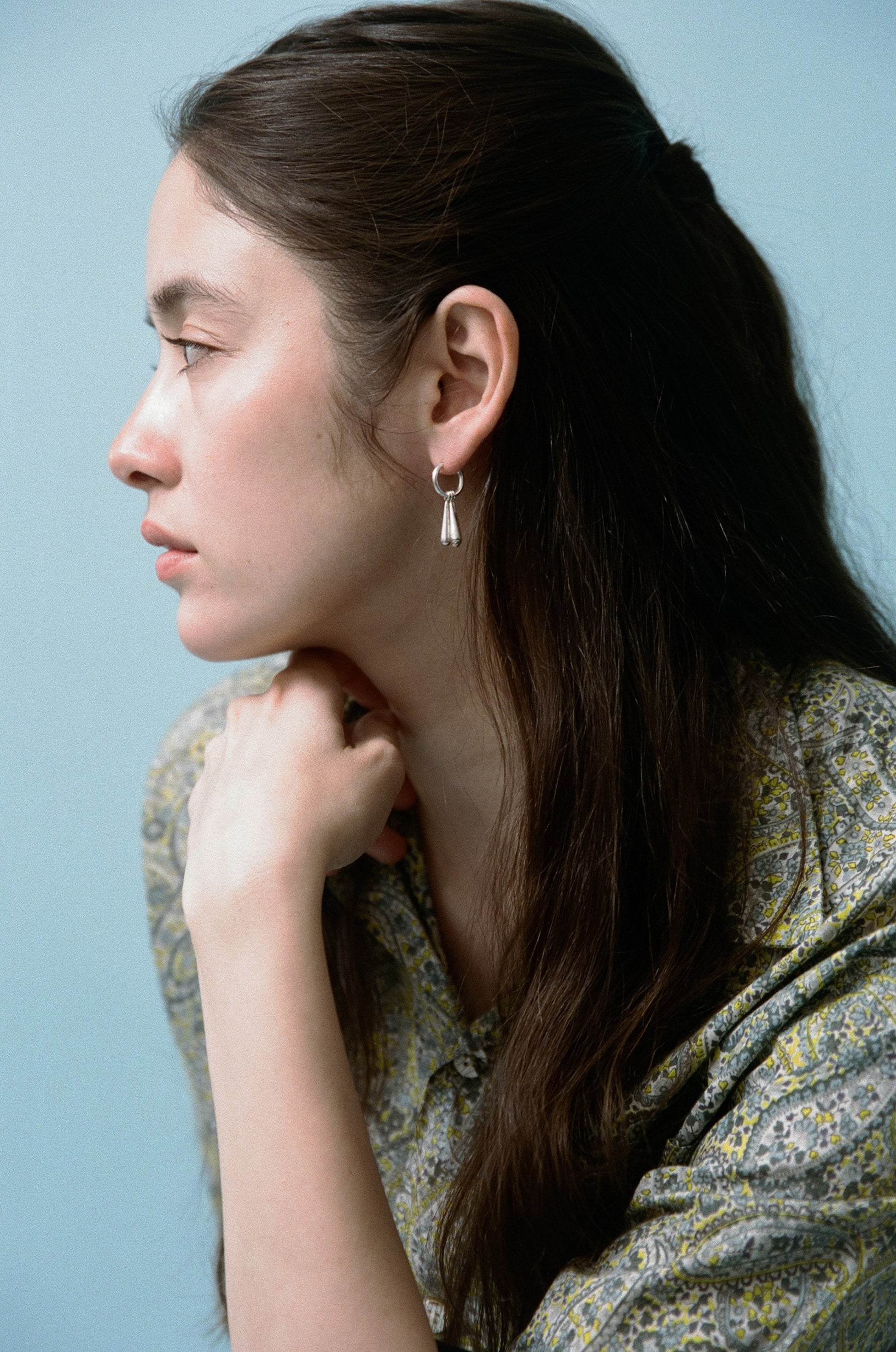 「トリオ・コーヌ イヤリング」は、滑らかに仕上げられた小さなリングに、3つの円錐形ペンダントが連なるドロップイヤリングです。 並んで配置された3つのドロップは自然なリズムを生み出し、見る角度によって異なる表情を見せます。 円錐形のペンダントは丸みを帯びた柔らかなフォルムで仕上げられており、着用時にも違和感なく心地よく馴染みます。 動きに合わせて、シルバー特有のほのかな光沢がさりげなく浮かび上がります。 コンパクトなサイズ感の中に、均整の取れた造形美を込めた「トリオ・コーヌ イヤリング」イヤリングは、熟練した職人の手により繊細かつ丁寧に仕上げられています。