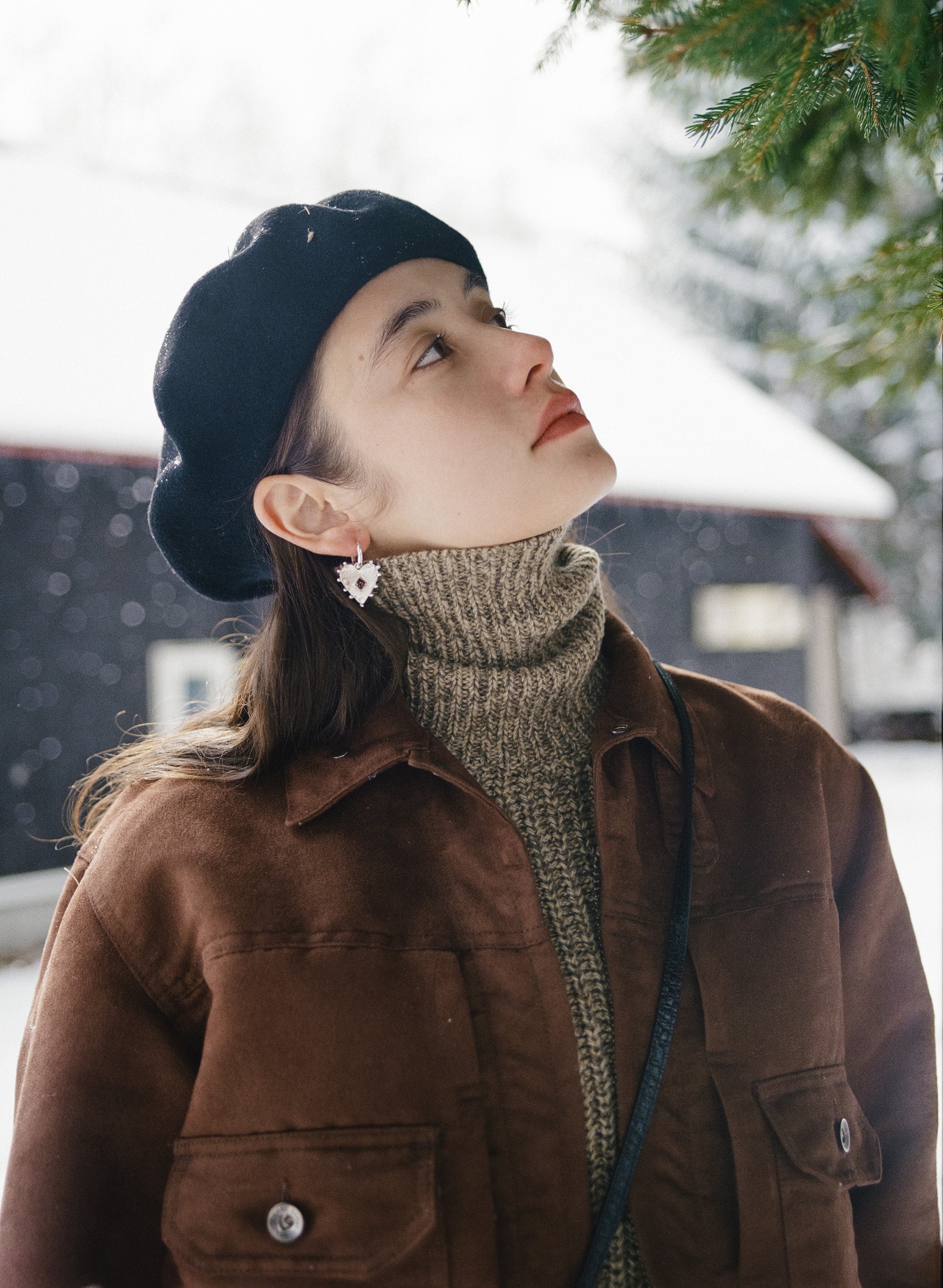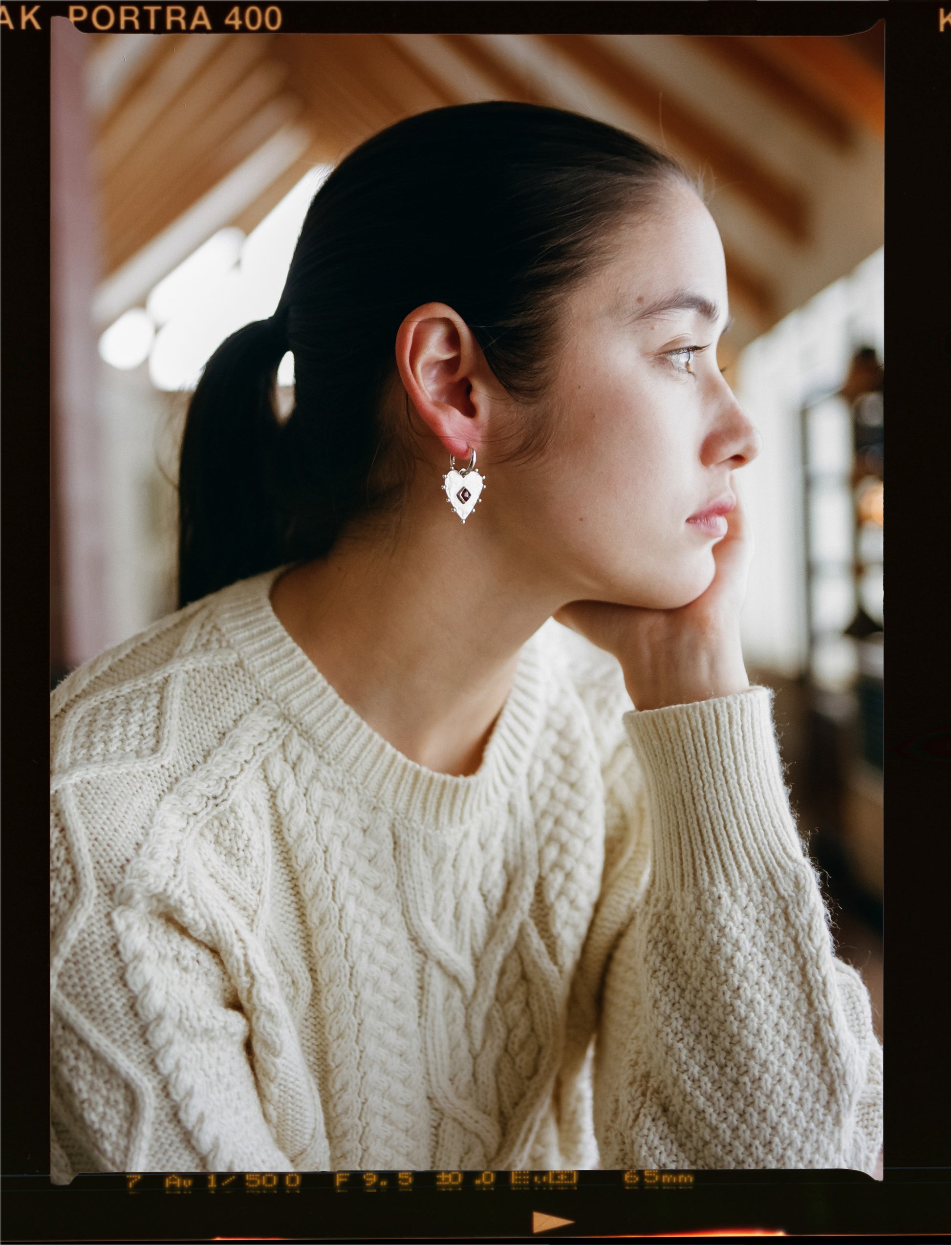 左右が異なる独創的なデザインが引き立つハート&パールアンバランスイヤリングはシルバー、淡水パール、ロードルライトガーネットの3つの素材で作られたハンドメイド製品です。心を象徴するハート型のシルバーチャームは、柔らかな曲線と繊細なディテールが加わり立体的なシルエットを完成し、中央はキラキラとしたロドライトで飾りました。もう一方は自然な形の淡水真珠で神秘的な紫色の光沢を保持しています。ハンドメイドならではの定性とディテールが詰まったハートと真珠の装飾は独特の存在感を完成します。