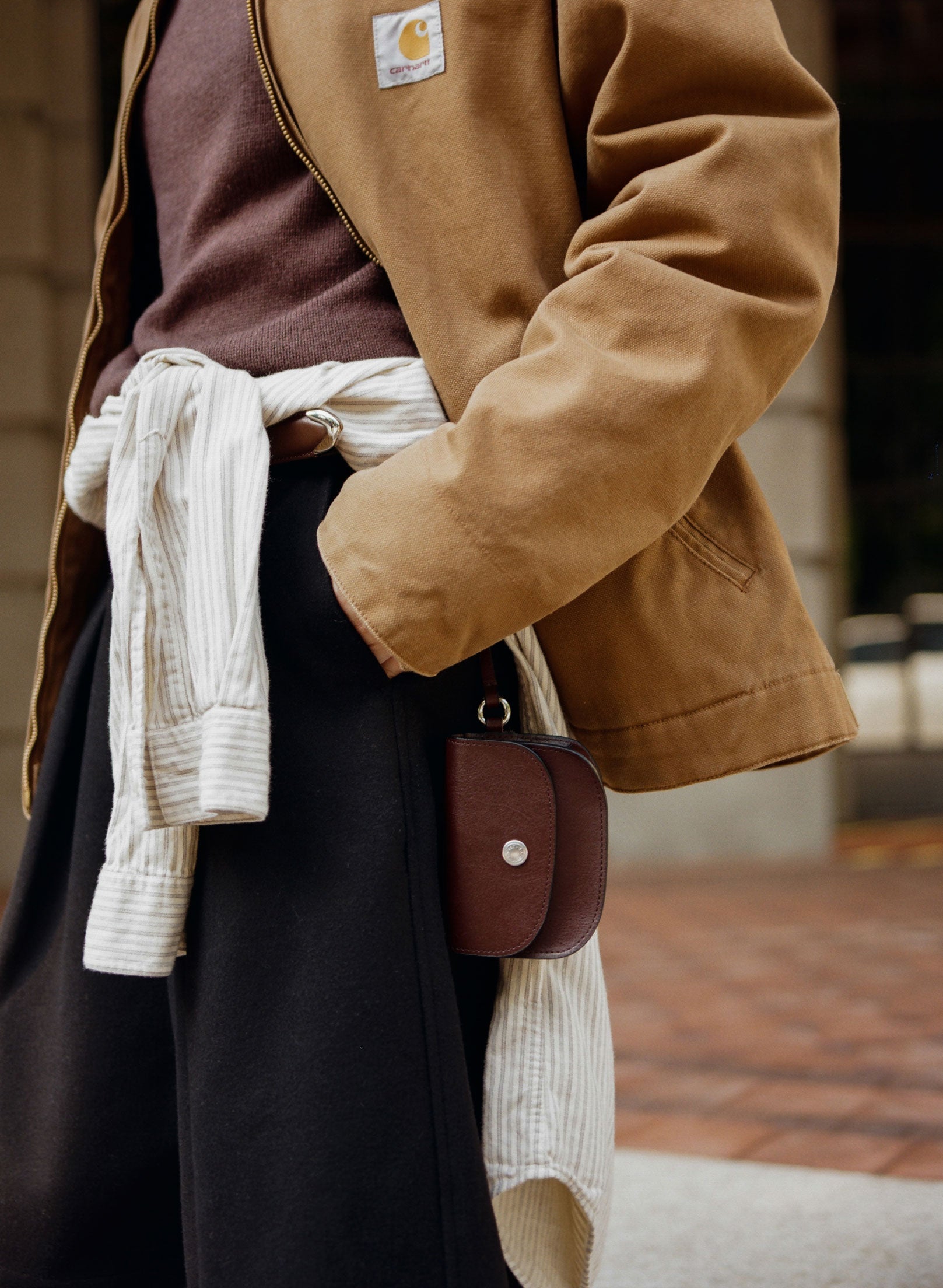 小さな持ち物をきれいに保管できるキーリングタイプのレザーポーチです。 Oリングとストラップが付いているのでバッグに簡単に取り付けることができ、短い外出時には服にかけて手軽に使うこともできます。 リップバーム、エアポッズ、クレジットカードなど、よく使う持ち物を保管するのに適したサイズです。 オイル加工された柔らかなツートンレザーは時間とともにヴィンテージ感をプラスし、より魅力的になっていきます。 前面のスナップボタンには陰刻でブランドロゴが刻まれており、内部には銀箔ロゴと'small things'シグネチャーラベルが貼られています。