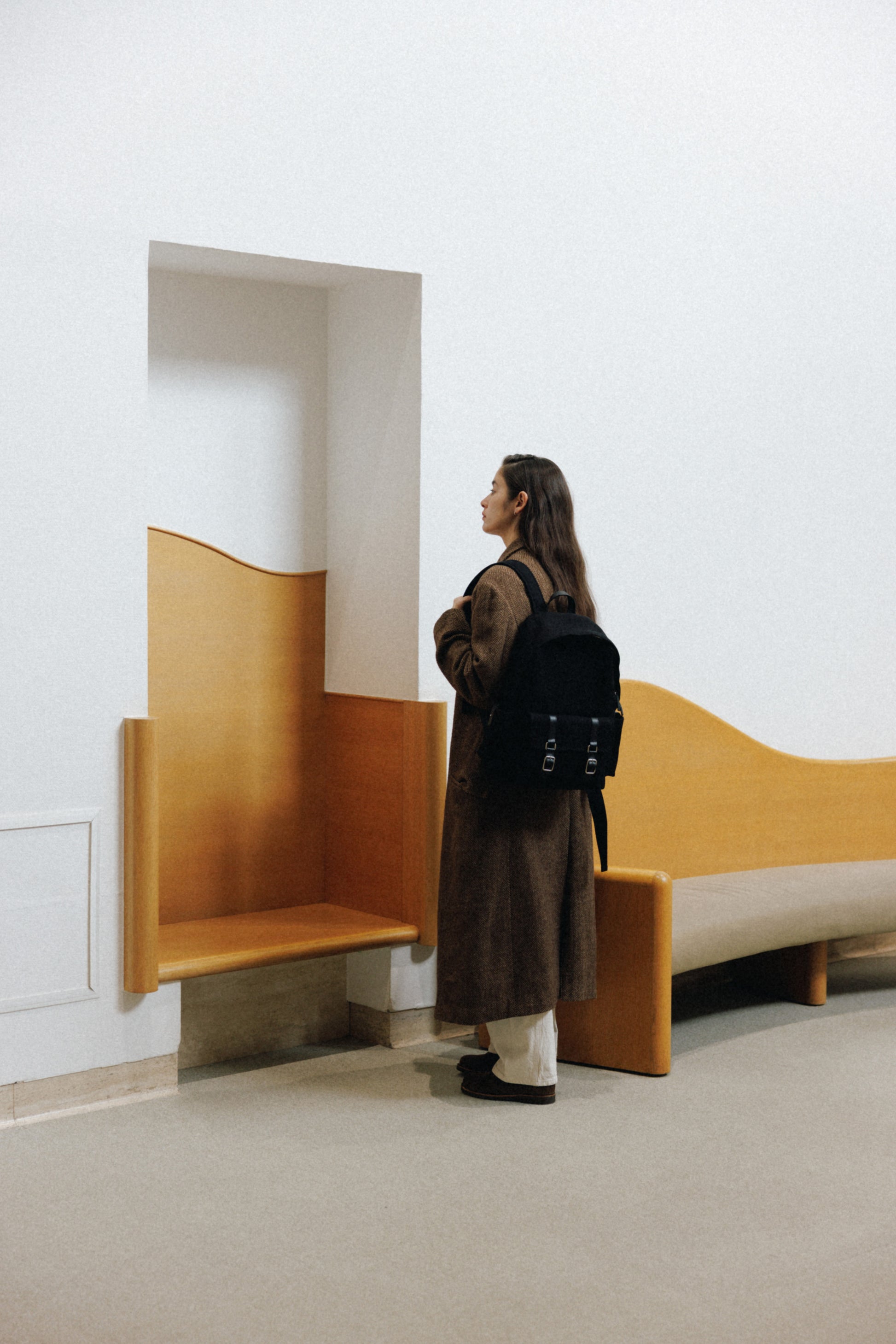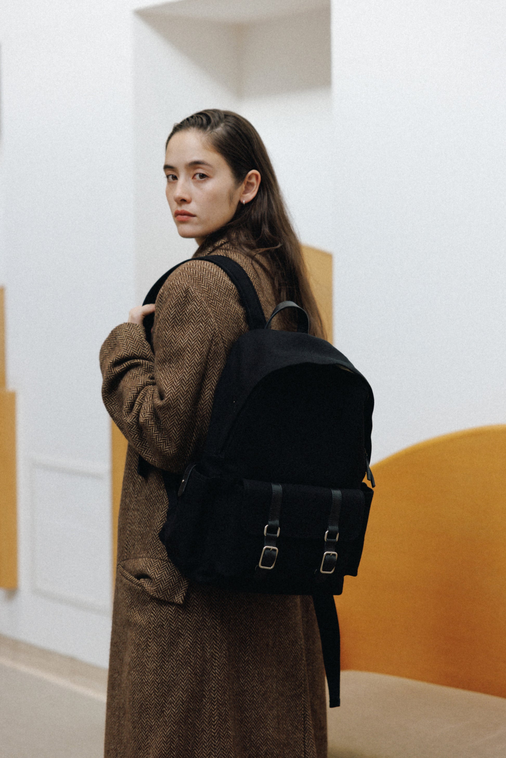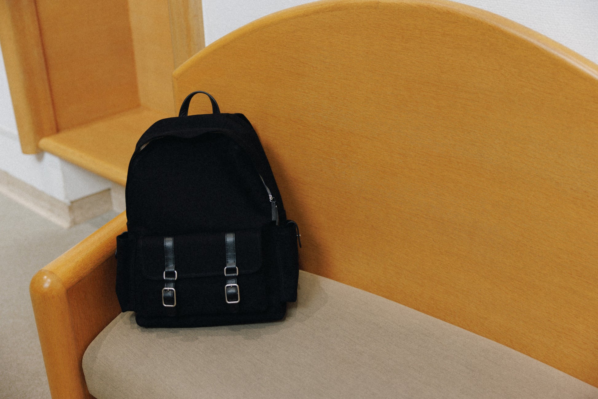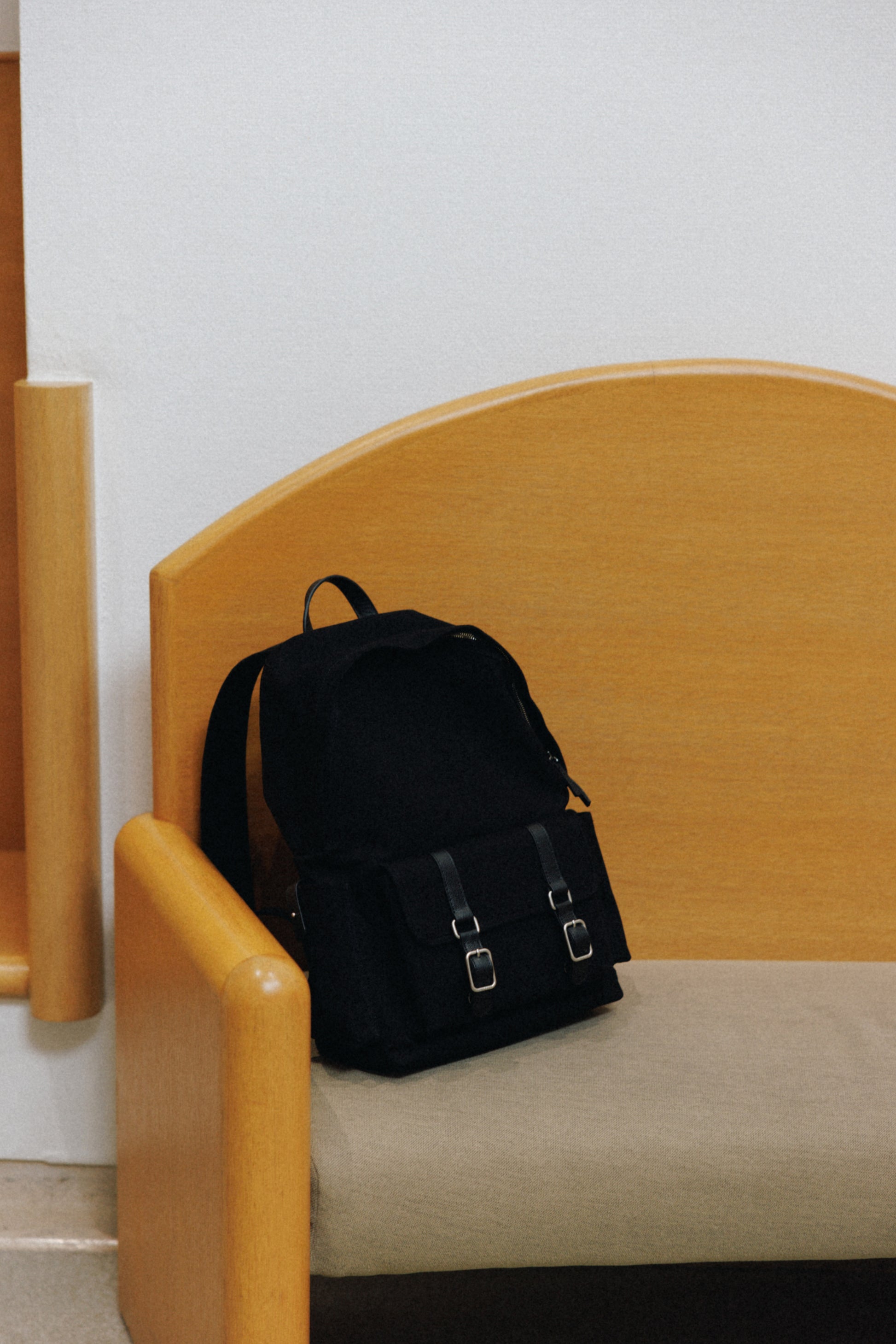 ブートシリーズのディテールを基に仕上げた、バックパックバージョンです。コットンキャンバスに部分的に牛革を組み合わせることで、全体に安定感のある構造を実現しました。フロントにはシリーズを象徴するバックルポケットを配し、両サイドには小物の収納に便利なポケットを備え、実用性を高めています。メイン収納部はジッパー仕様で、内側にはレザートリミングを施したジッパーポケットを含み、すっきりと整理して収納できます。ショルダーストラップは十分な厚みを持たせ、着用時の負担を軽減し、トップには手持ちしやすいレザーハンドルをあしらいました。