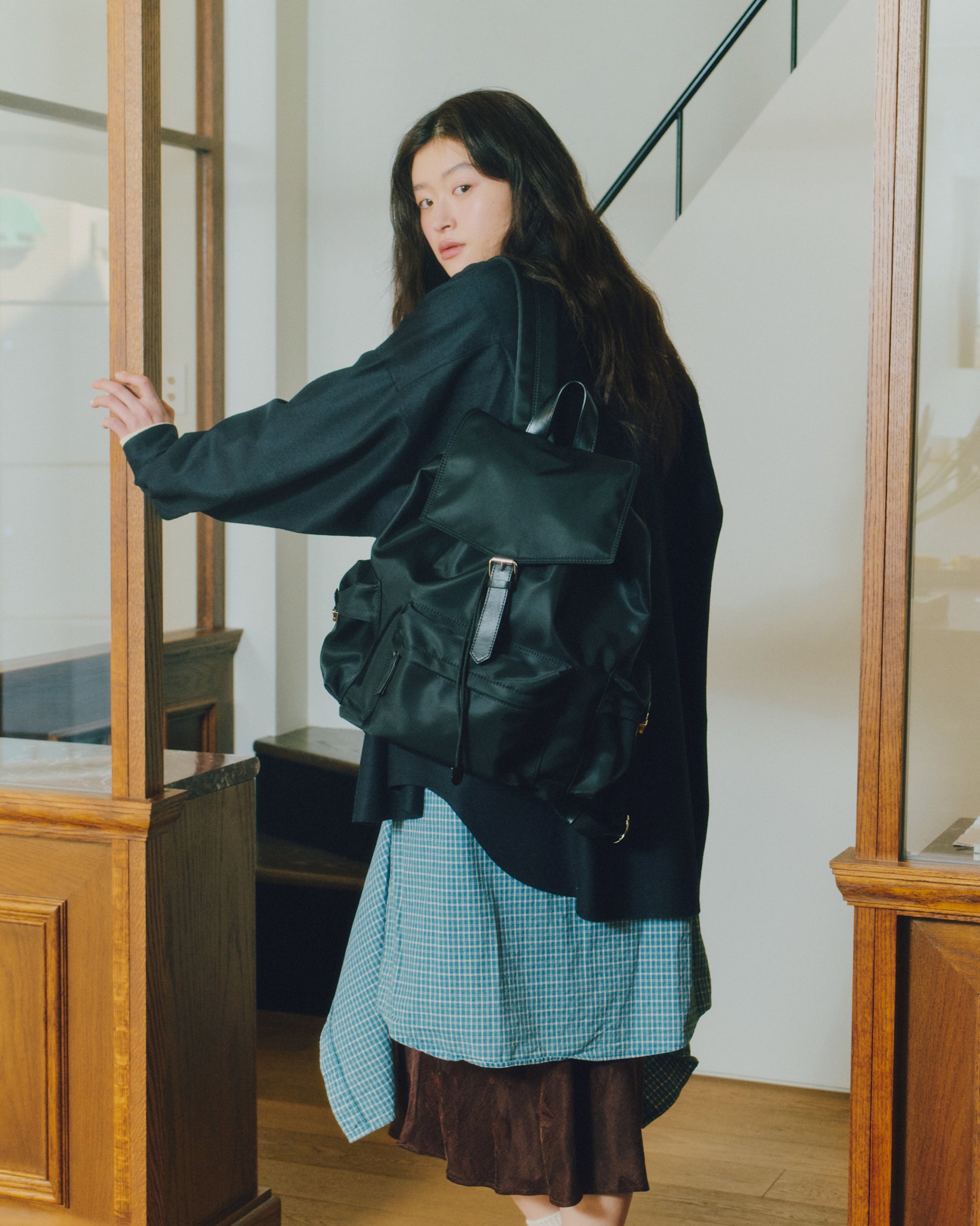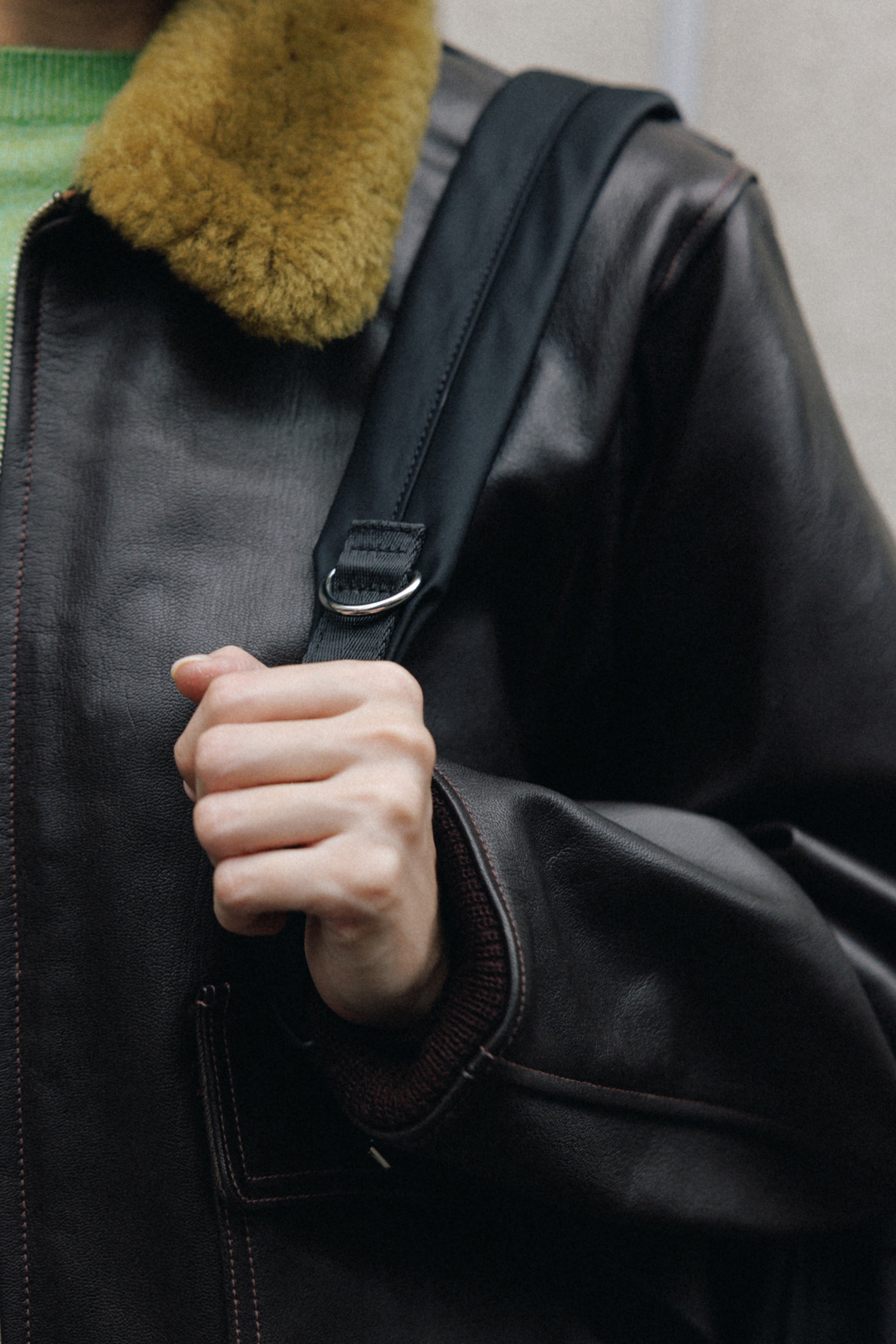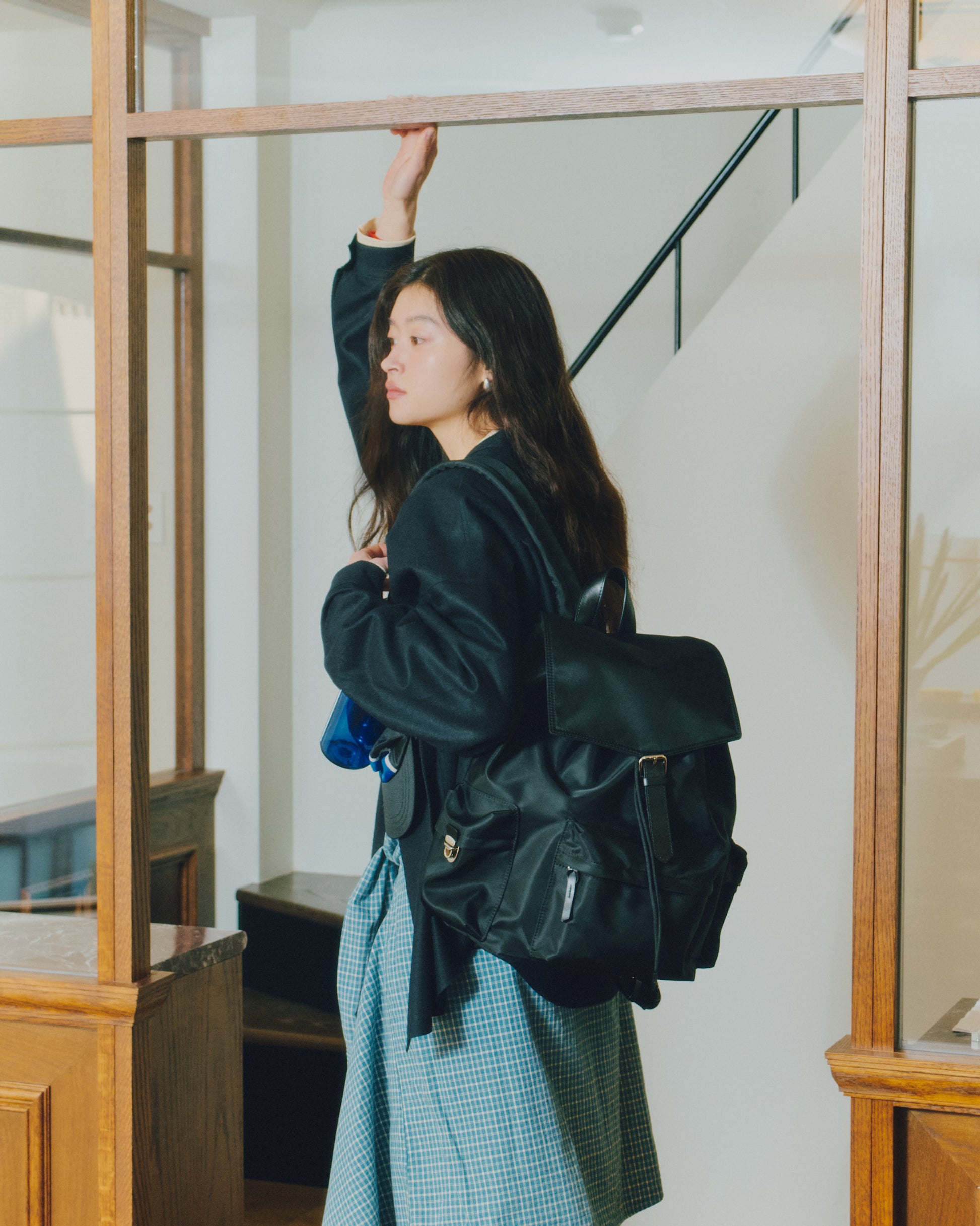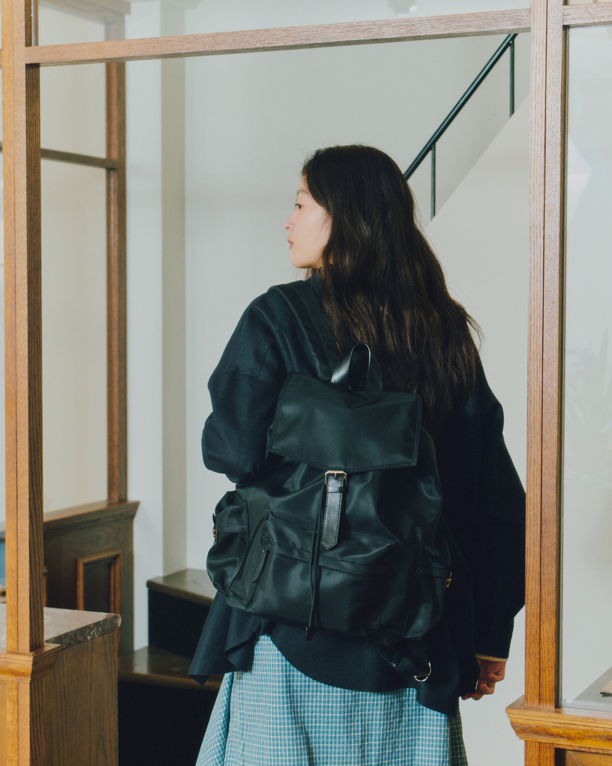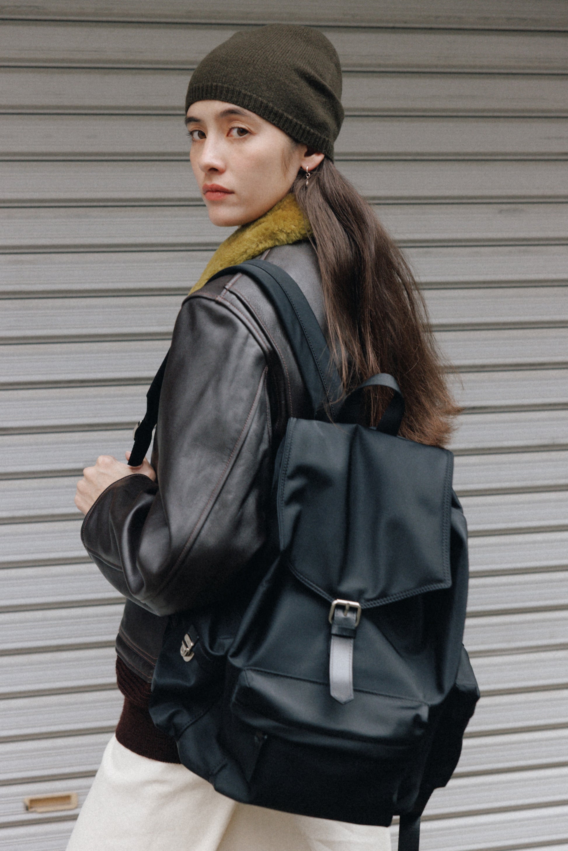 背面とショルダーストラップにはパッドを入れて負担を軽減し、上部にはシーンに応じて手持ちできるようレザーハンドルをあしらっています。