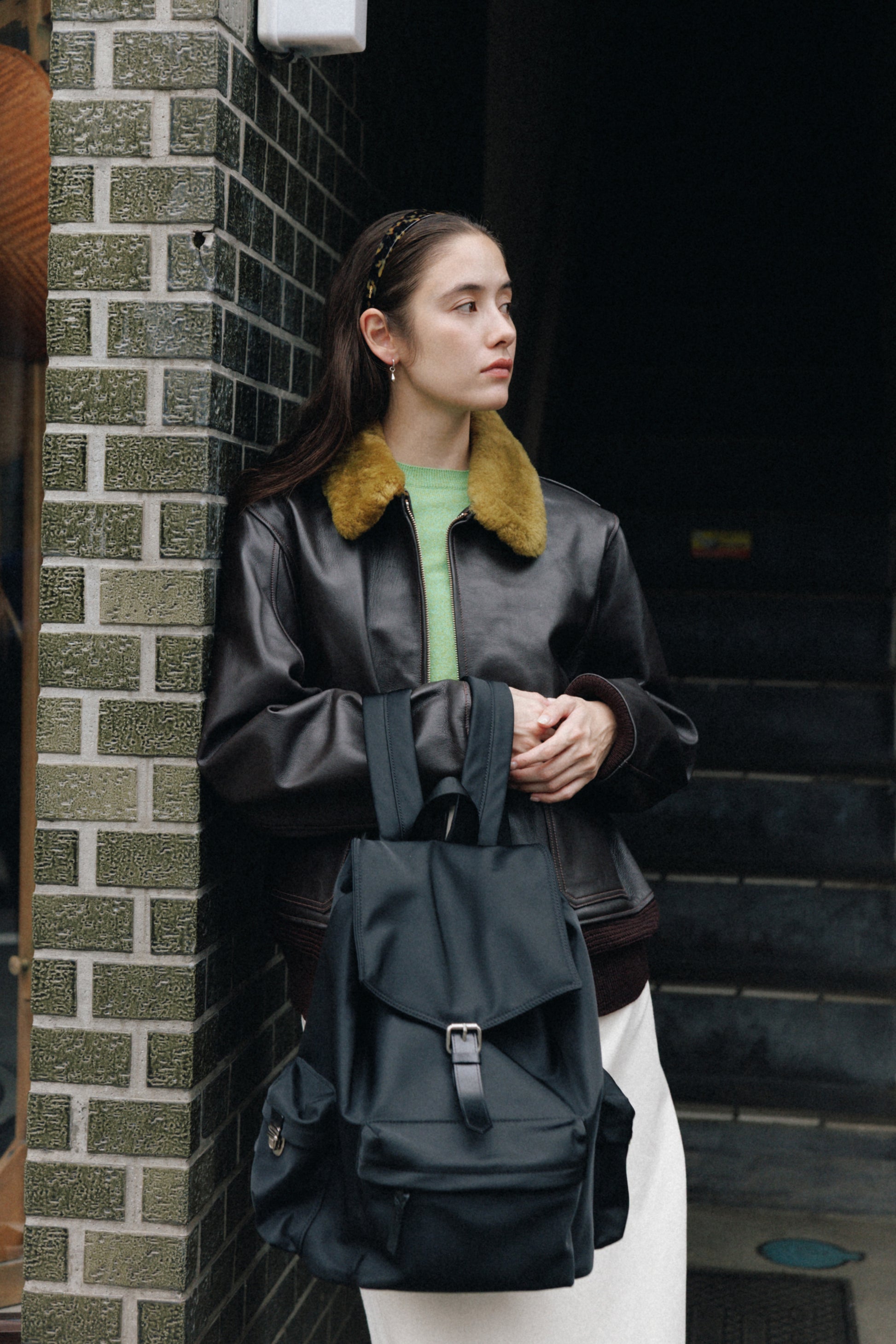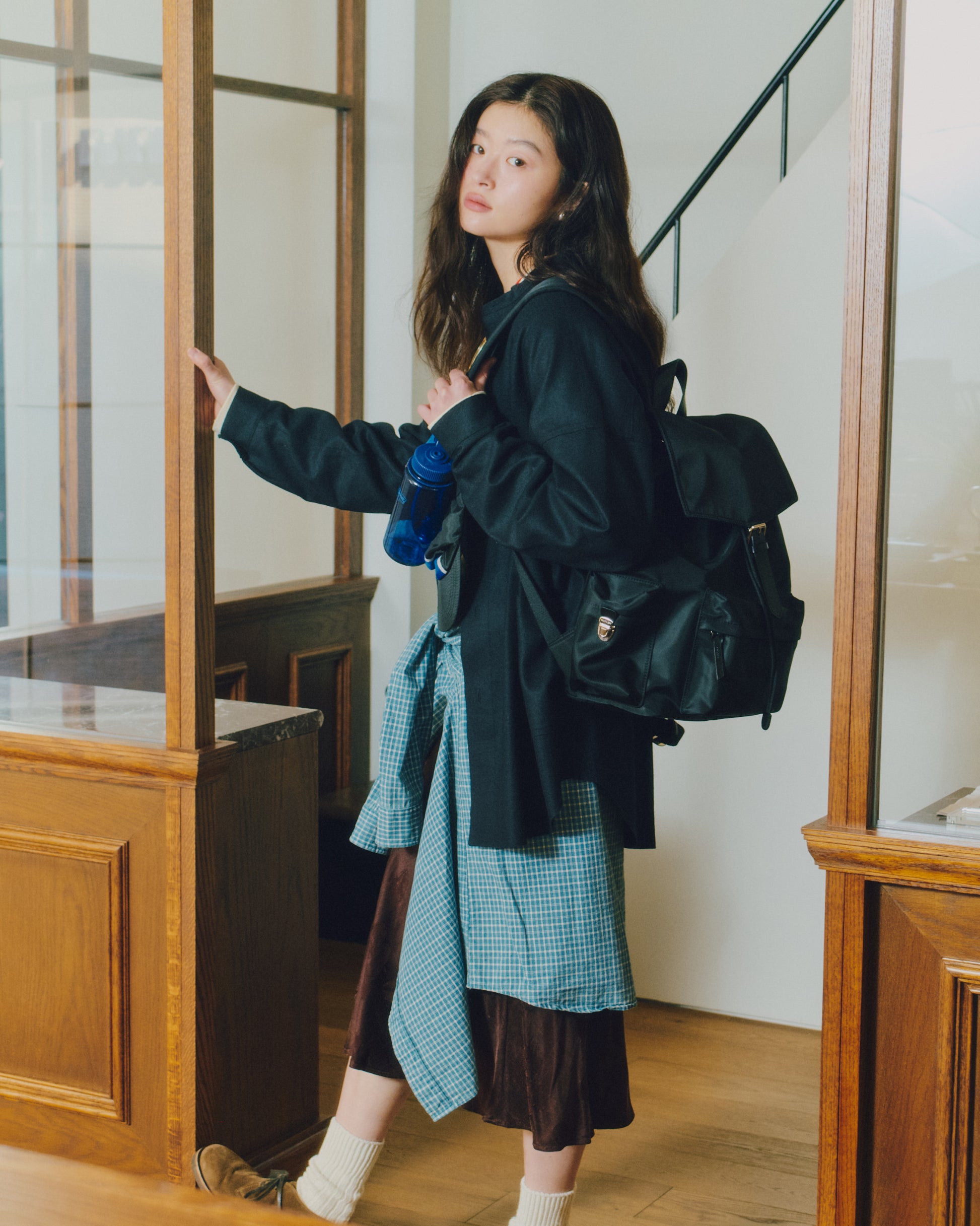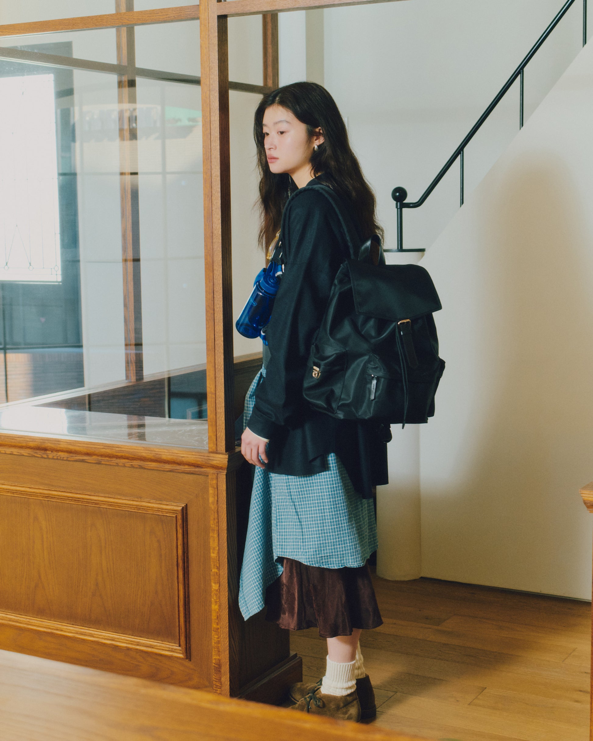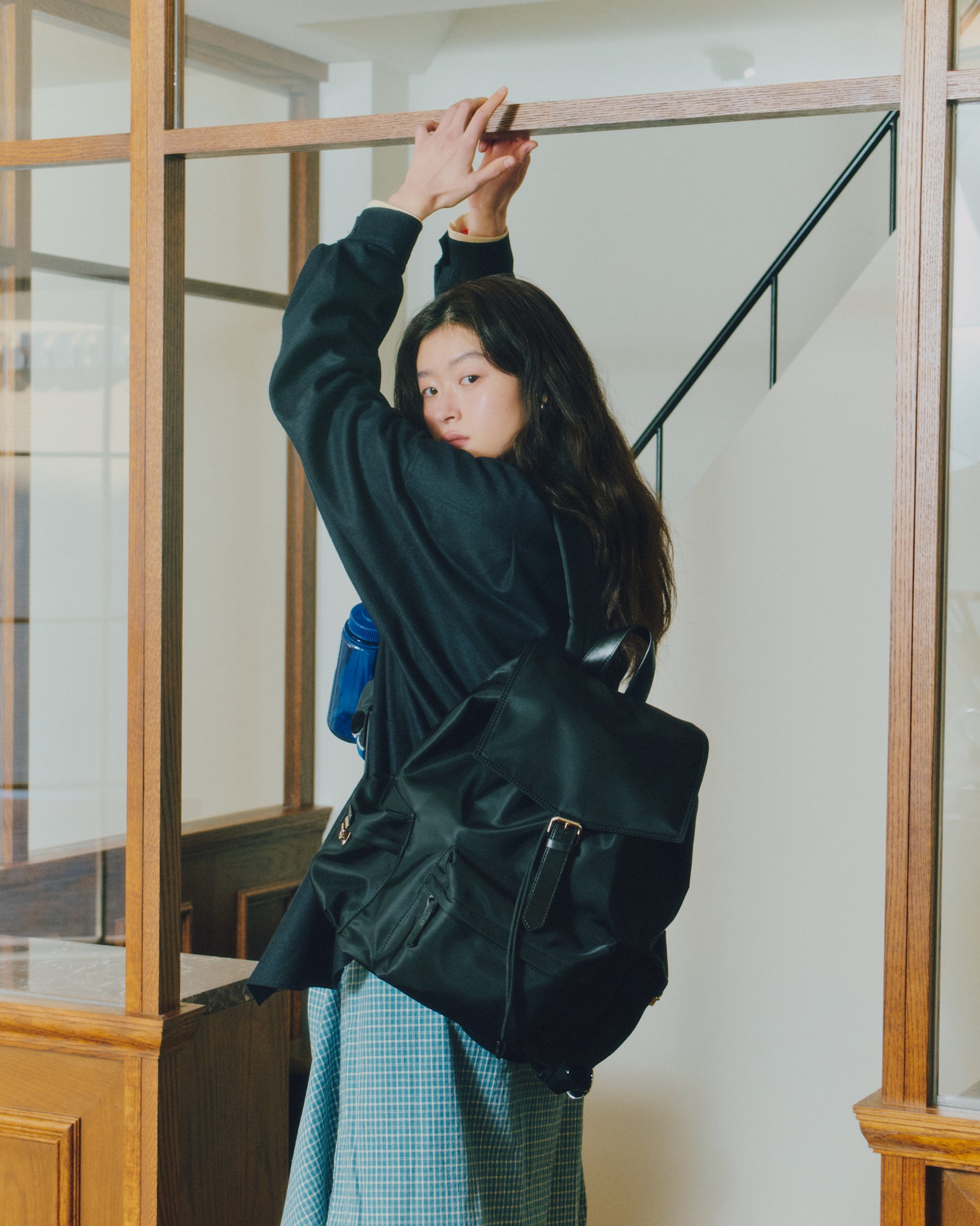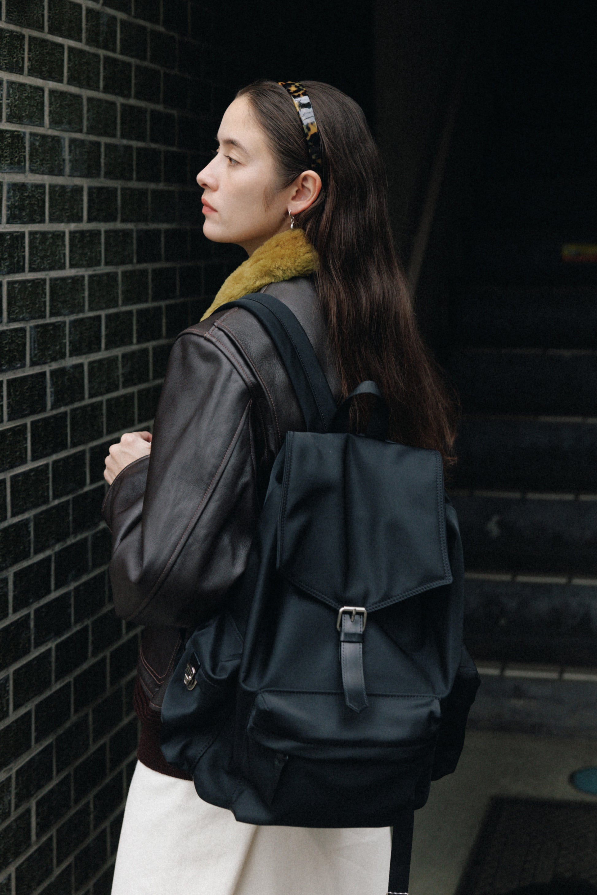背面とショルダーストラップにはパッドを入れて負担を軽減し、上部にはシーンに応じて手持ちできるようレザーハンドルをあしらっています。
