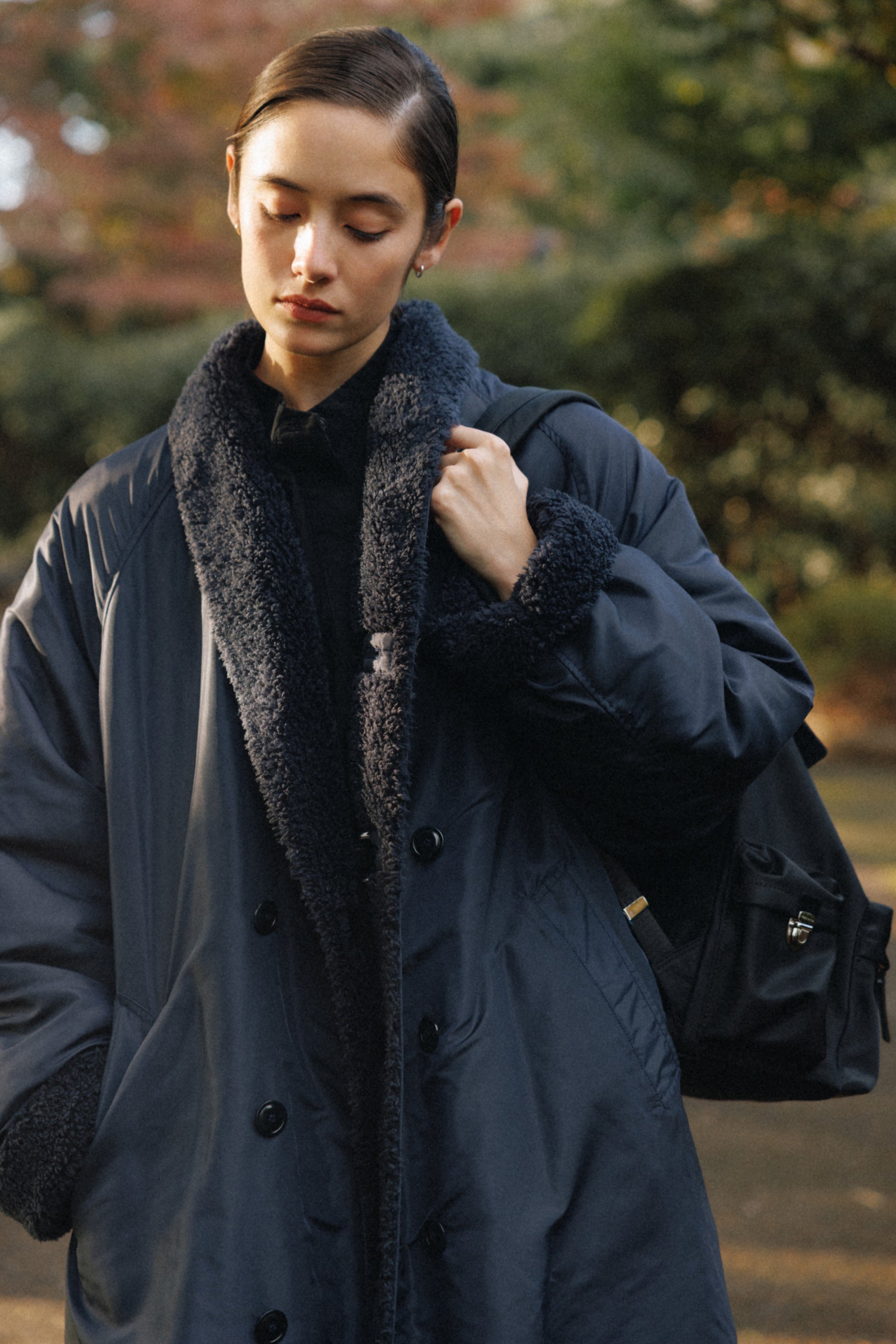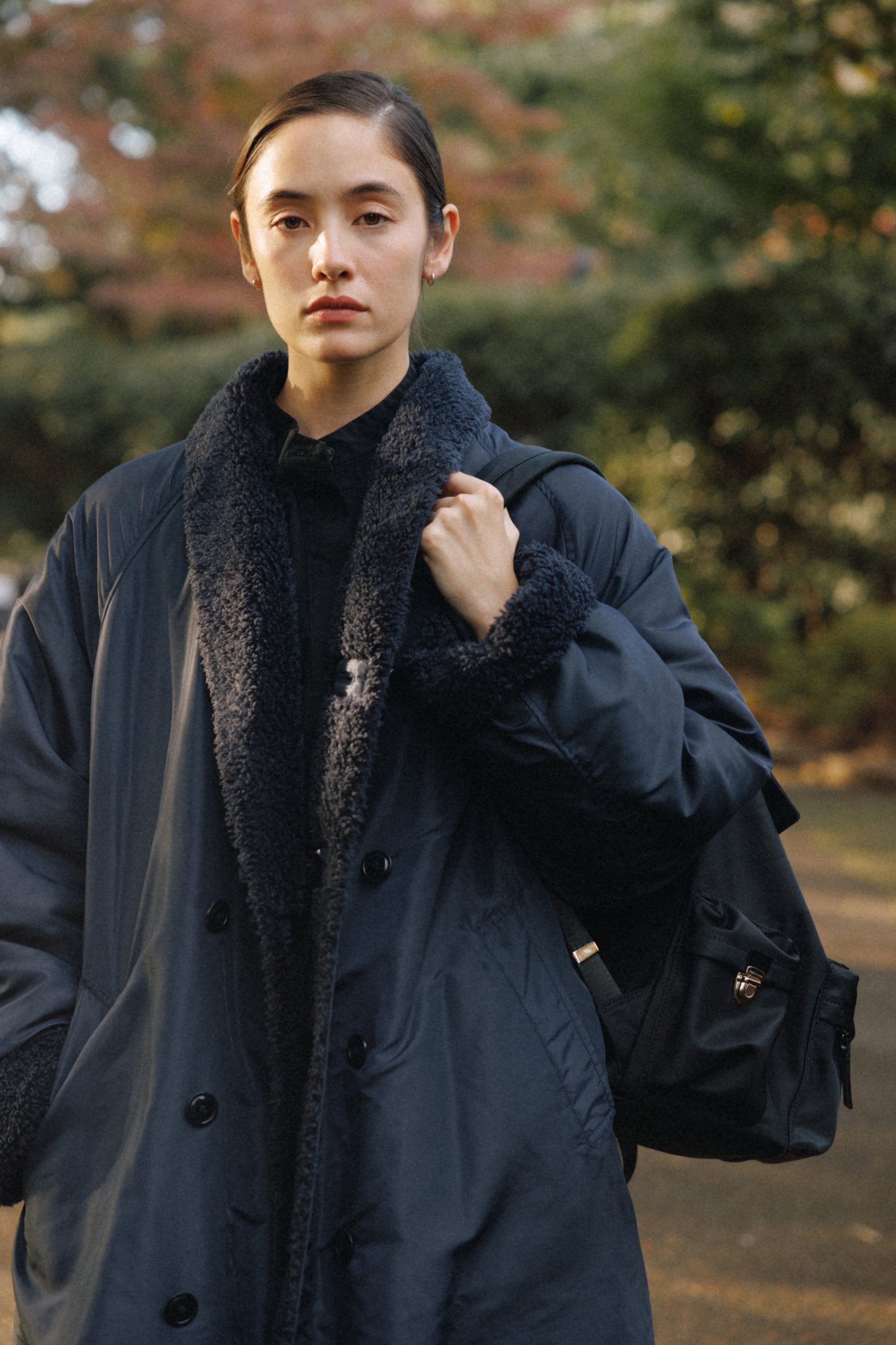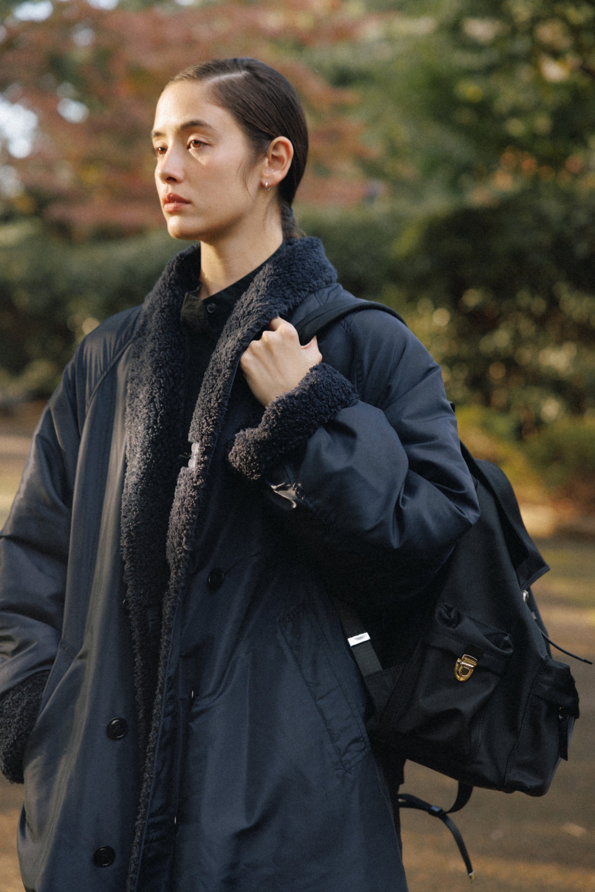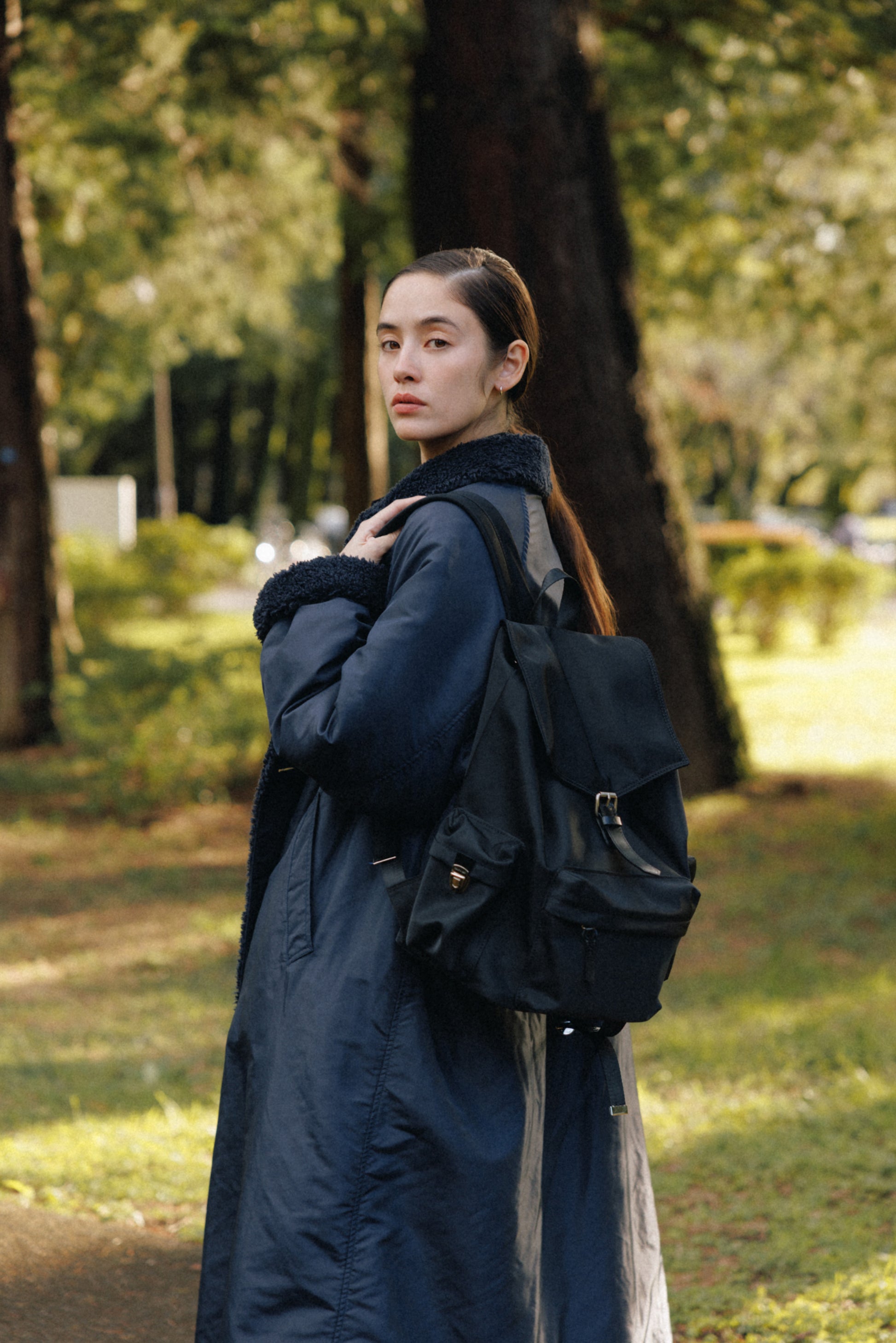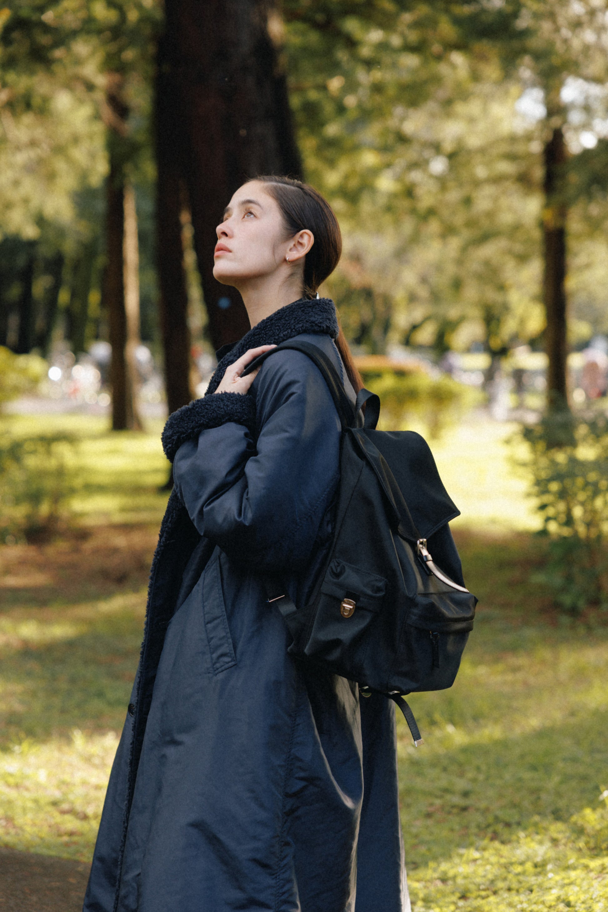 背面とショルダーストラップにはパッドを入れて負担を軽減し、上部にはシーンに応じて手持ちできるようレザーハンドルをあしらっています。