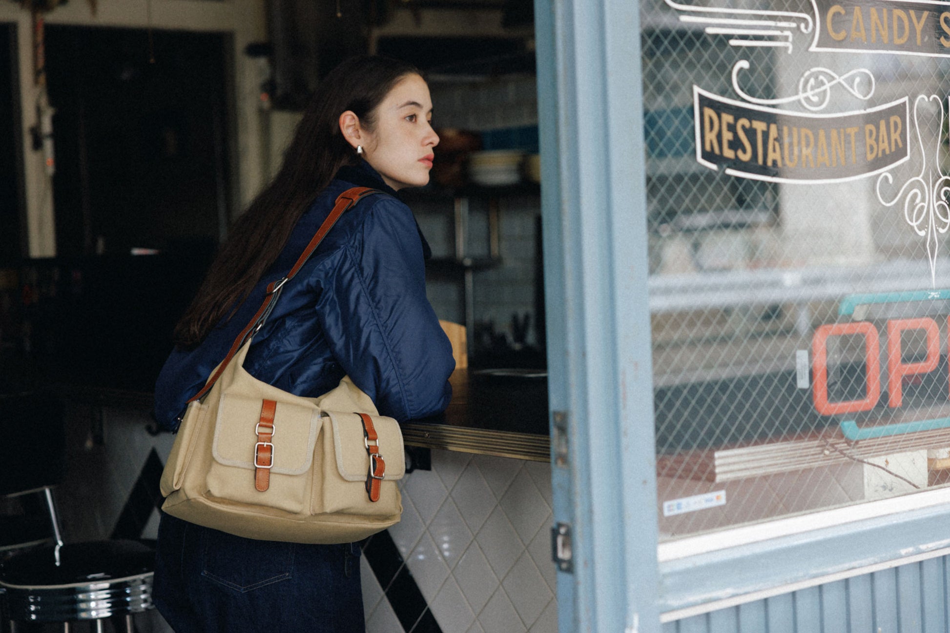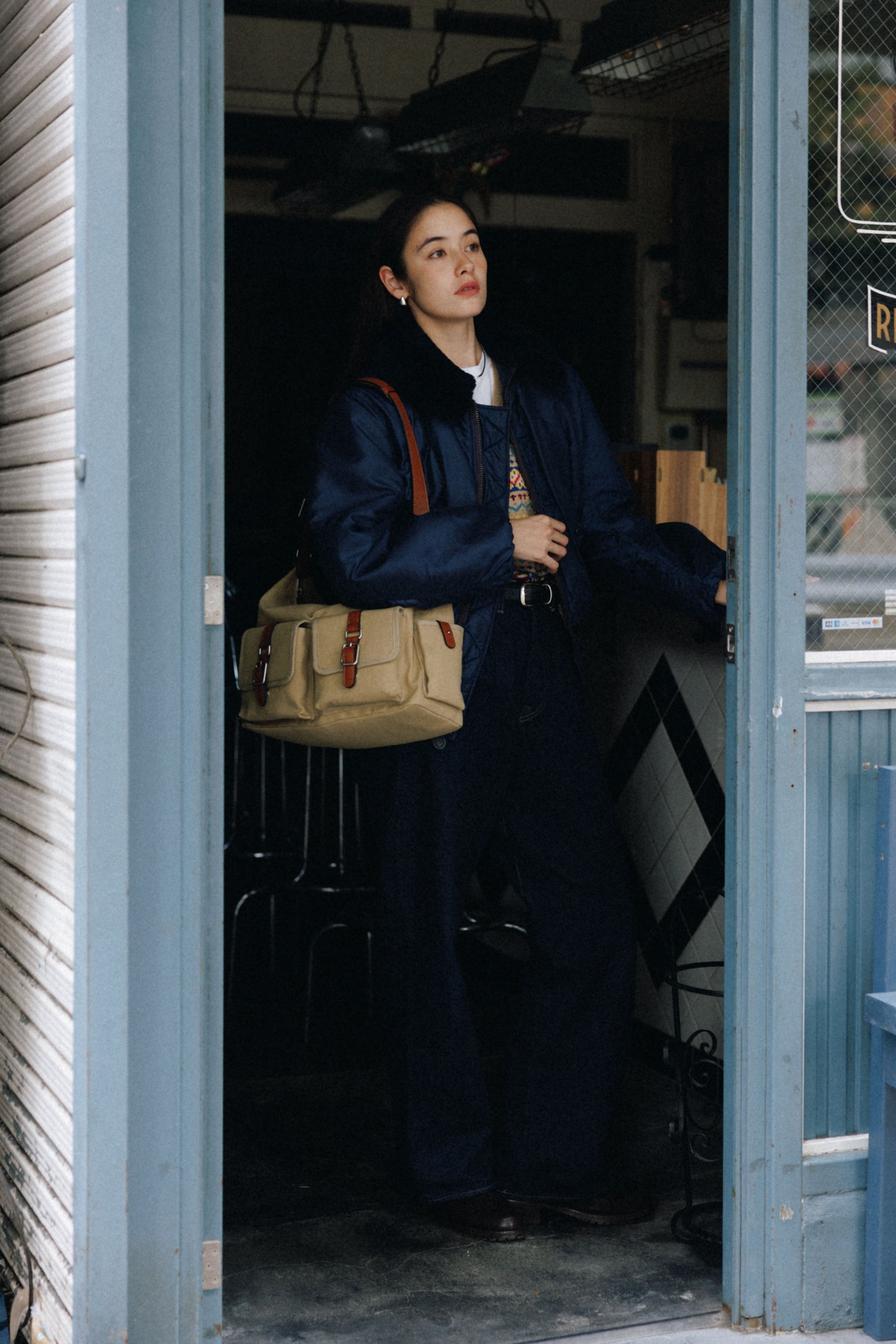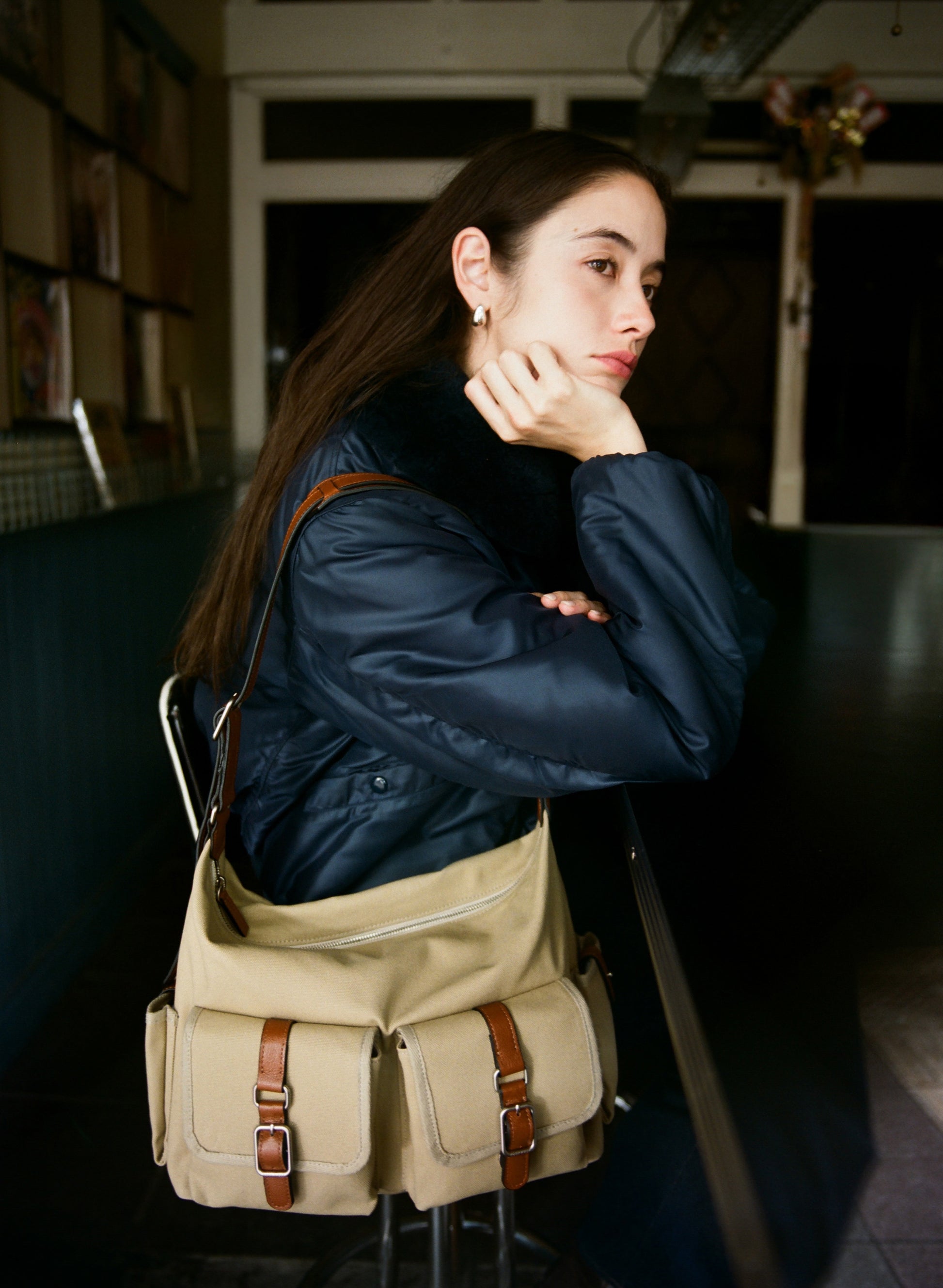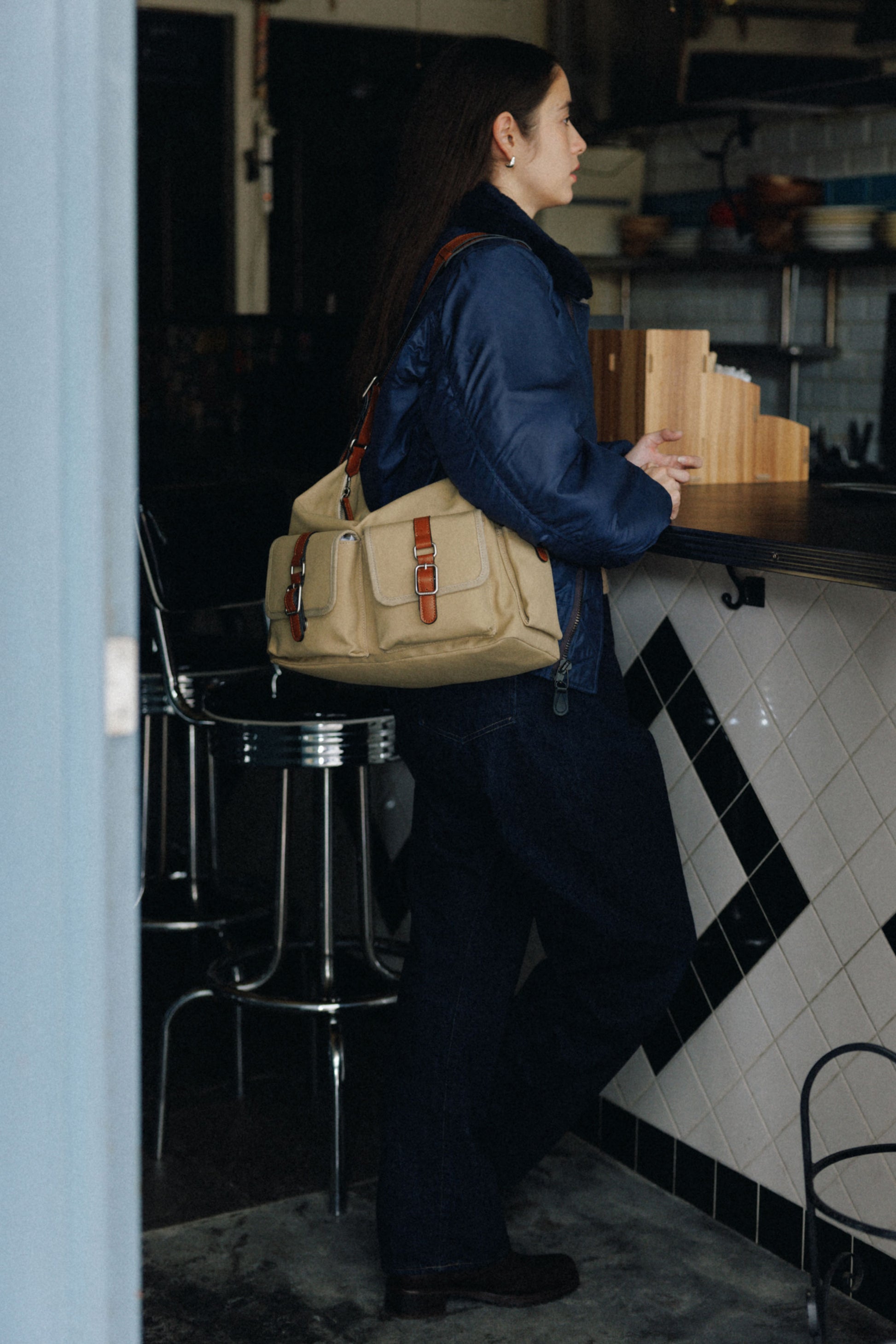 自然に落ちる曲線のシルエットが従来のブートバッグよりも柔らかい印象を与え、上部はジッパー開閉で、日常使いをより快適にしました。 フロントにはブートバッグの特徴であるレザーバックルポケットを施し、側面には小物収納用のポケットを追加しています。 カウレザーのストラップにはショルダーパッドを入れて快適さを高めており、長さ調節が可能でショルダーとクロスボディの2WAYでお使いいただけます。