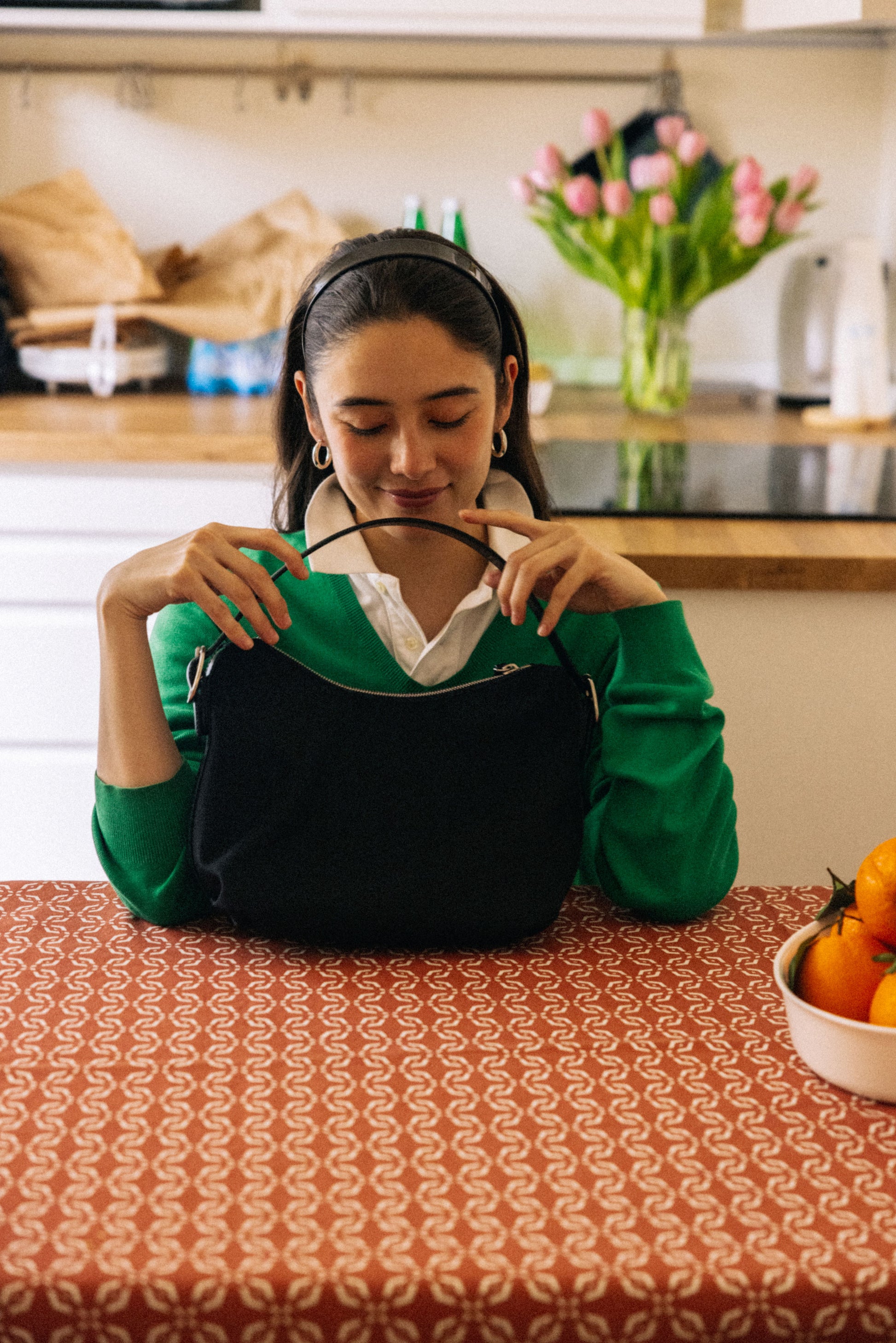 ファブリックバッグシリーズのカノ トワールバッグは、軽くて耐久性の強い素材に革ストラップの装飾とシグネチャーバックルを加えて完成しました。ブラスに薄いニッケルをメッキしたバックルにはトゥティエのロゴが刻印されており、裾にはプリーツを入れて収納に応じて自然な形に仕上げてくれます。雨雪にも強い外部ファブリックは季節を問わず使用でき、底部にはバッグを支える装飾とロゴ刻印を加えました。内部にはファスナーで開閉できる小さなポケットがあり、革ストラップはベルトバックルで長さ調節が可能です。収納によって柔軟に変形する形でスモールサイズであるにもかかわらず、多くの持ち物を収納でき、どんな着こなしにも簡単に着用できます。