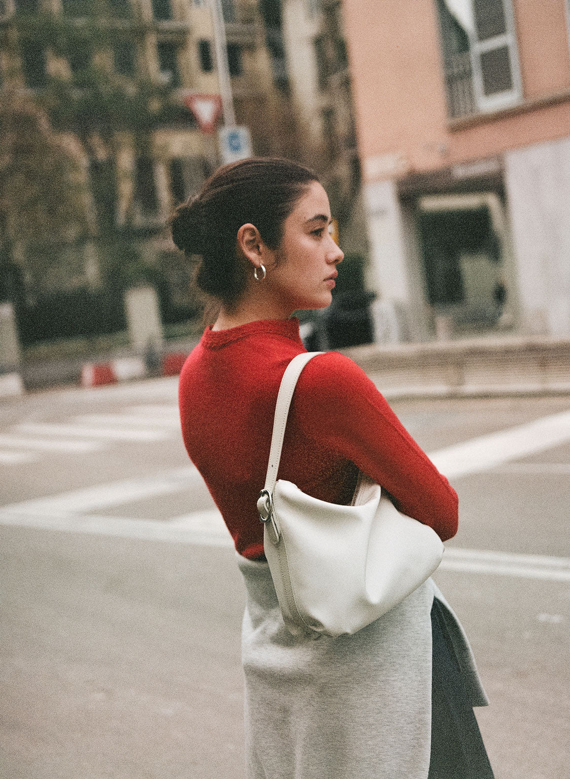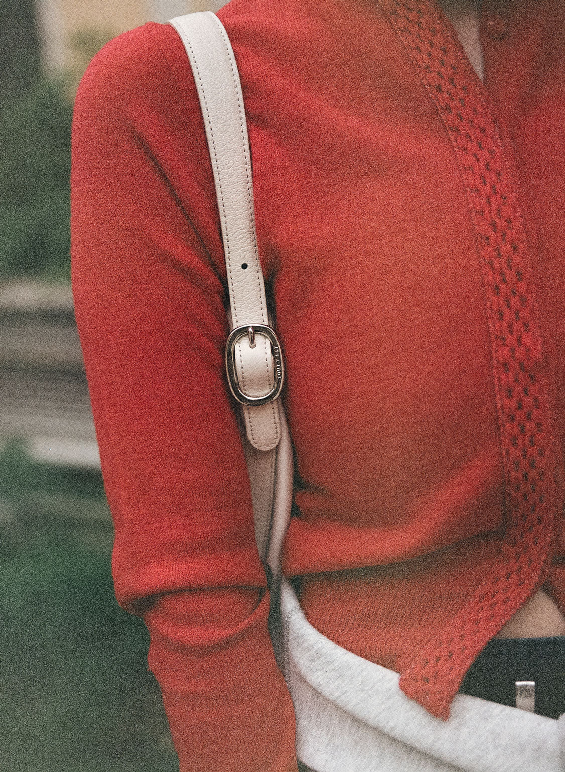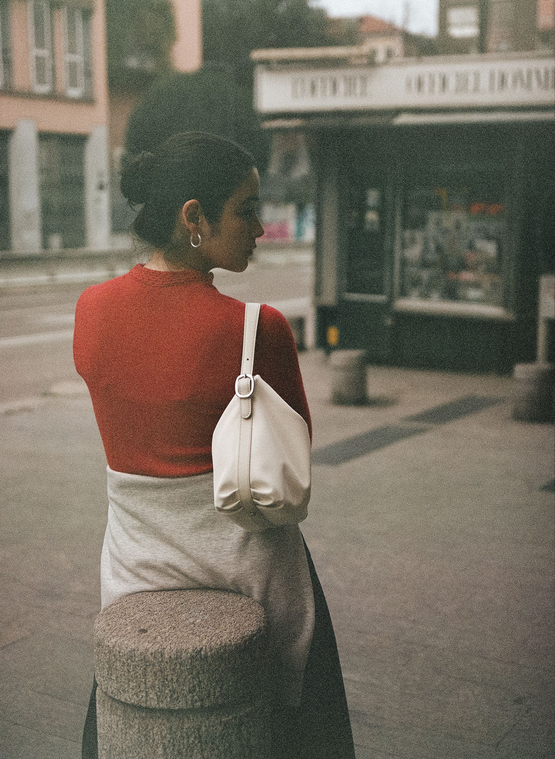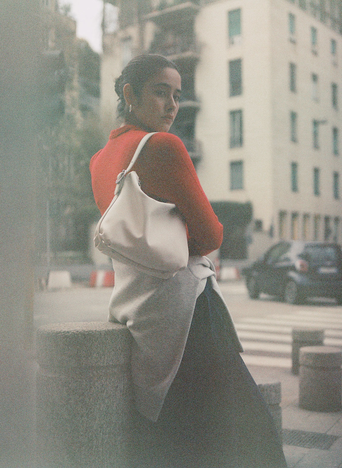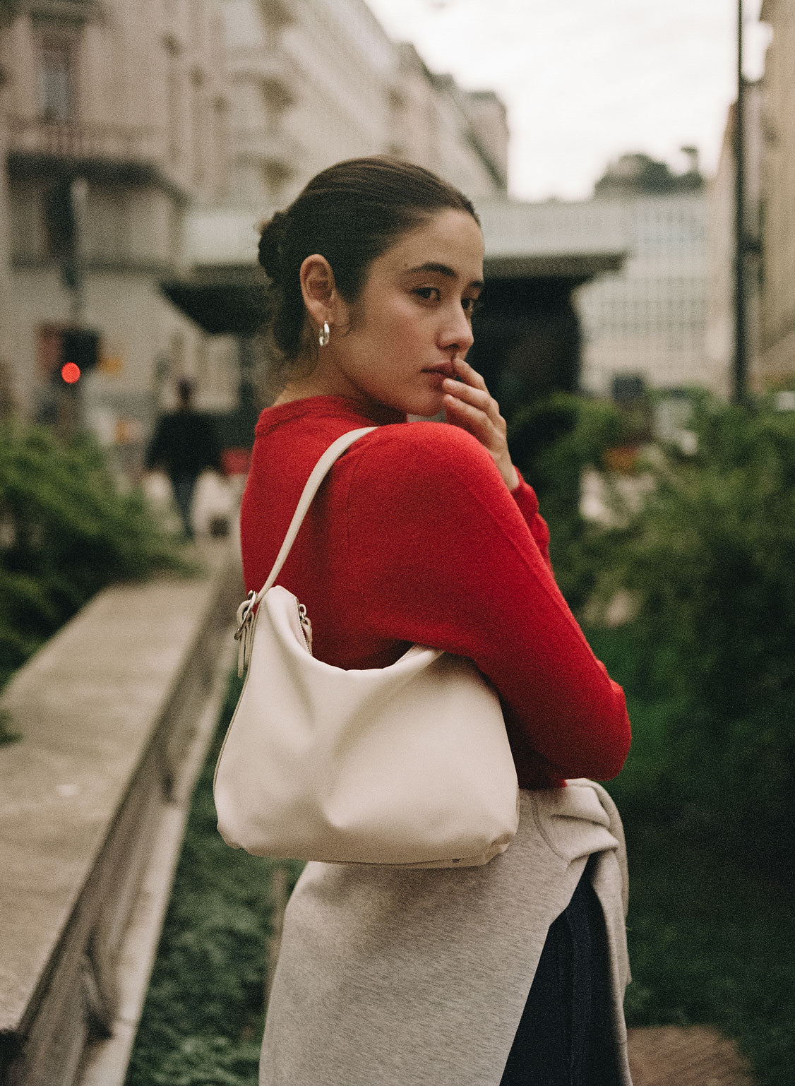 ファブリックバッグシリーズのカノ トワールバッグは、軽くて耐久性の強い素材に革ストラップの装飾とシグネチャーバックルを加えて完成しました。ブラスに薄いニッケルをメッキしたバックルにはトゥティエのロゴが刻印されており、裾にはプリーツを入れて収納に応じて自然な形に仕上げてくれます。雨雪にも強い外部ファブリックは季節を問わず使用でき、底部にはバッグを支える装飾とロゴ刻印を加えました。内部にはファスナーで開閉できる小さなポケットがあり、革ストラップはベルトバックルで長さ調節が可能です。収納によって柔軟に変形する形でスモールサイズであるにもかかわらず、多くの持ち物を収納でき、どんな着こなしにも簡単に着用できます。