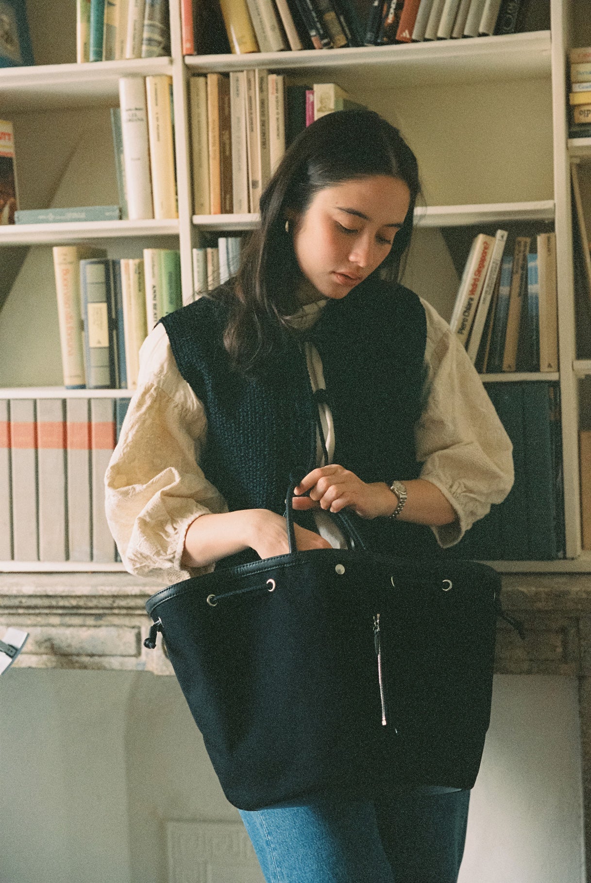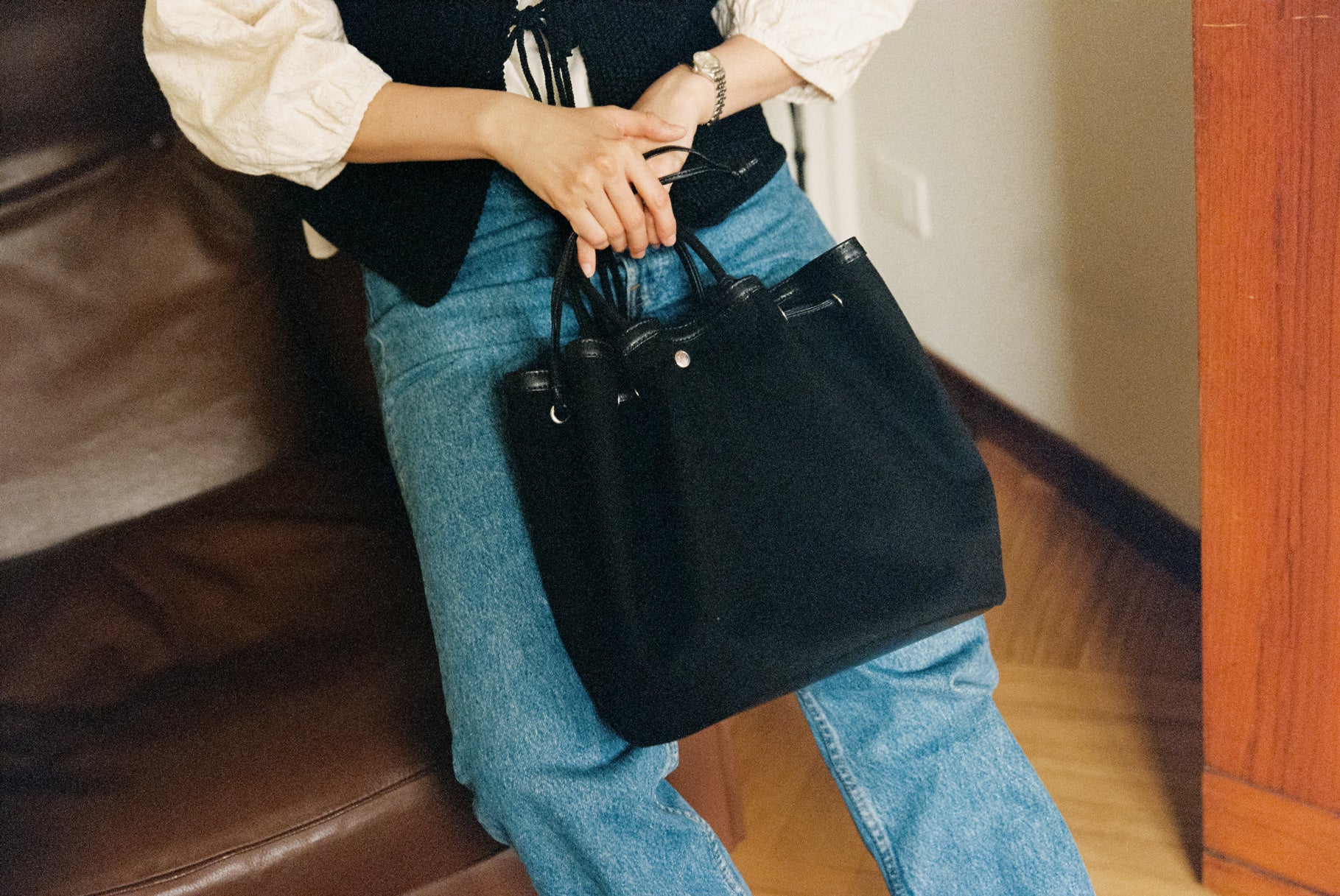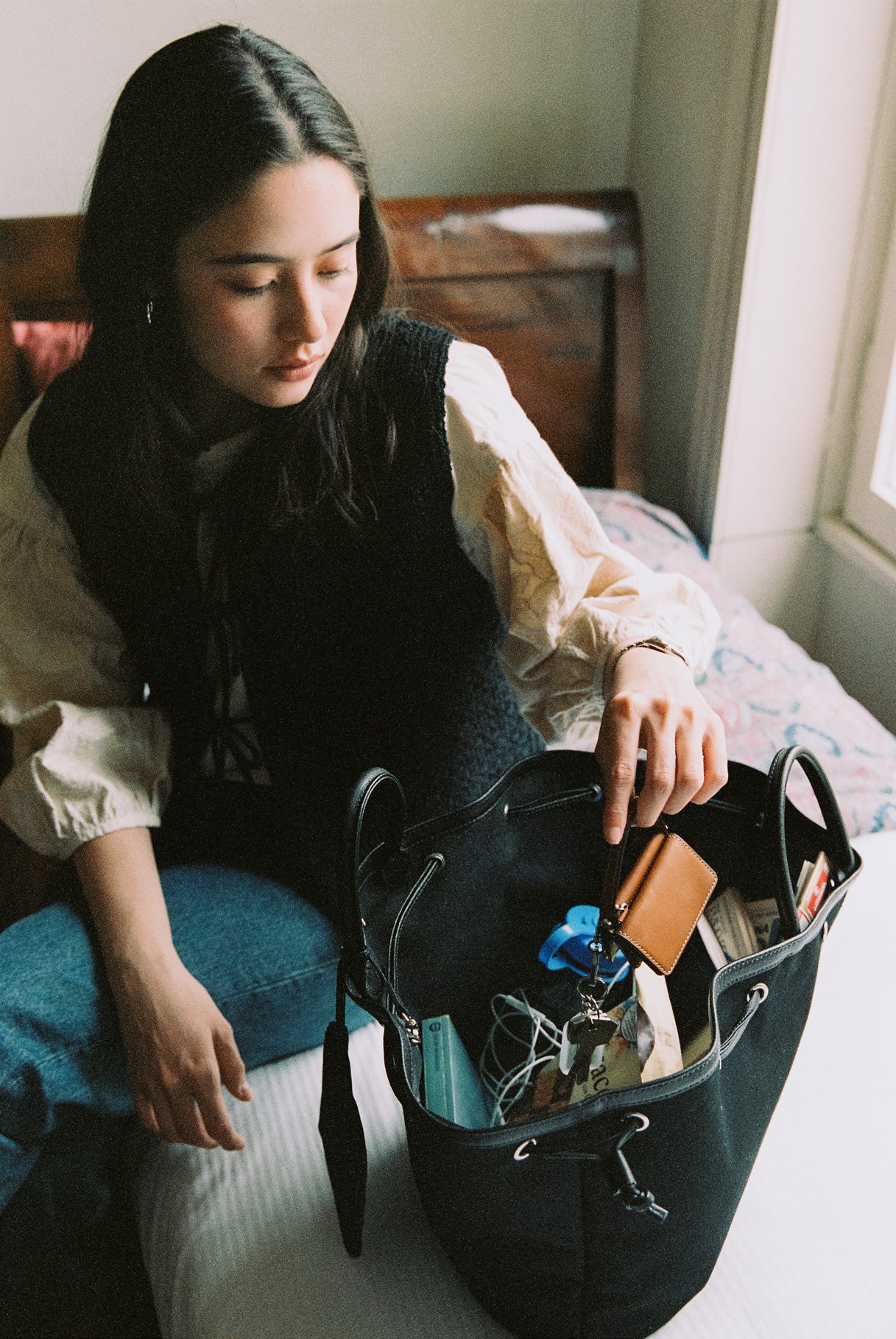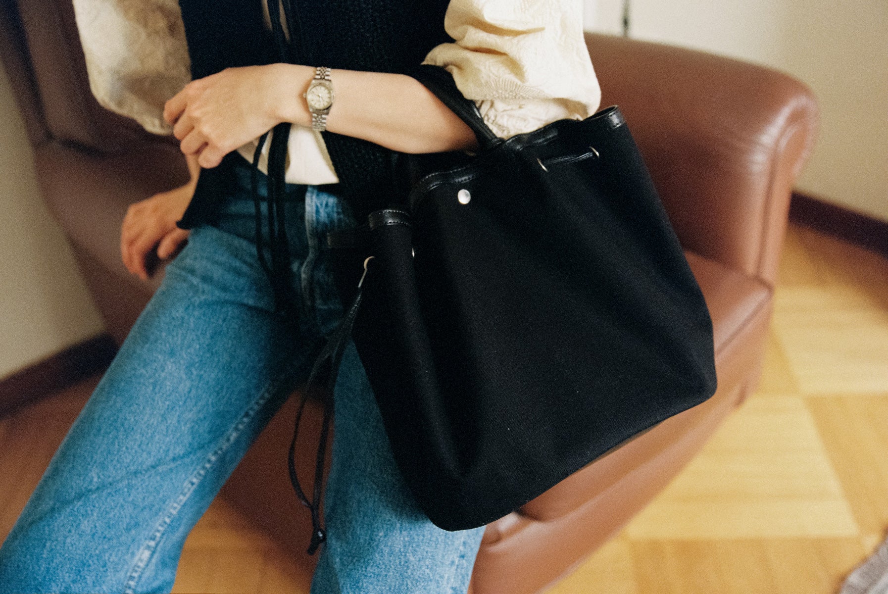 綿キャンバス素材に柔らかい羊革を加えて仕上げたショッパーバッグです。 coquilleはフランス語で貝殻を意味し、上部の革ストリングで自由に形の調節ができるカバンの特徴を盛り込んでいます。 持ち物が多いときは、広く広げてショッパーバッグ状に、あるいはストリングを締めてバケットバッグ状に使用できます。 中央にロゴスナップボタンが付いていてロックが可能です。 また、取り外しが可能なポーチを一緒に構成し、手がよく行く小さな持ち物の保管にも容易です。 柔らかく丸いストラップは所持品をたくさん入れても楽なグリップ感を提供し、丈夫な羊革で製作された下段はカバンを安定的に支えてくれます。