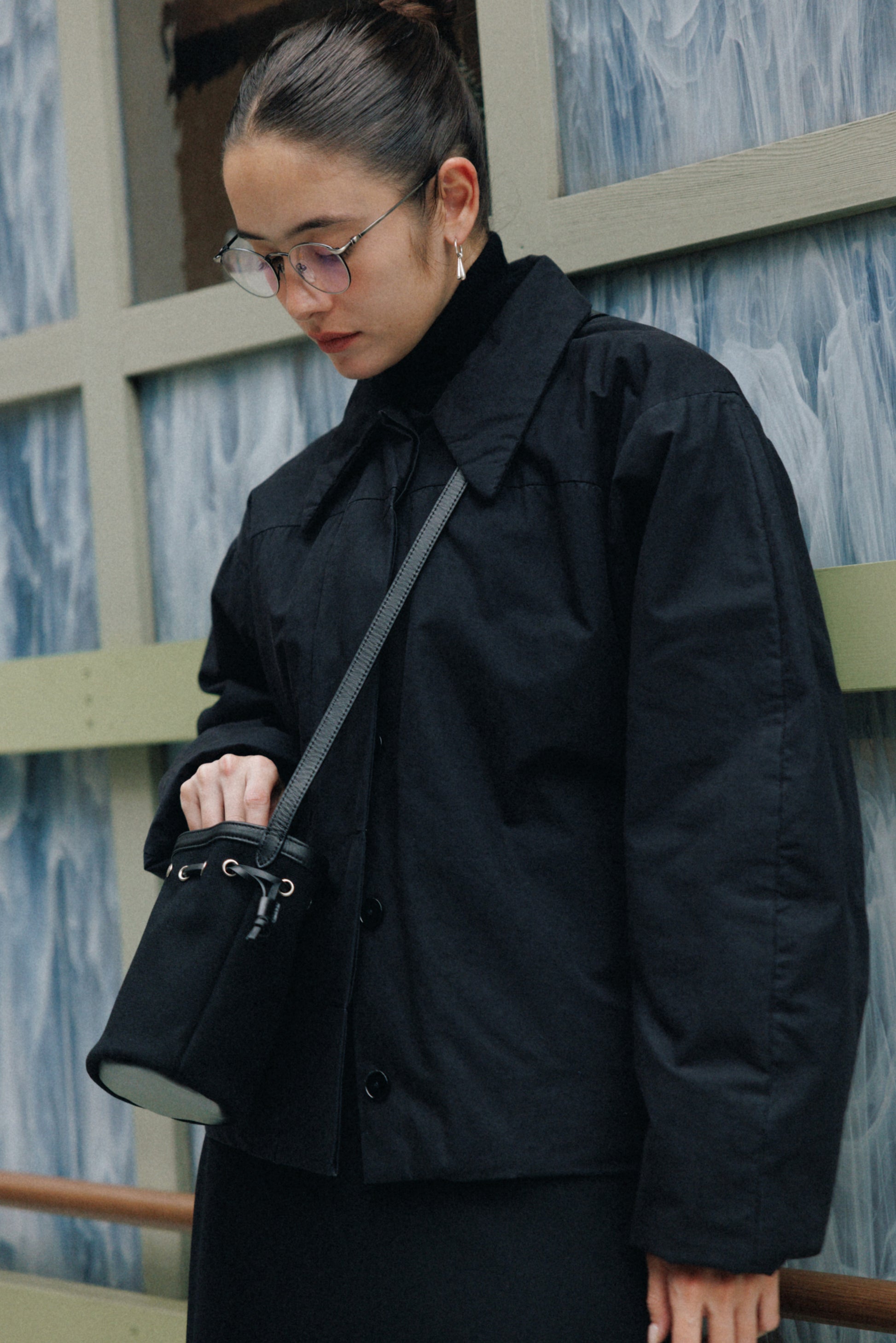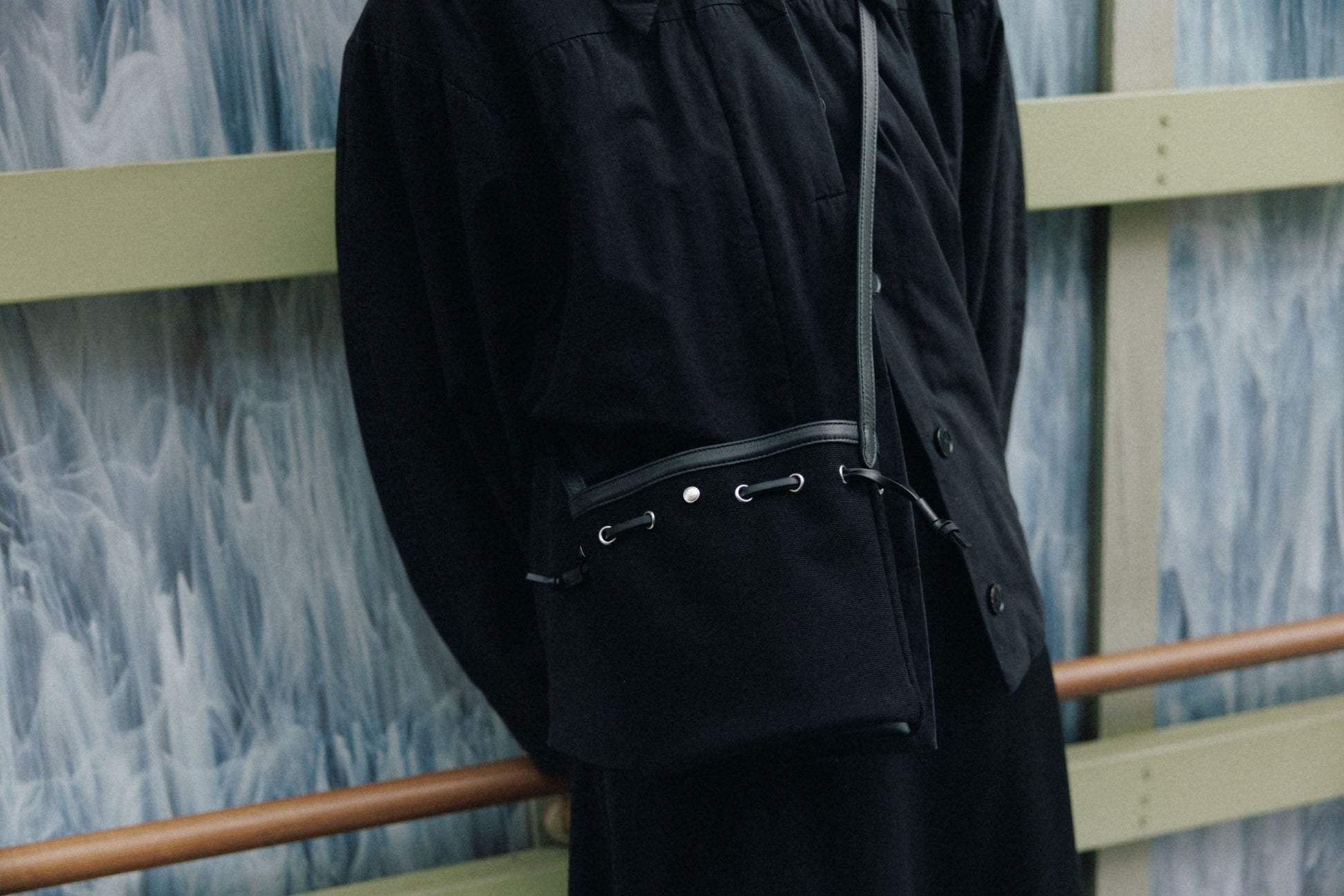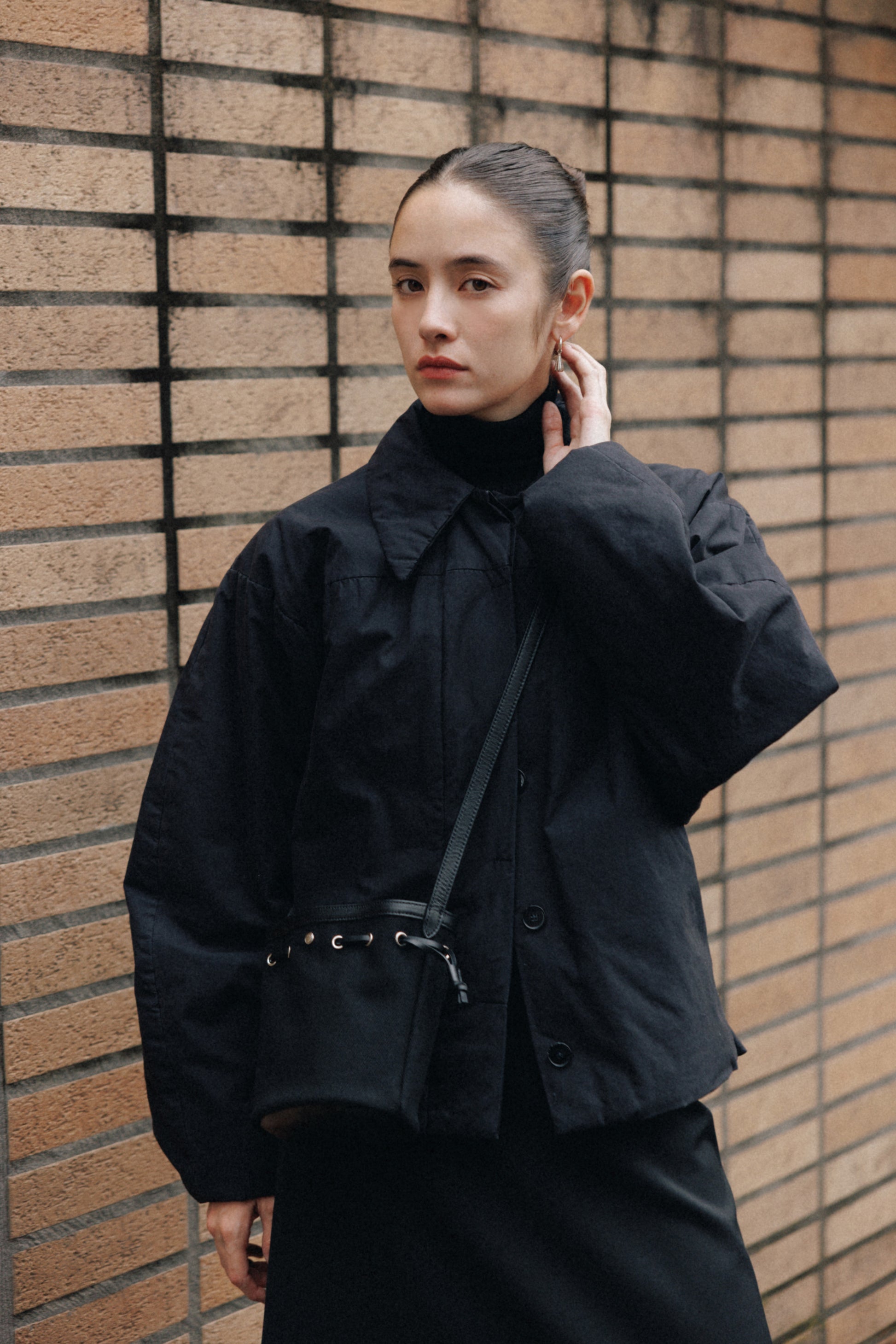 コットンキャンバスに柔らかな牛革を組み合わせて仕上げた、コキ バケットバッグのミニサイズです。"COQUILLE"はフランス語で“貝殻”を意味し、上部のレザーストリングでフォルムを自在に調整できるバッグの特徴を表しています。