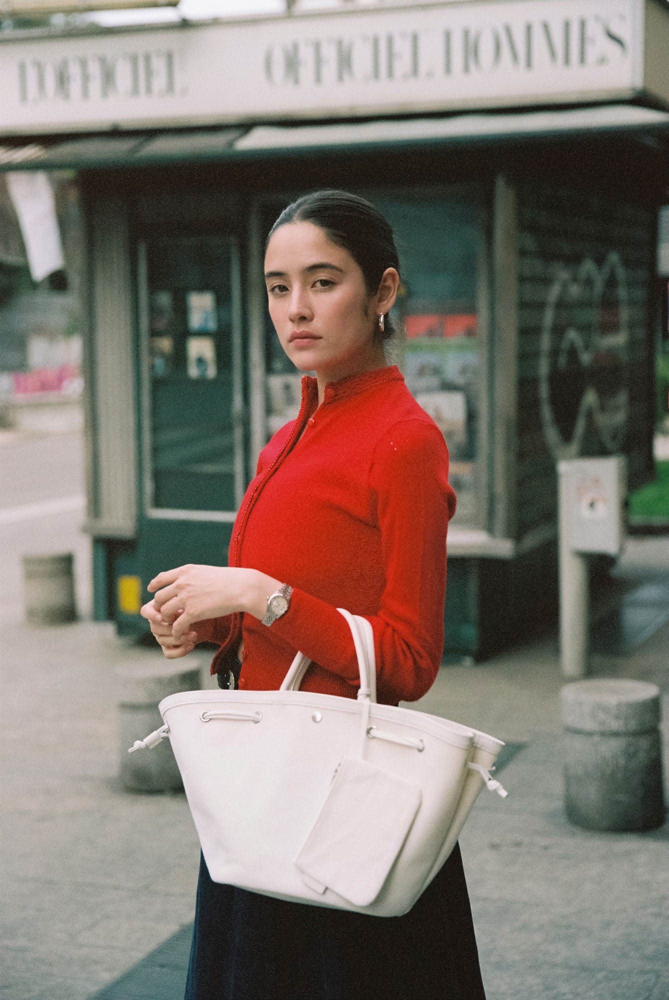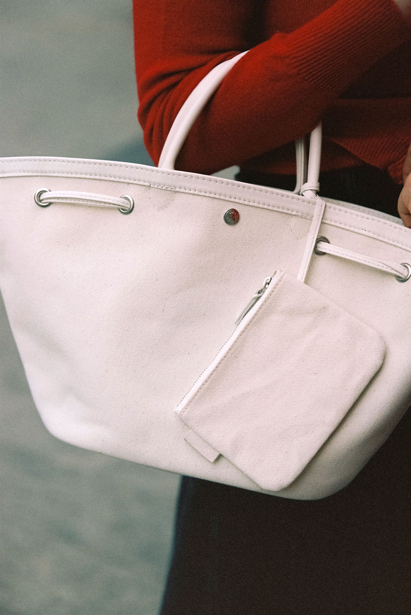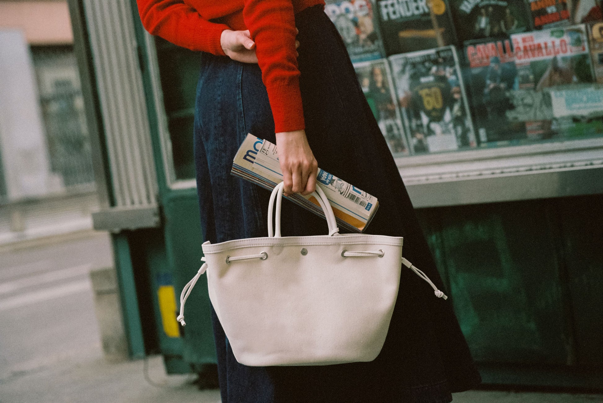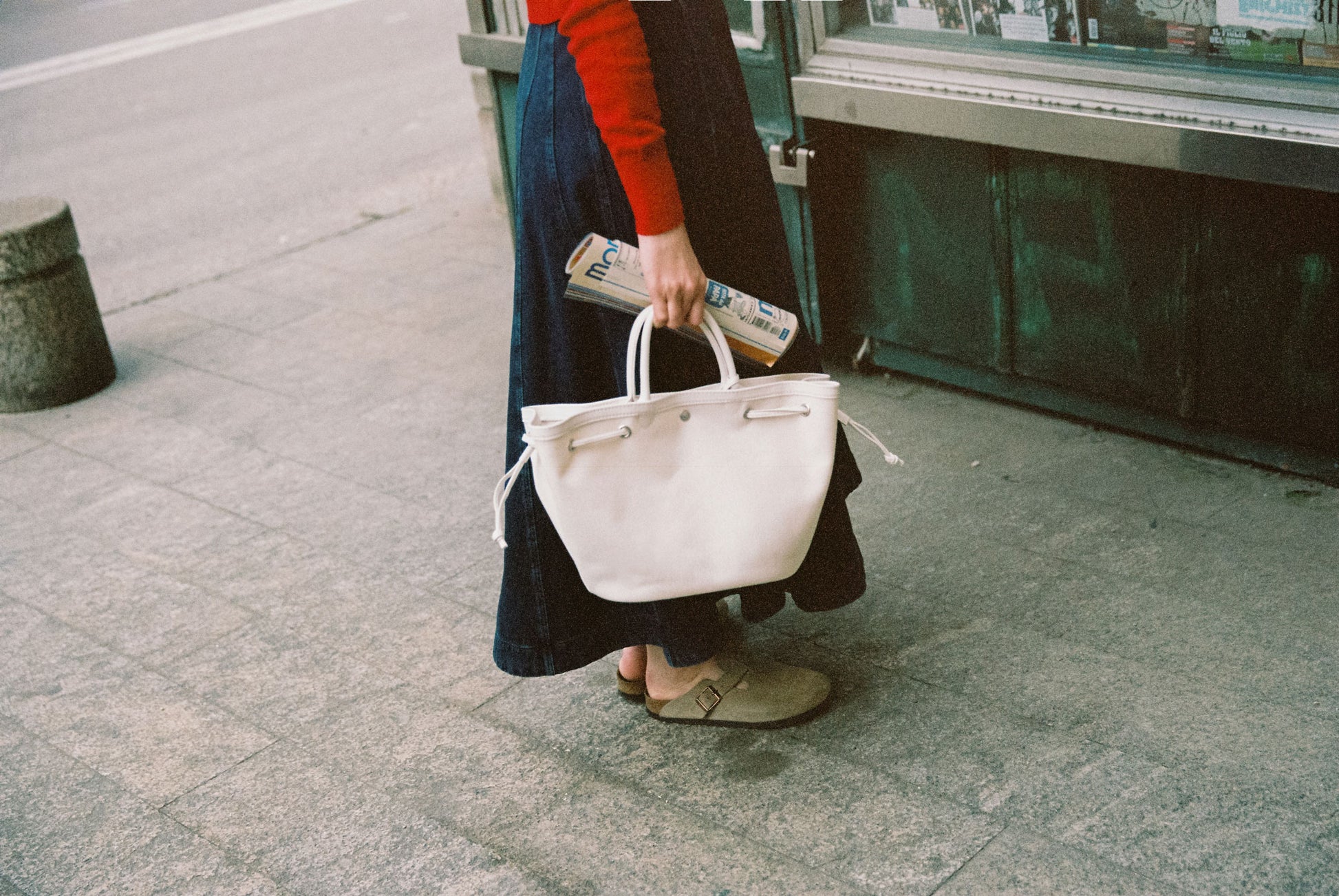 綿キャンバス素材に柔らかい羊革を加えて仕上げたショッパーバッグです。 coquilleはフランス語で貝殻を意味し、上部の革ストリングで自由に形の調節ができるカバンの特徴を盛り込んでいます。 持ち物が多いときは、広く広げてショッパーバッグ状に、あるいはストリングを締めてバケットバッグ状に使用できます。 中央にロゴスナップボタンが付いていてロックが可能です。 また、取り外しが可能なポーチを一緒に構成し、手がよく行く小さな持ち物の保管にも容易です。 柔らかく丸いストラップは所持品をたくさん入れても楽なグリップ感を提供し、丈夫な羊革で製作された下段はカバンを安定的に支えてくれます。