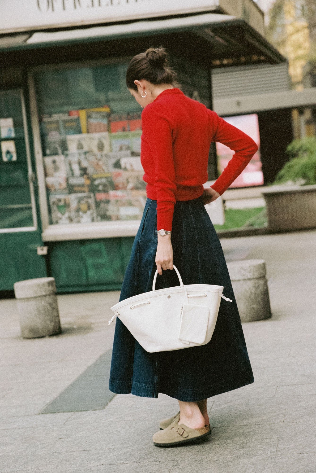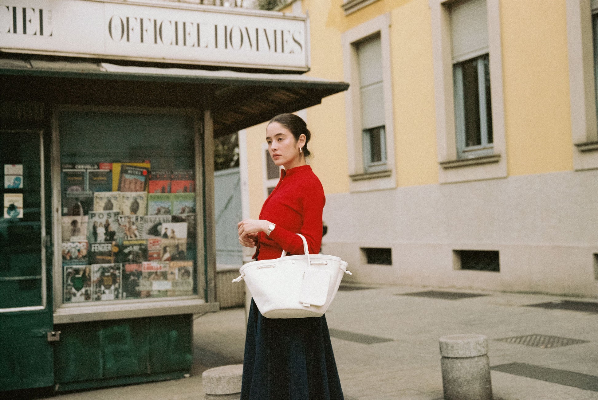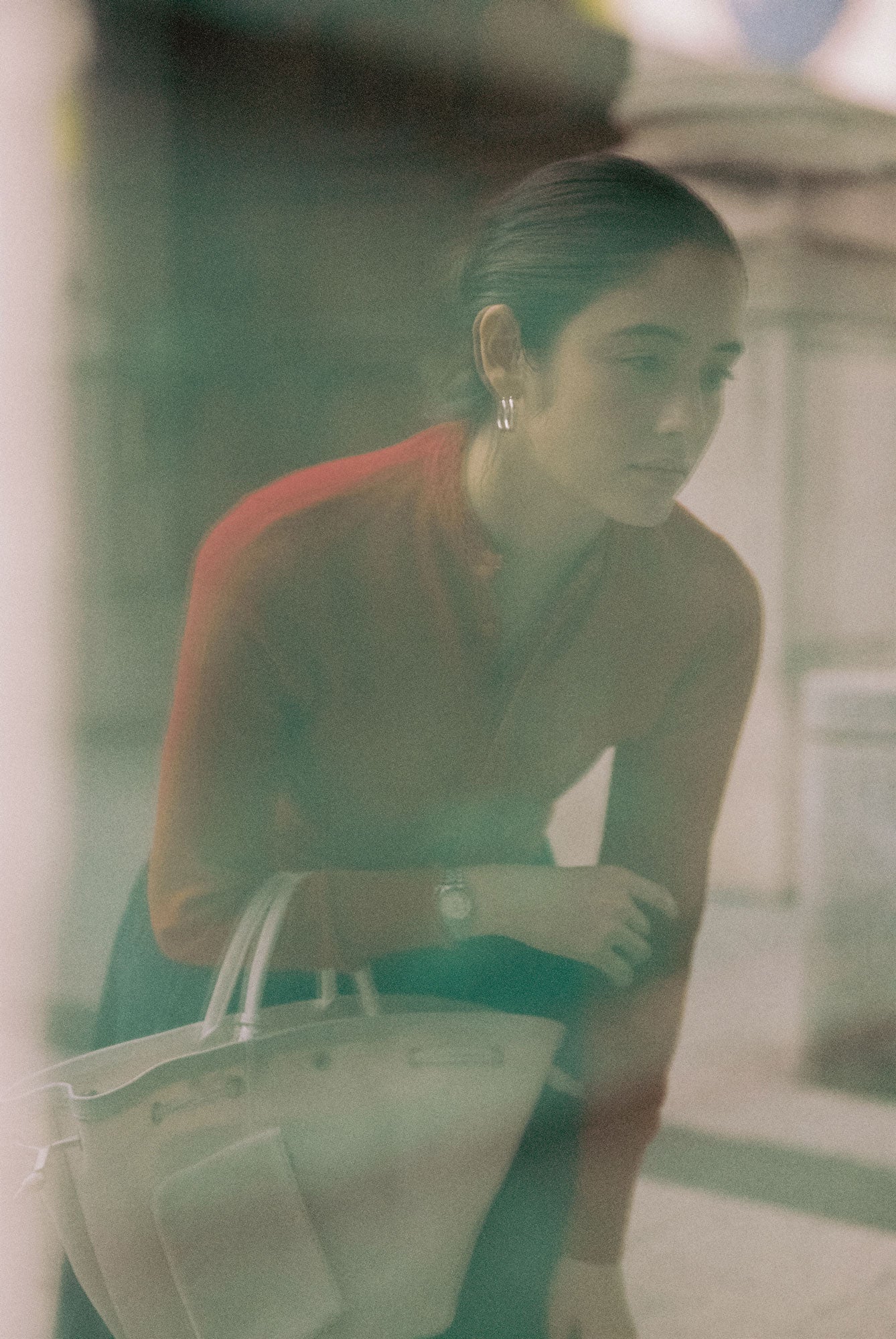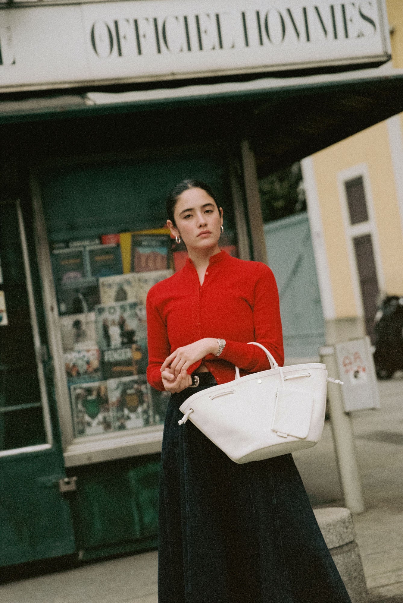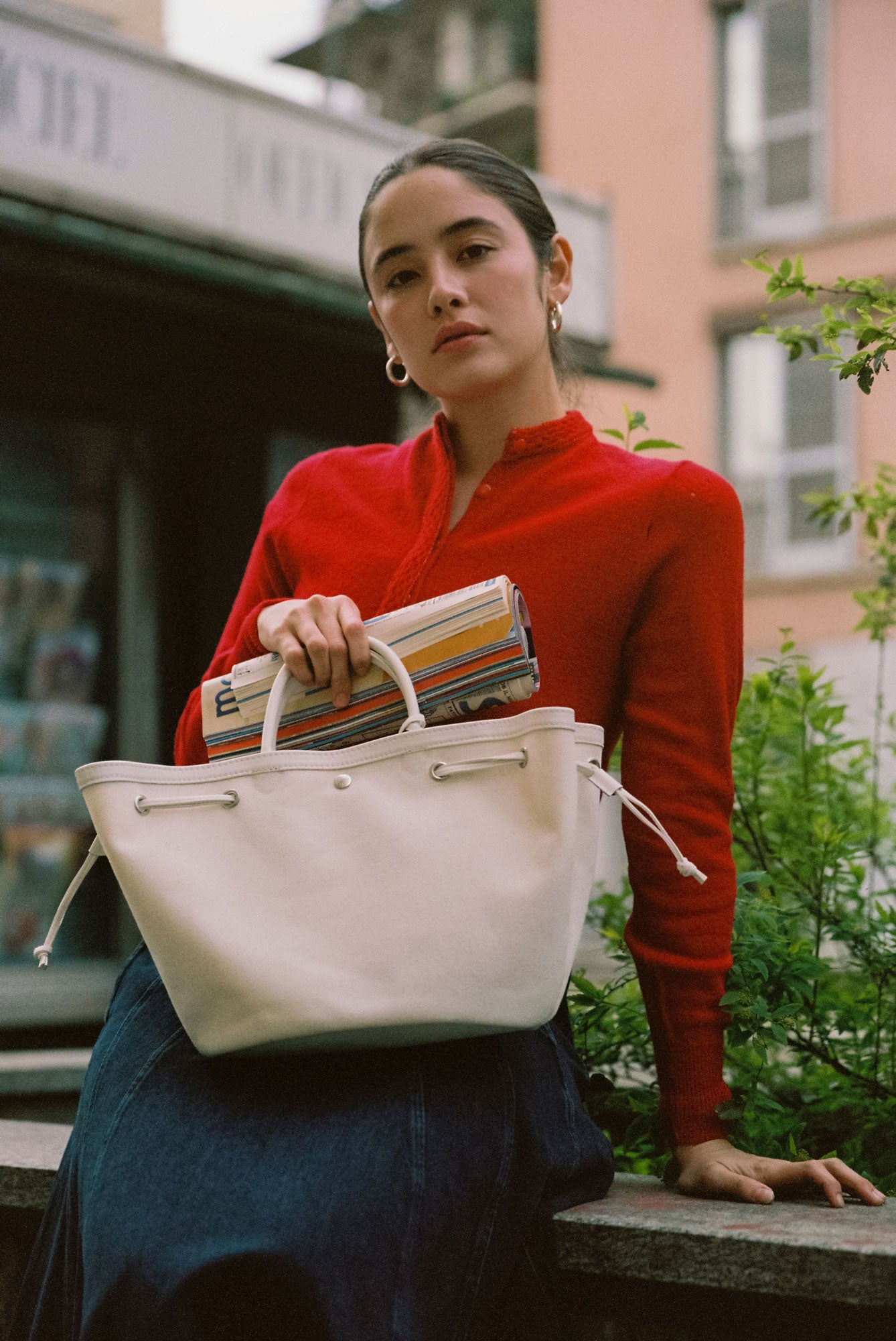 綿キャンバス素材に柔らかい羊革を加えて仕上げたショッパーバッグです。 coquilleはフランス語で貝殻を意味し、上部の革ストリングで自由に形の調節ができるカバンの特徴を盛り込んでいます。 持ち物が多いときは、広く広げてショッパーバッグ状に、あるいはストリングを締めてバケットバッグ状に使用できます。 中央にロゴスナップボタンが付いていてロックが可能です。 また、取り外しが可能なポーチを一緒に構成し、手がよく行く小さな持ち物の保管にも容易です。 柔らかく丸いストラップは所持品をたくさん入れても楽なグリップ感を提供し、丈夫な羊革で製作された下段はカバンを安定的に支えてくれます。
