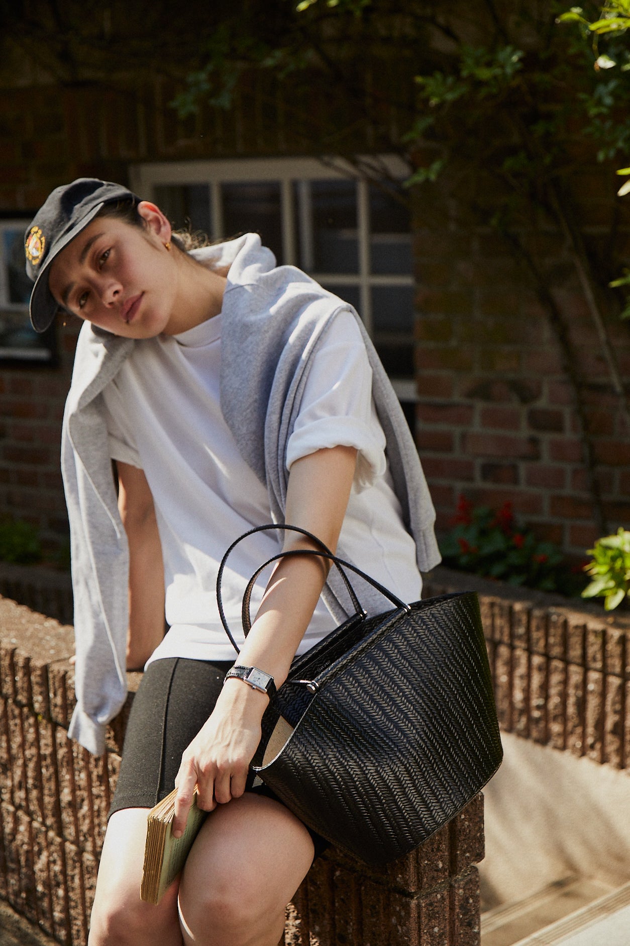 新しく披露するウィーブパターンで作ったエティレバッグは、安定した形のショッパーバッグで十分な収納力を誇ります。 革を編んだようなウィーブパターンは繊細ながらも丈夫で自然なツートーンで、トゥティエならではのビンテージ感を表現します。さりげなく見える裏地もまた、厚みのある質感のコットンリネン素材を使用して完成度を高めました。 ファスナー付きの内側ポケットは持ち物を安全に収納でき、小さなフックで簡単に開閉できます。