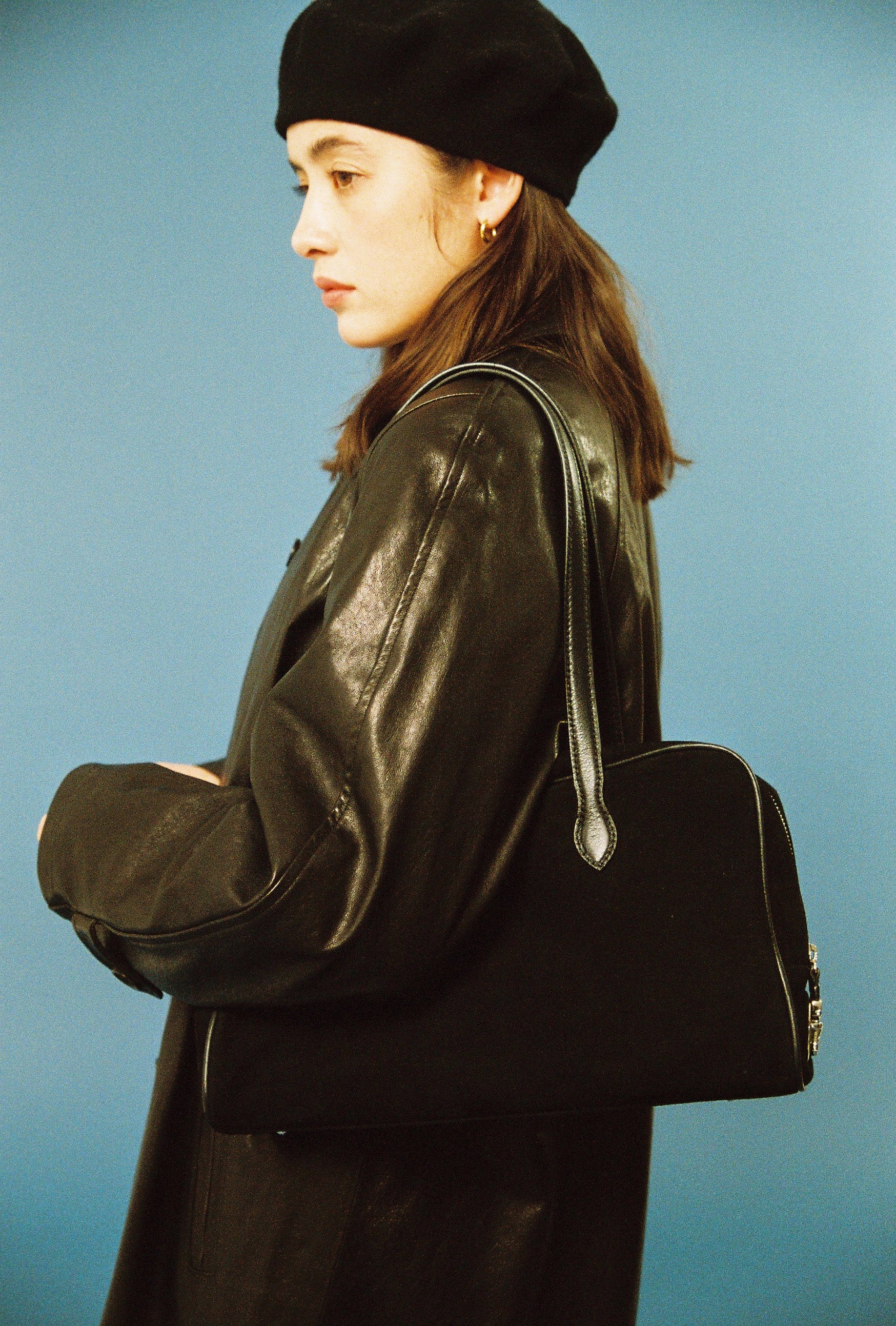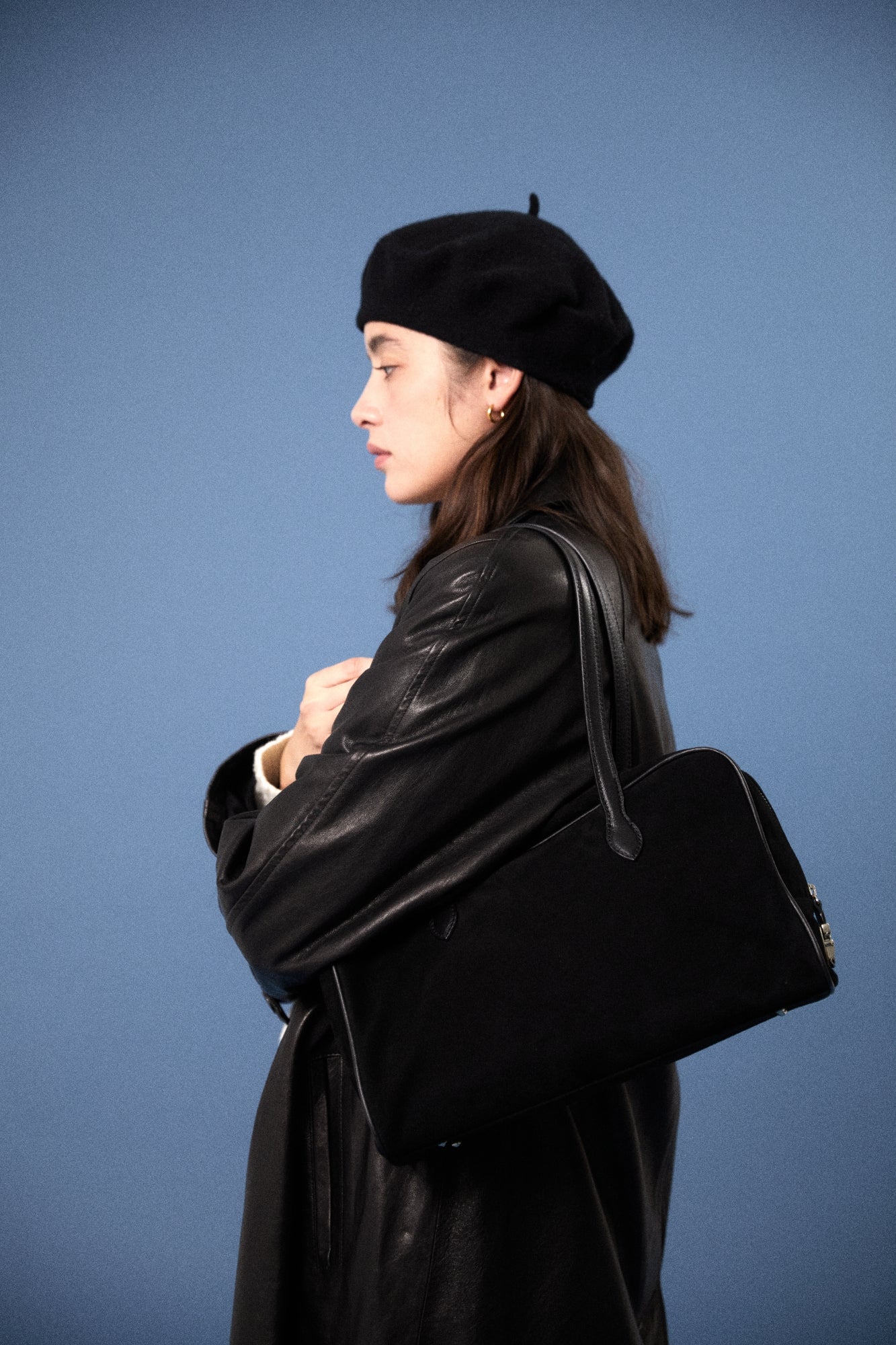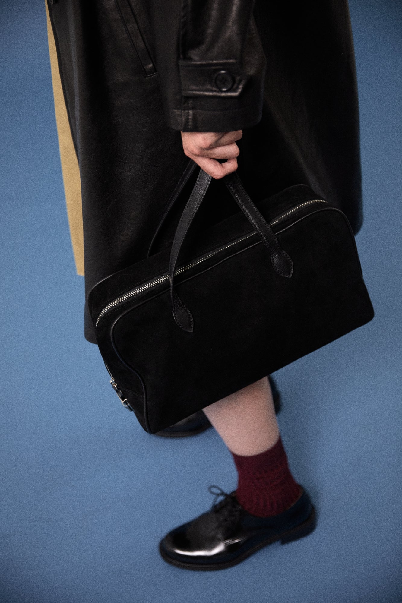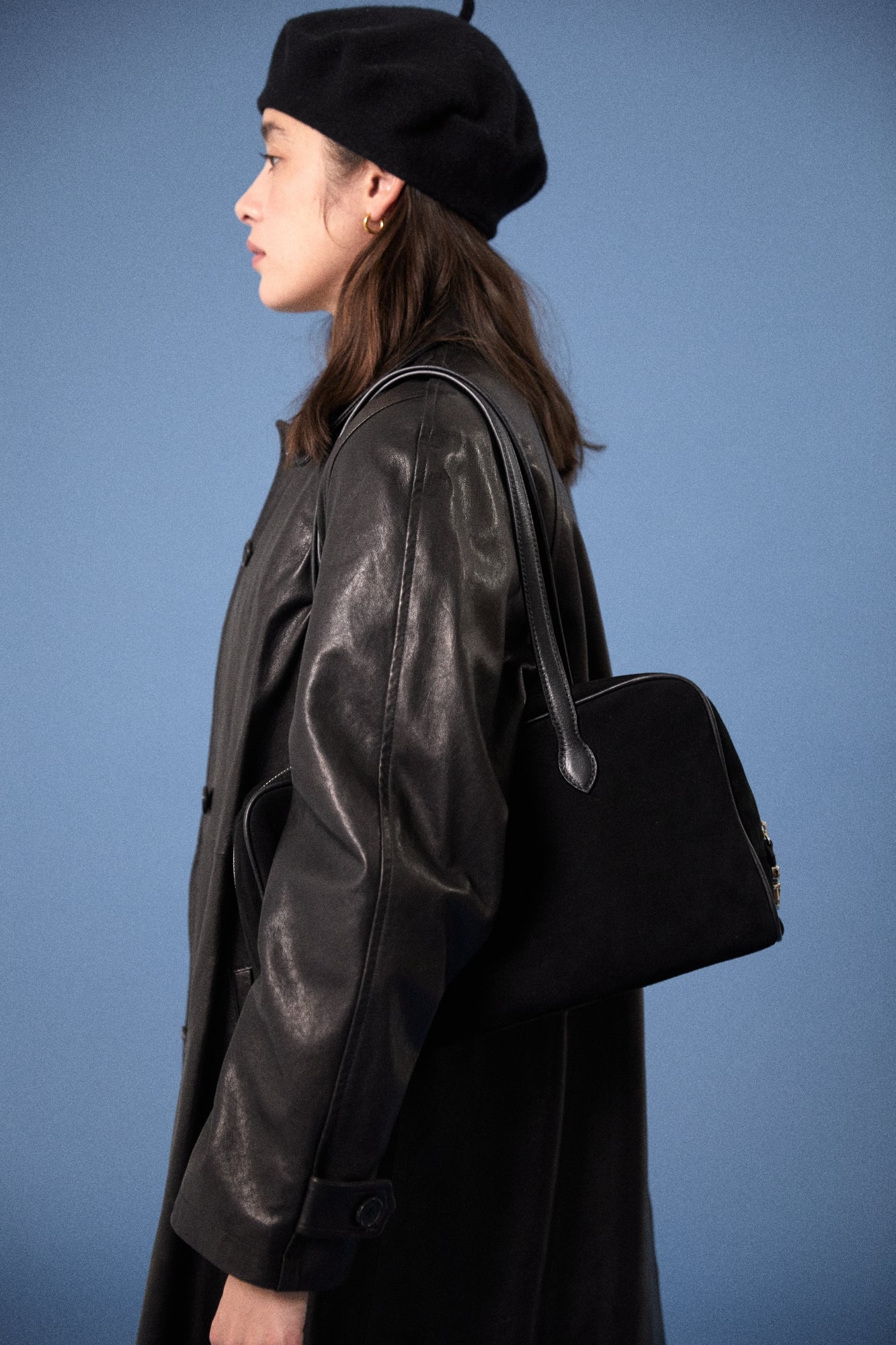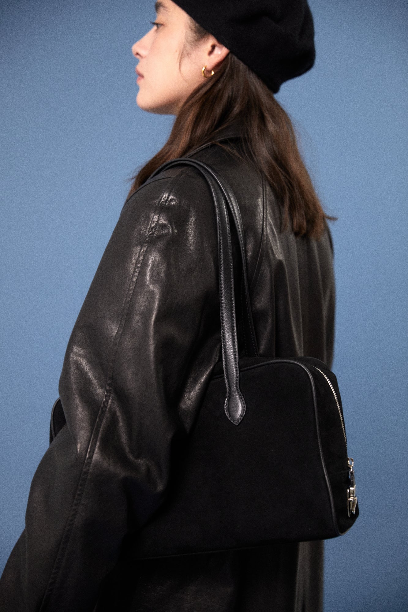 ロケバッグオリジナルサイズのロングストラップバージョンでショルダー着用が可能な商品です。ゴートスエード素材は光によって変わるほのかなカラー感が目立ち、ソフトな仕上げでショルダーとして着用すると自然に形が整えられ、快適な着用感を提供します。ストラップ部分は牛革を使用して耐久性を高め、角に沿って巻いた革トリムはバッグの形を安定感のあるものにしてくれます。 裏地は厚手のコットンリネンで製作されており、広く開くファスナーでゆったりとした収納力と軽量感を誇ります。