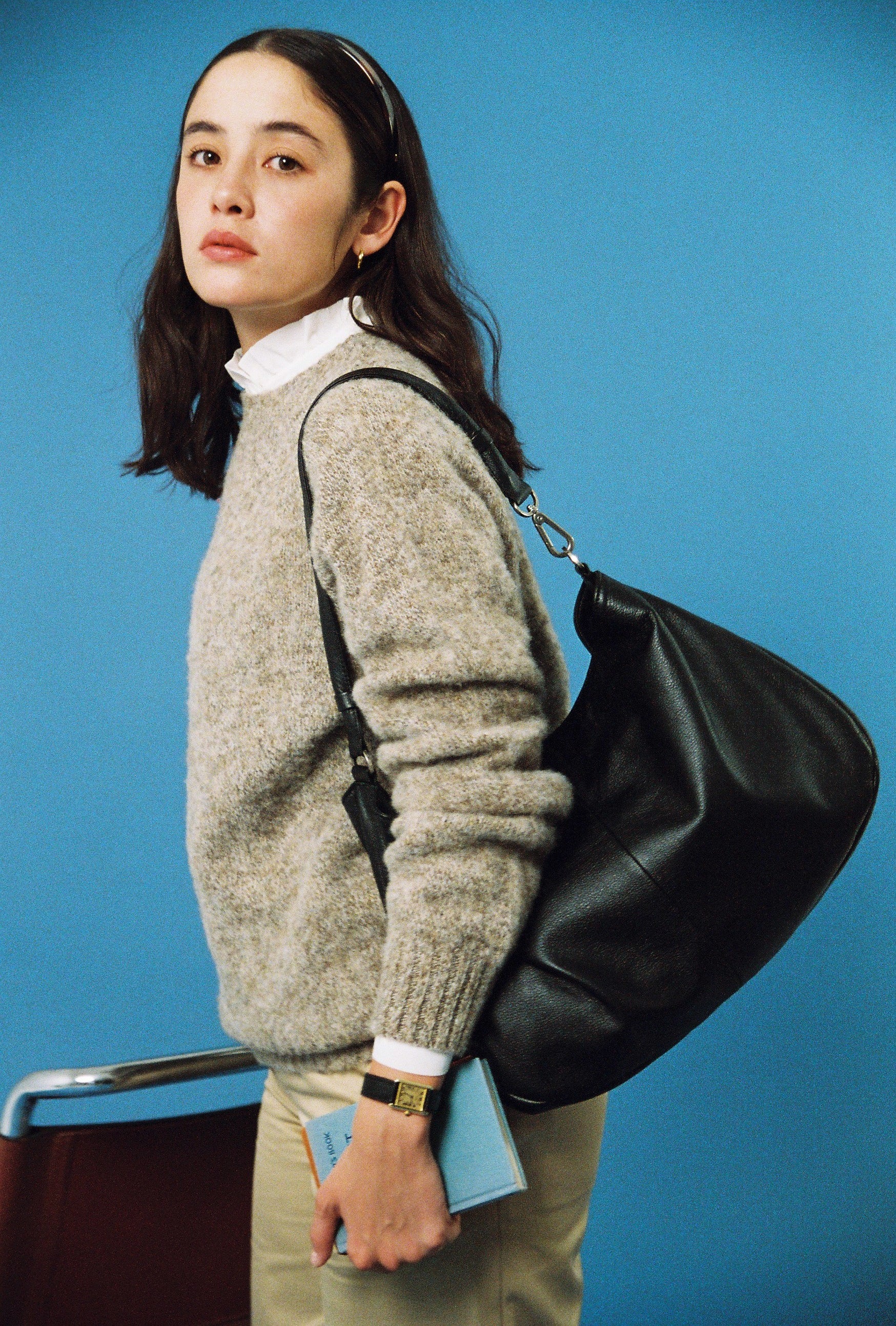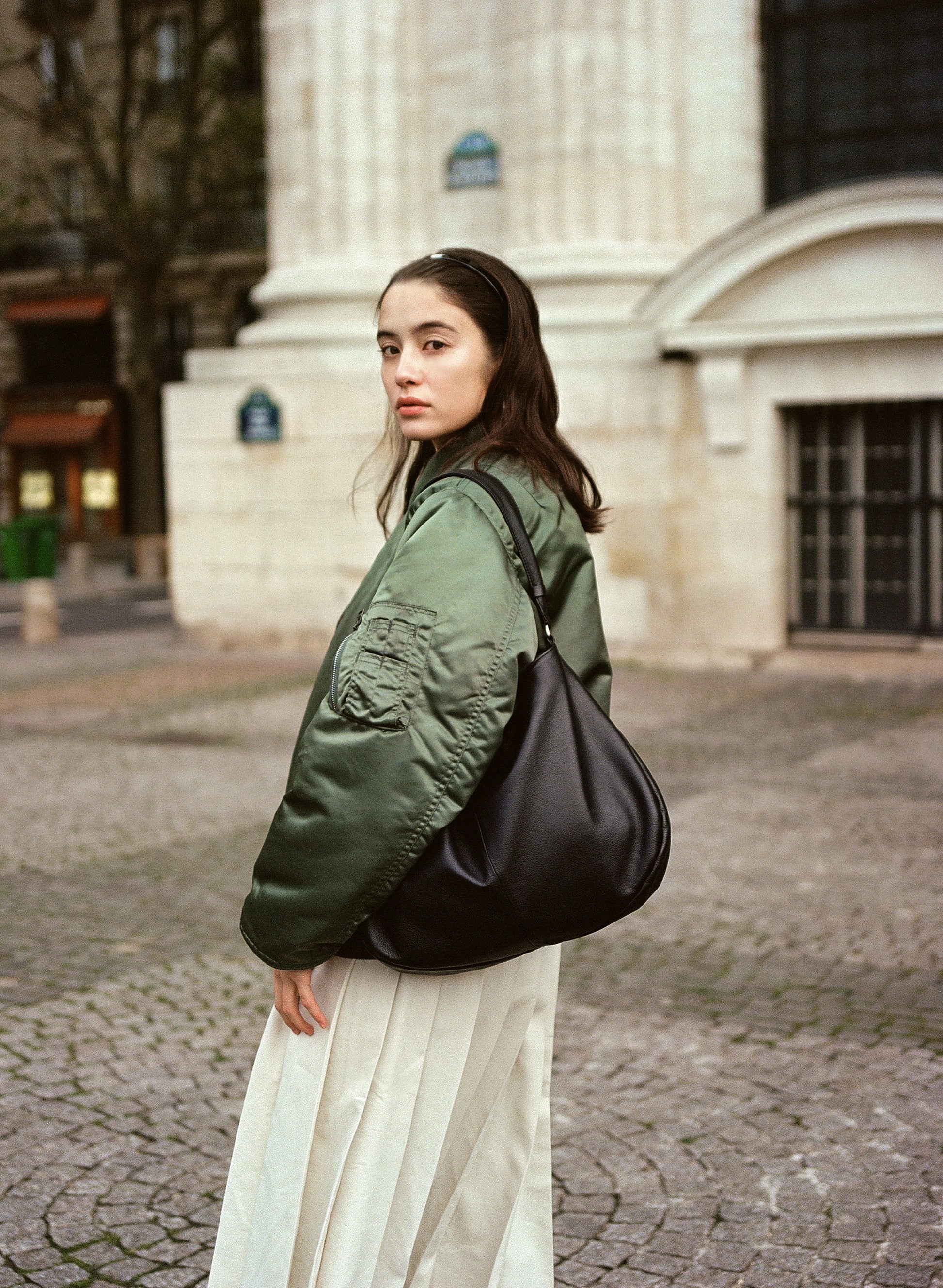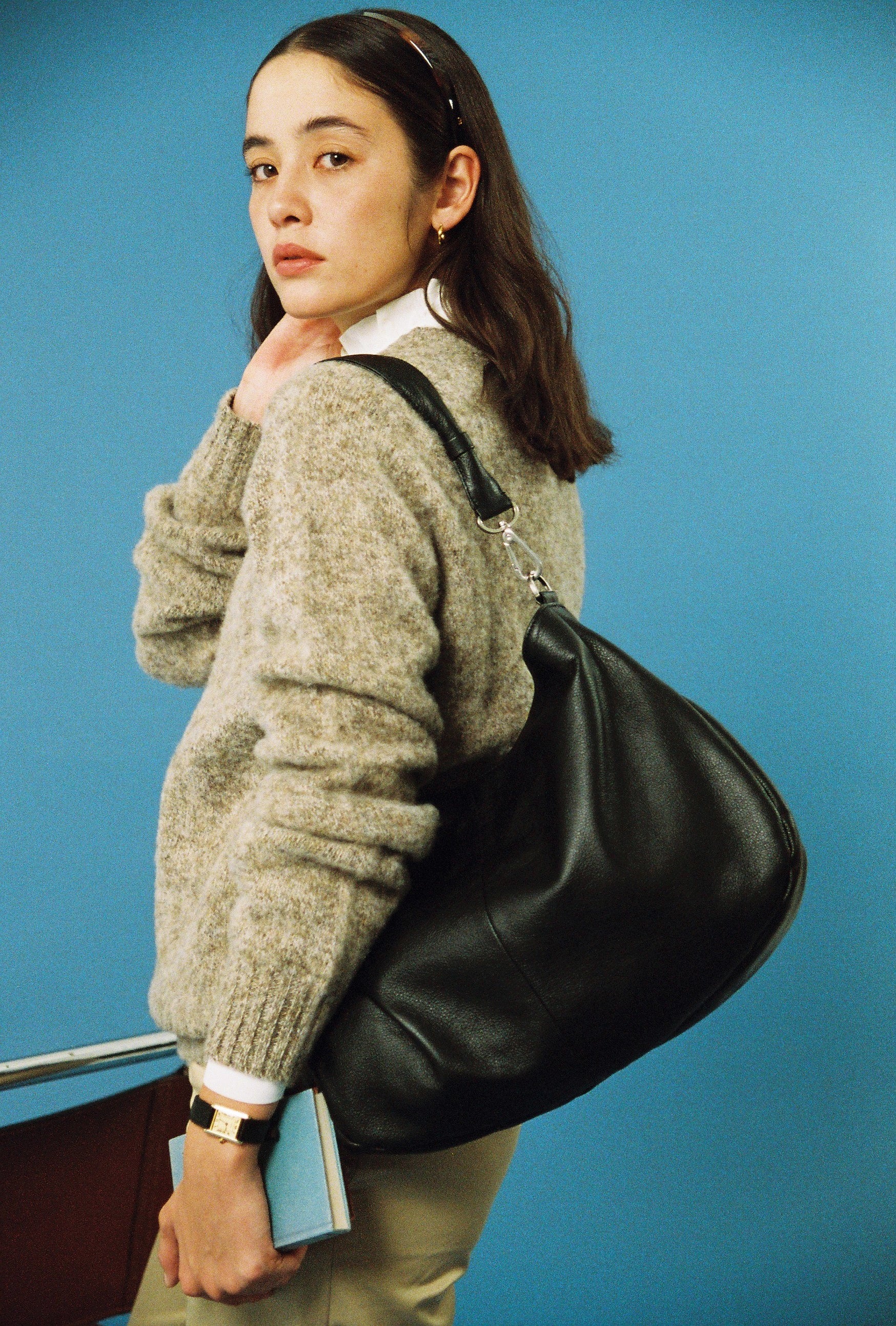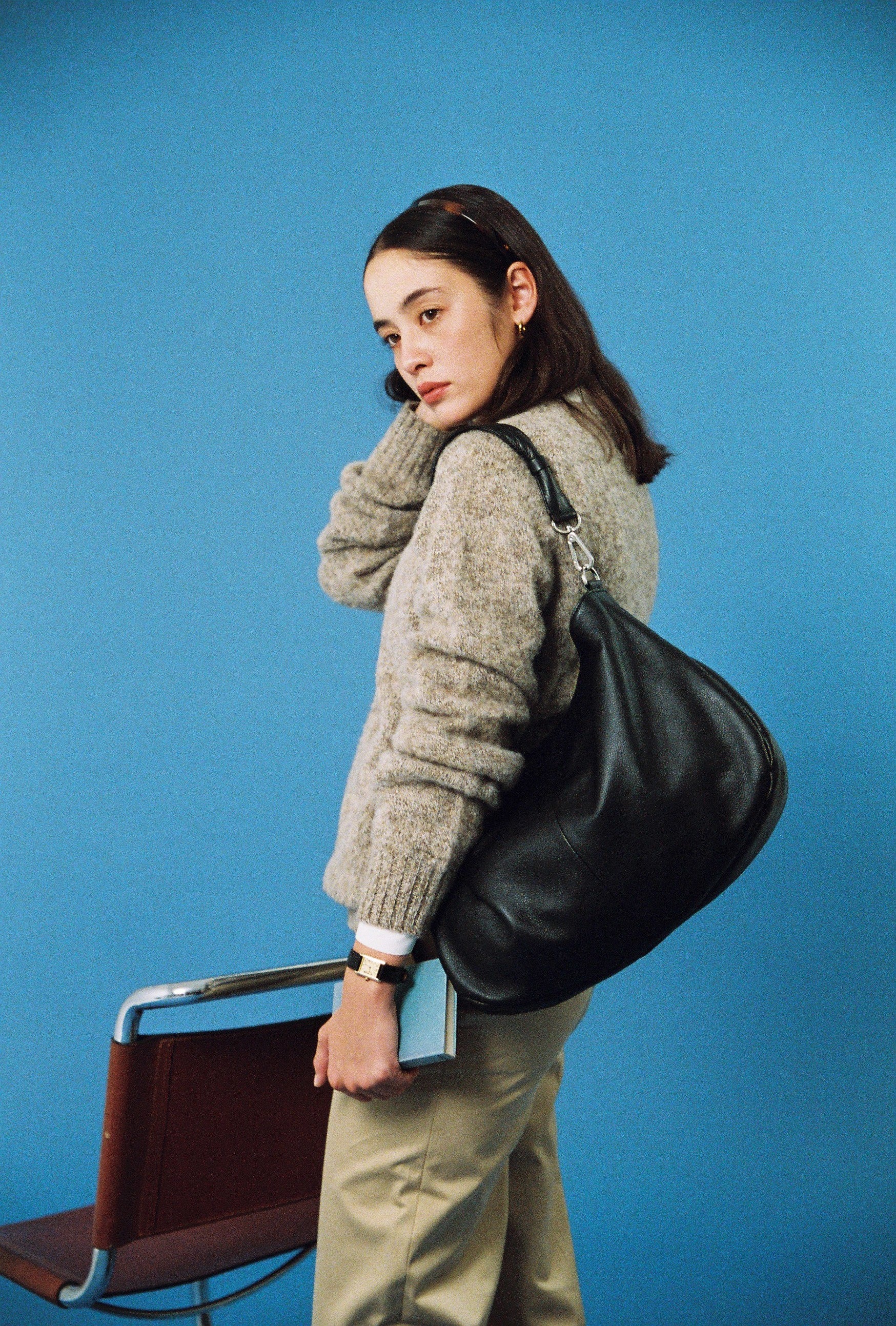 小さな船を意味するフランス語の「Nacelle」をイメージしたナセルバックは、柔軟な革で作られたホーボーバッグです。ソフトな肌触りの革は収納する物によって柔軟に形が整えられ、二重に作られたストラップは楽な着用感を提供します。ストラップの一端にはロゴが刻印された輪飾りを使用しています。内部は2間に分かれており、中央パネルにはファスナーを付けて収納ができるようになっています。シンプルな形にバックル飾りと切開ポイントをつけたナセルバックは、軽い軽量感で四季折々どんな服装にもよく似合います。