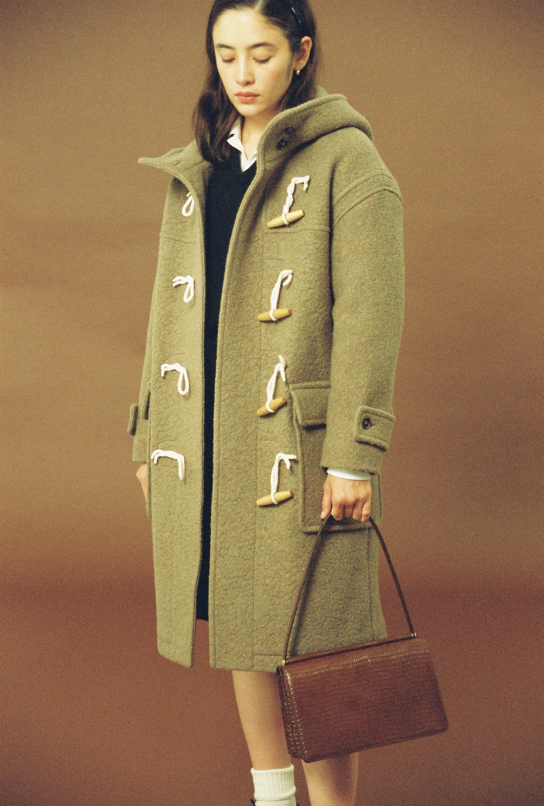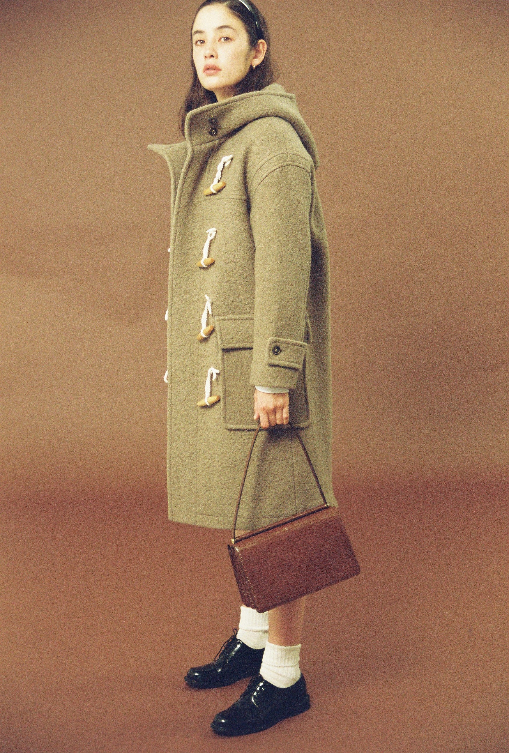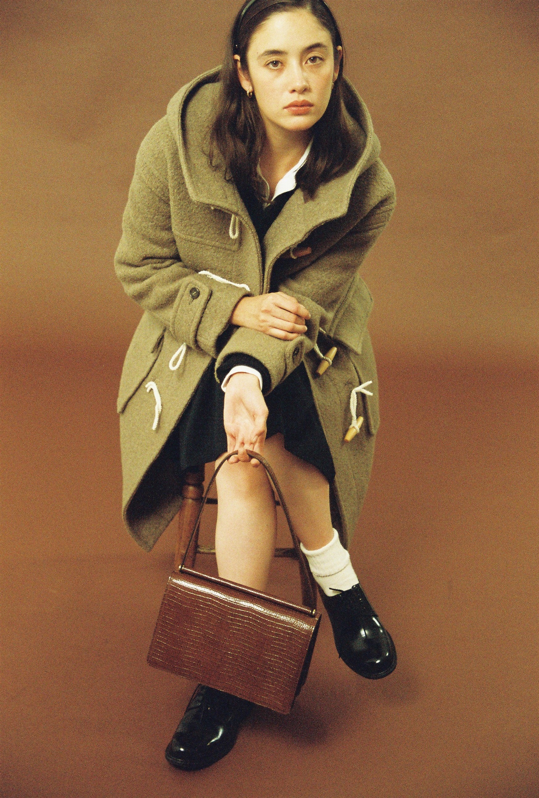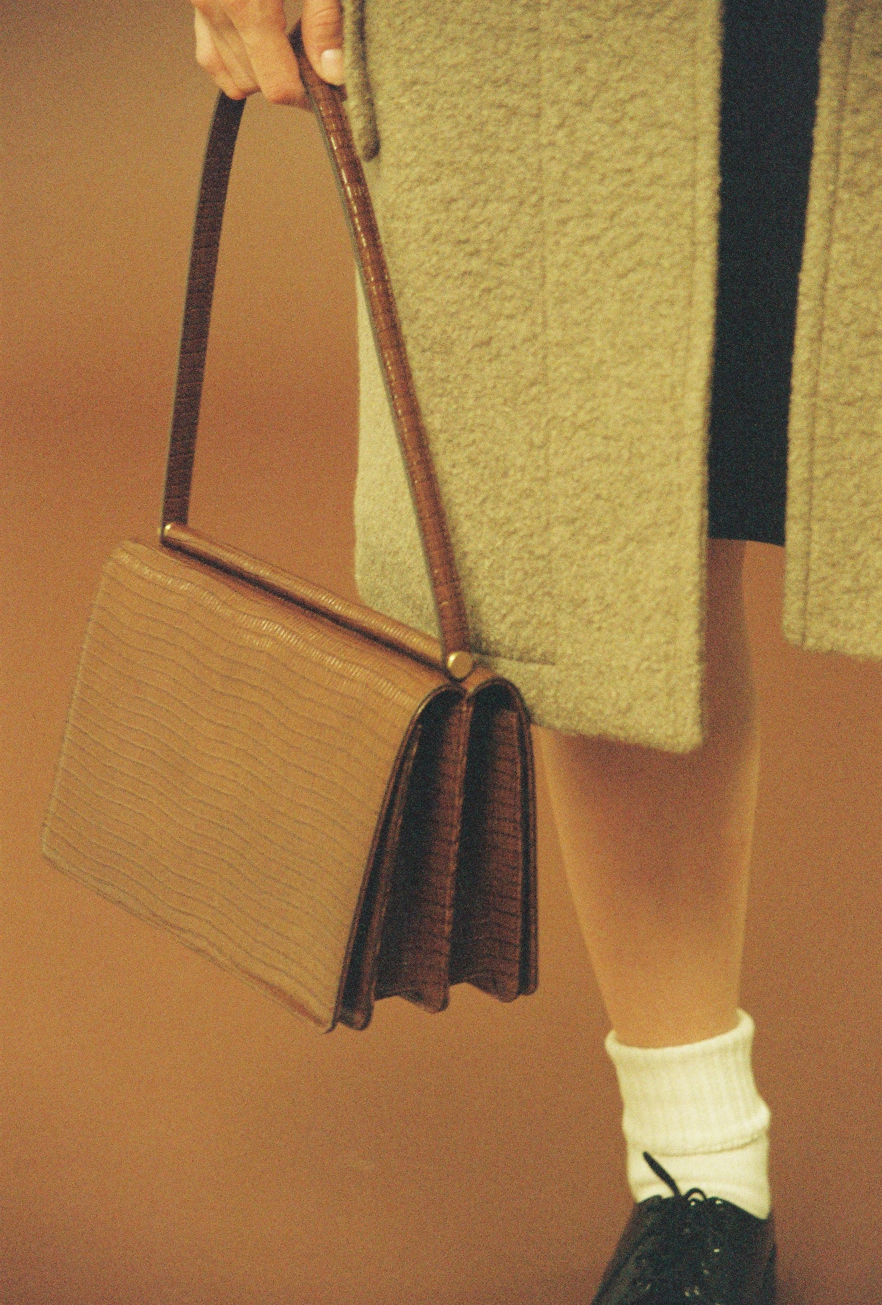 ポメルバッグは四角い端正な形で、トゥティエのシグネチャーモデルの一つです。簡潔なボディの形とトゥティエの象徴的なブラスバー装飾をつなぐ一つのストラップが特徴的です。ショルダーで着用でき、表と裏それぞれにフラップがあるので両方収納が可能です。