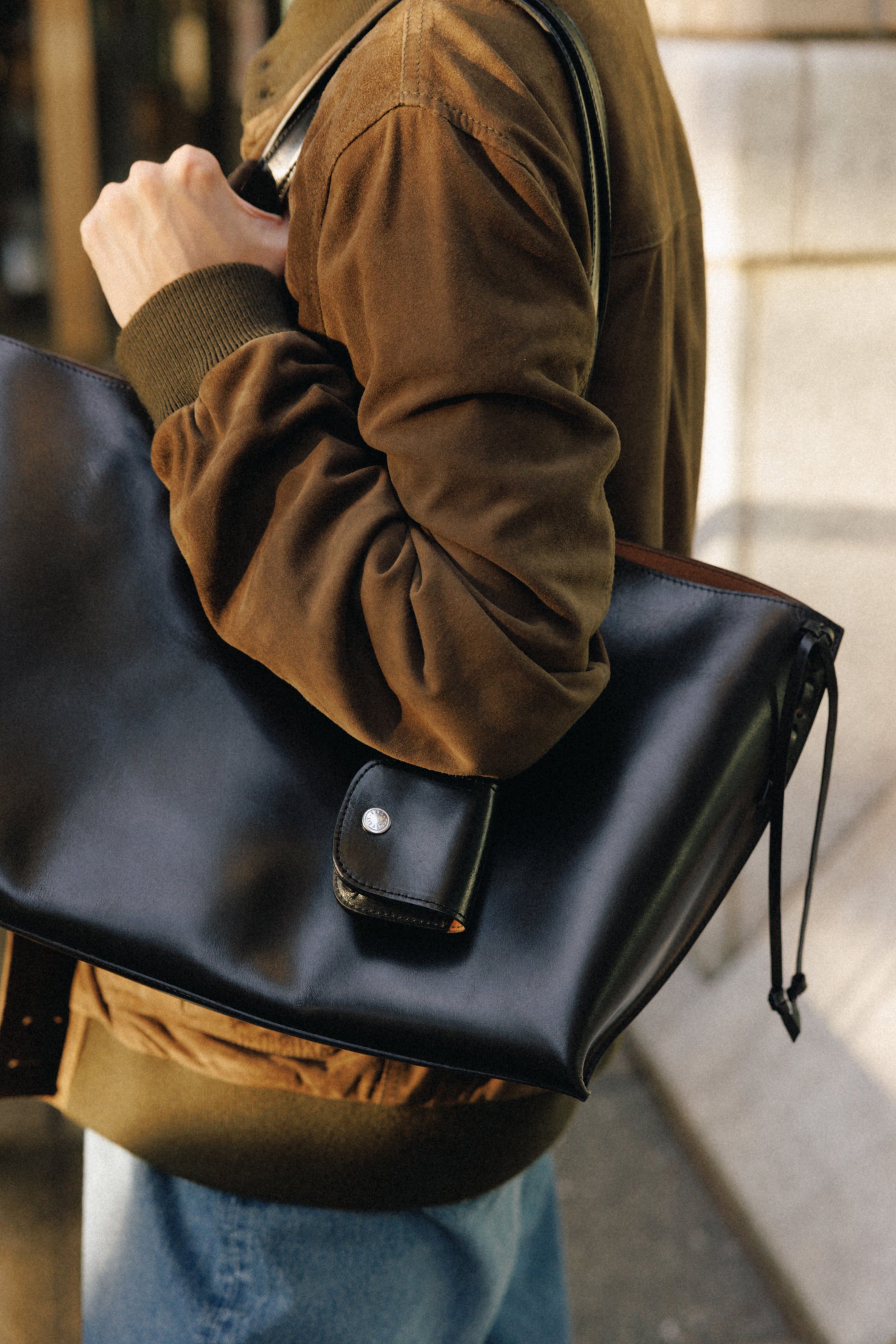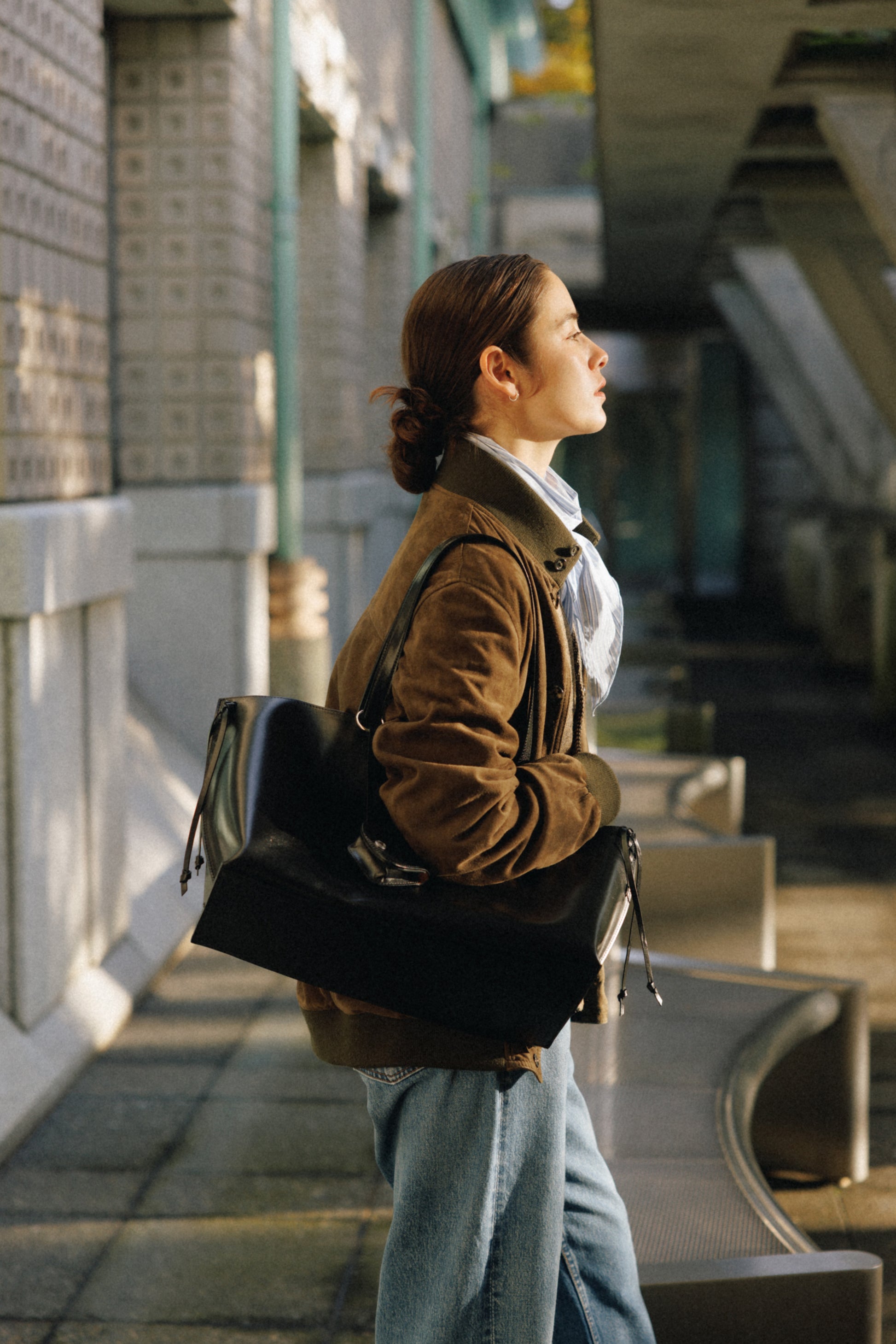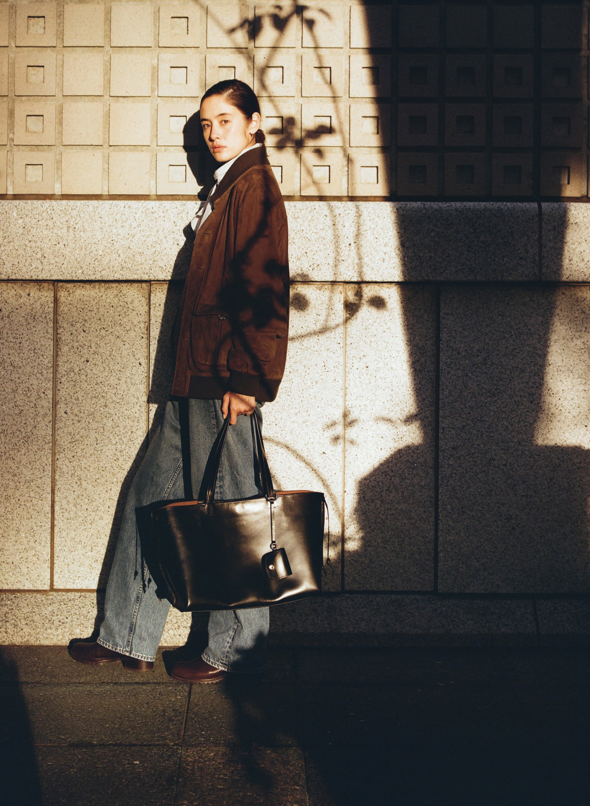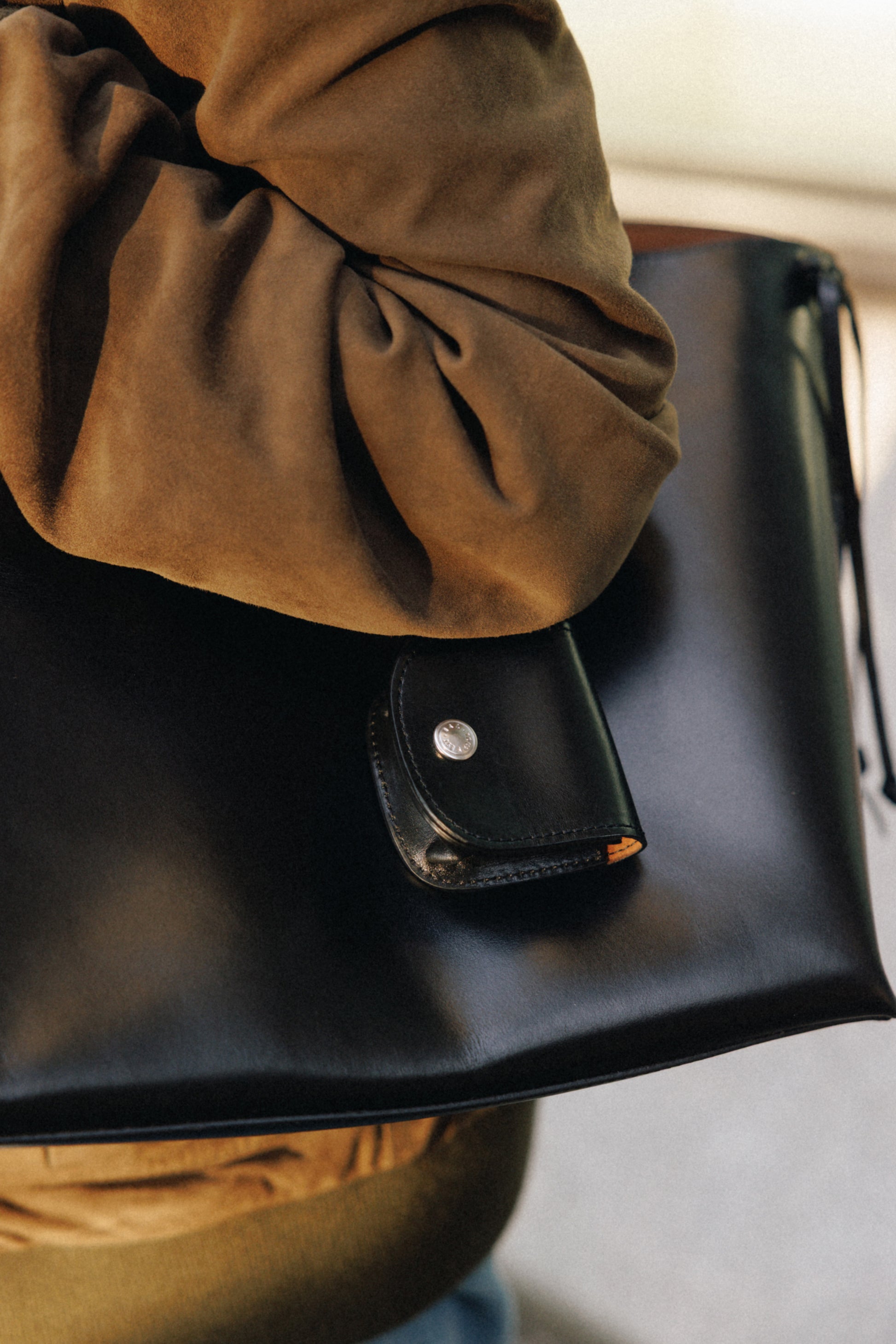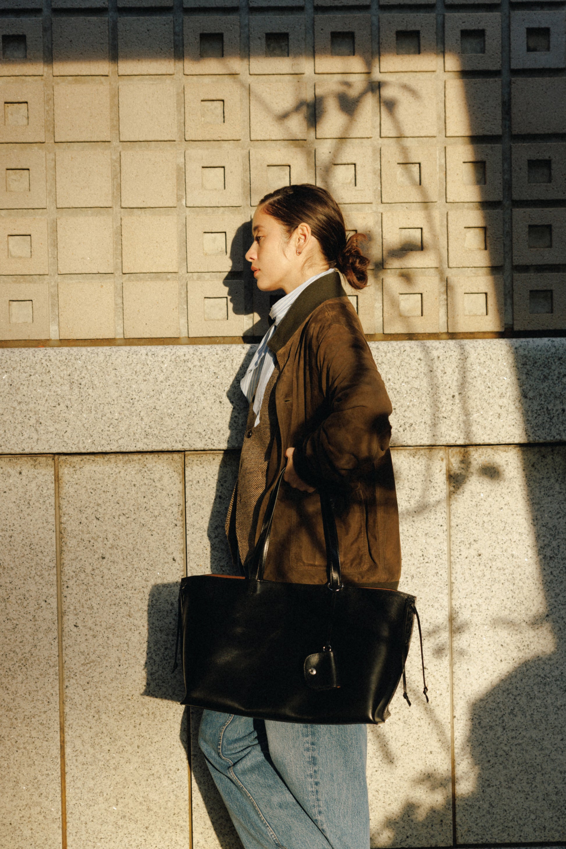 トレセバッグは、ほのかな光沢をもつカウレザーの質感が引き立つショッパーバッグです。両サイドにはレザーコードを配し、ステッチのディテールと繊細な結び目を作って長く垂らすことで、特徴的なシルエットを生み出しています。 付属の小さなレザーポーチはAirPodsなどの小物を収納でき、ストラップに自然に掛けてアクセントとしてお使いいただけます。ライニングにはブラウンの生地を使用し、着用時に柔らかなコントラストがさりげないポイントとなります。内部にはレザーポケットを備え、実用性を高めています。