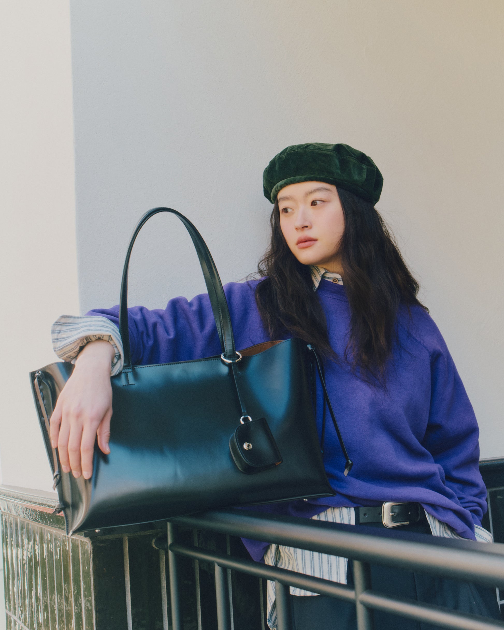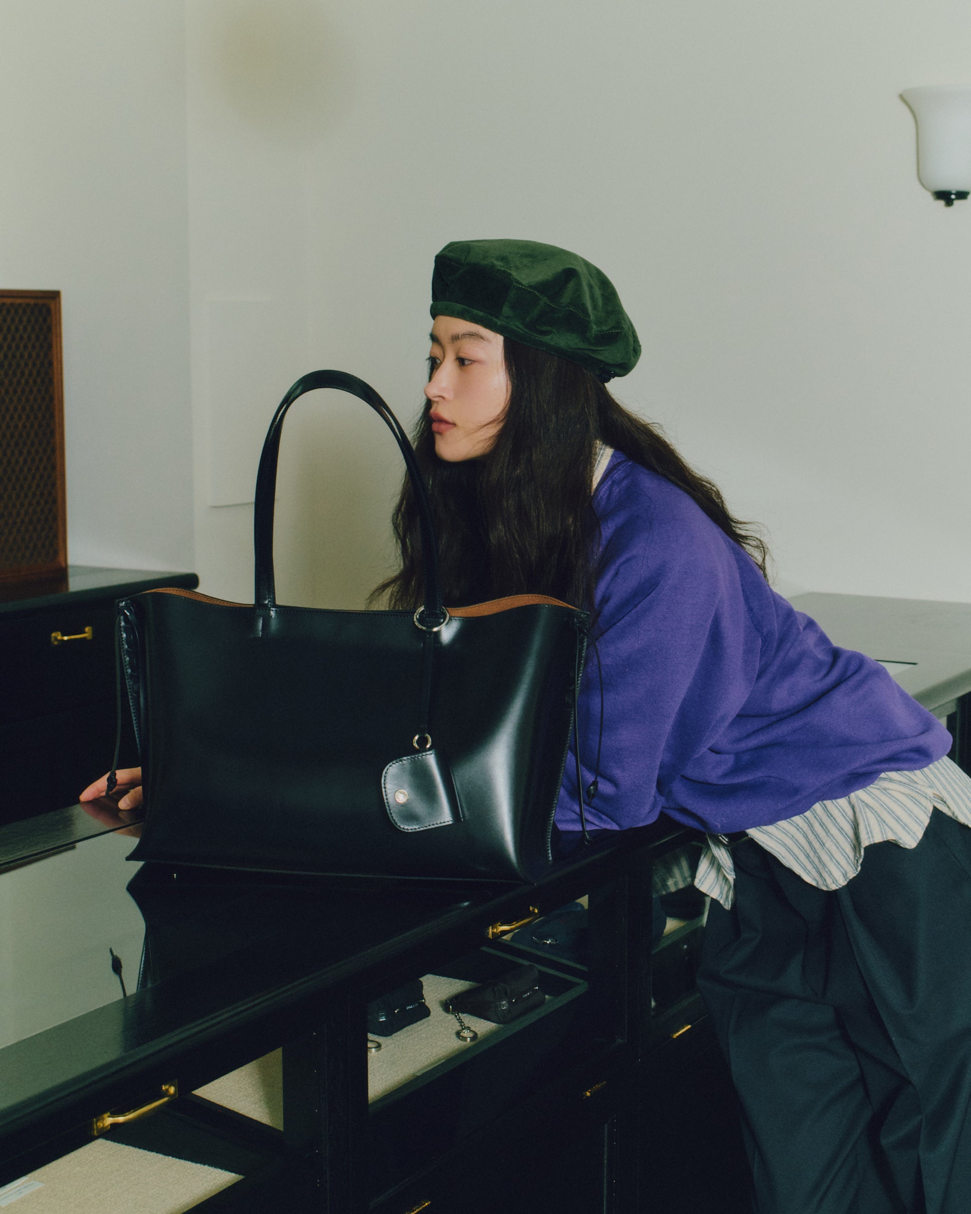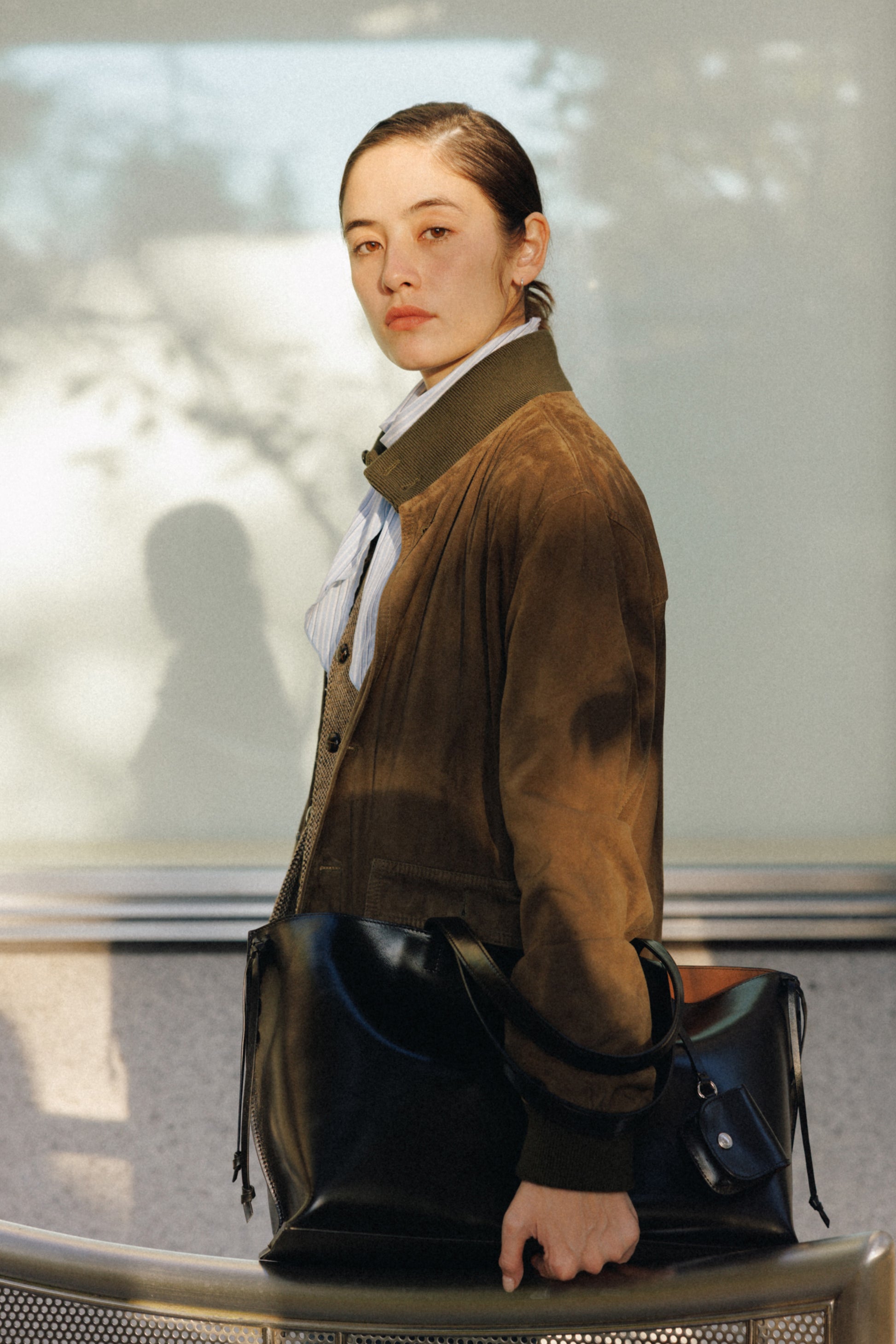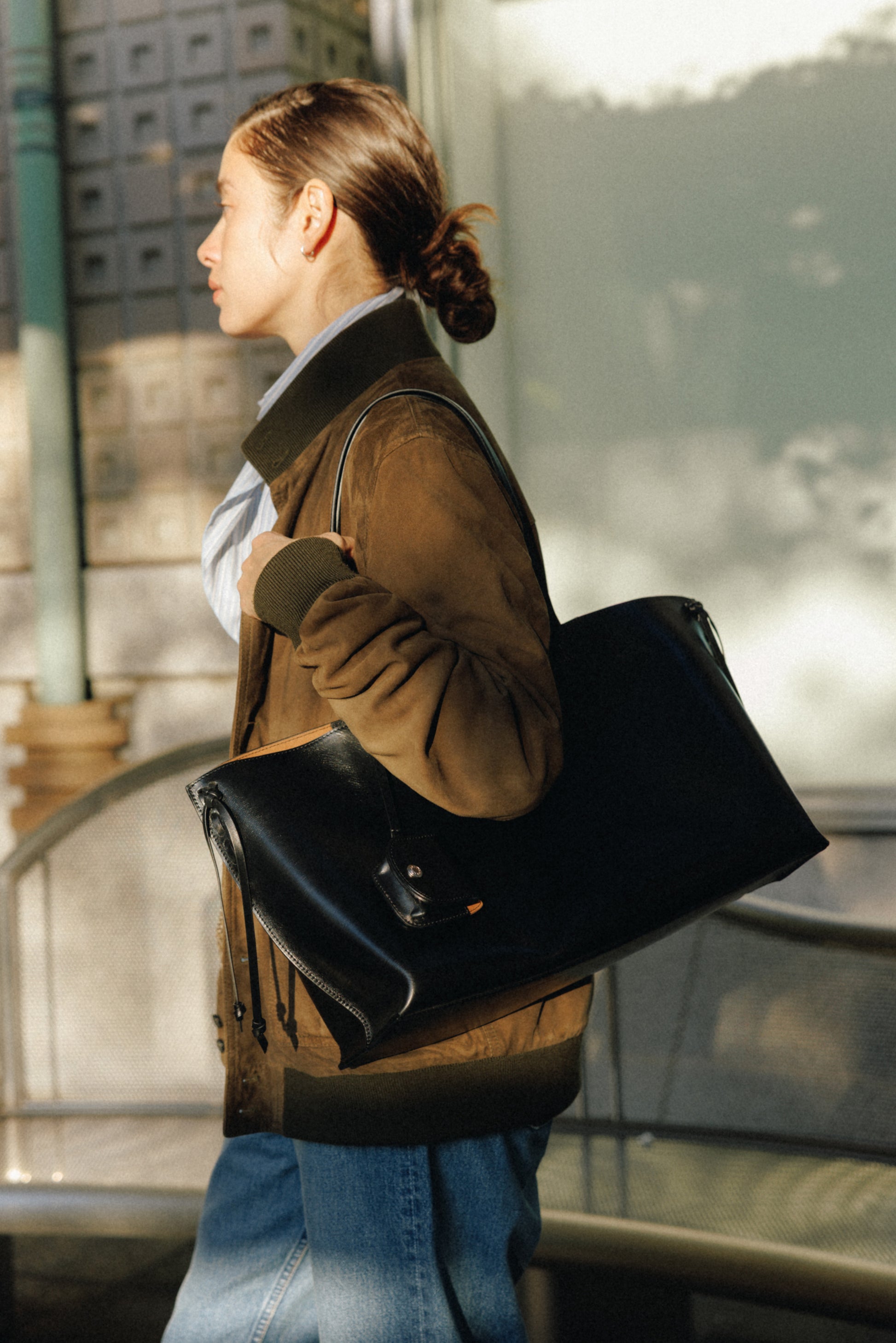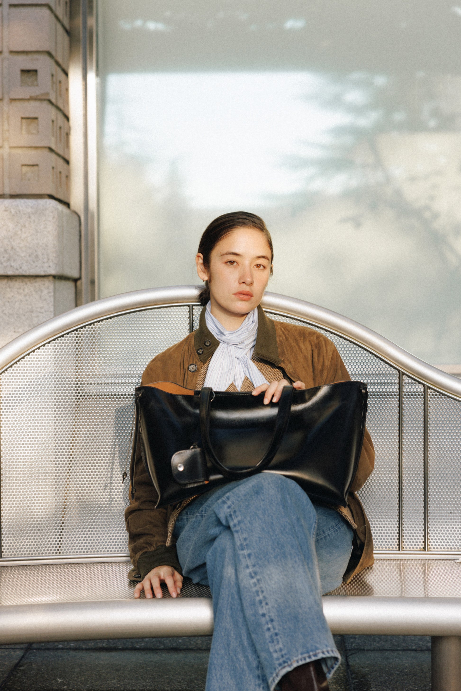 トレセバッグは、ほのかな光沢をもつカウレザーの質感が引き立つショッパーバッグです。両サイドにはレザーコードを配し、ステッチのディテールと繊細な結び目を作って長く垂らすことで、特徴的なシルエットを生み出しています。 付属の小さなレザーポーチはAirPodsなどの小物を収納でき、ストラップに自然に掛けてアクセントとしてお使いいただけます。ライニングにはブラウンの生地を使用し、着用時に柔らかなコントラストがさりげないポイントとなります。内部にはレザーポケットを備え、実用性を高めています。