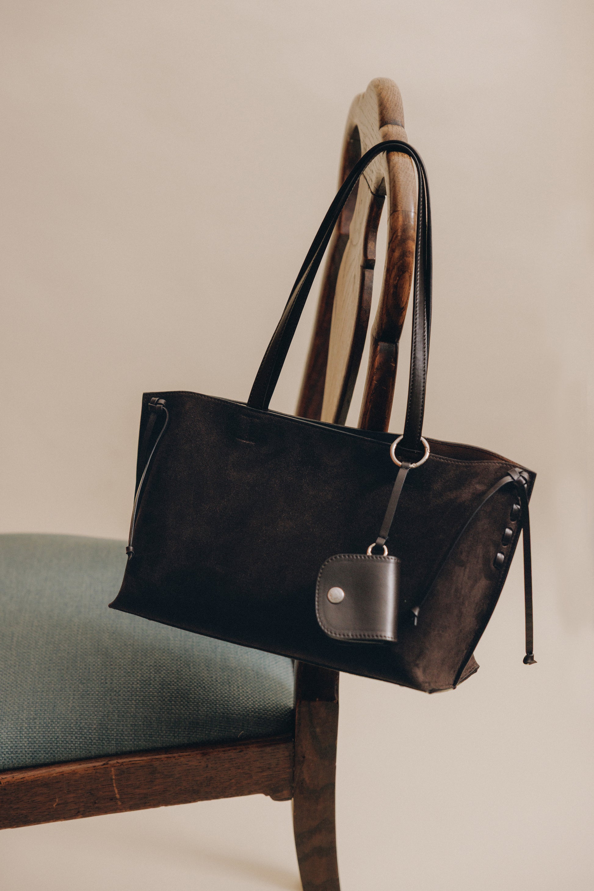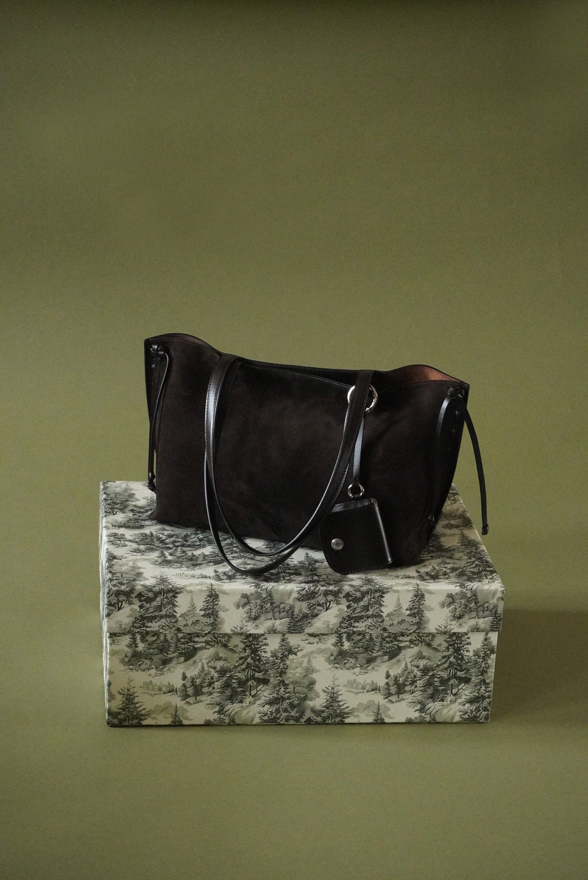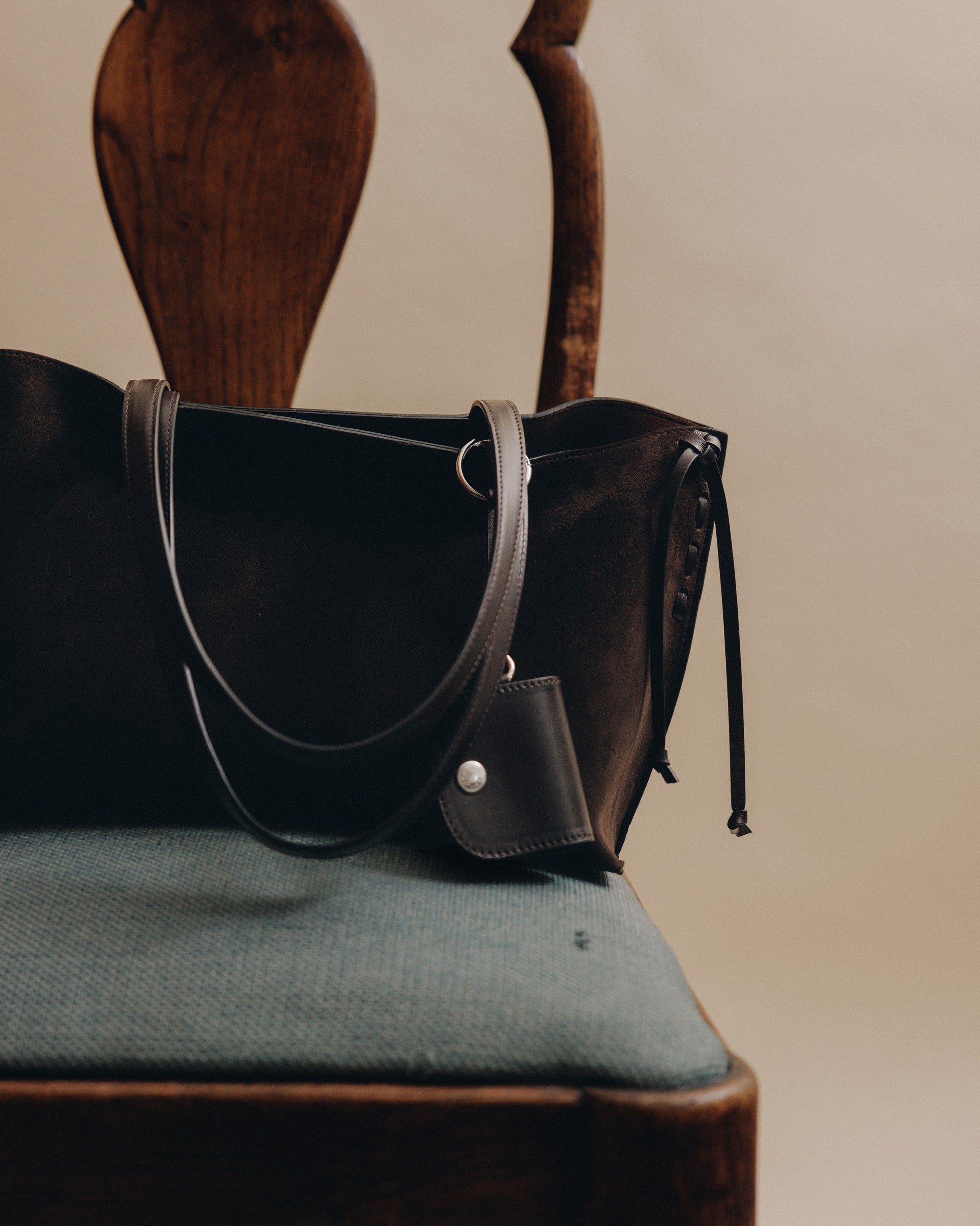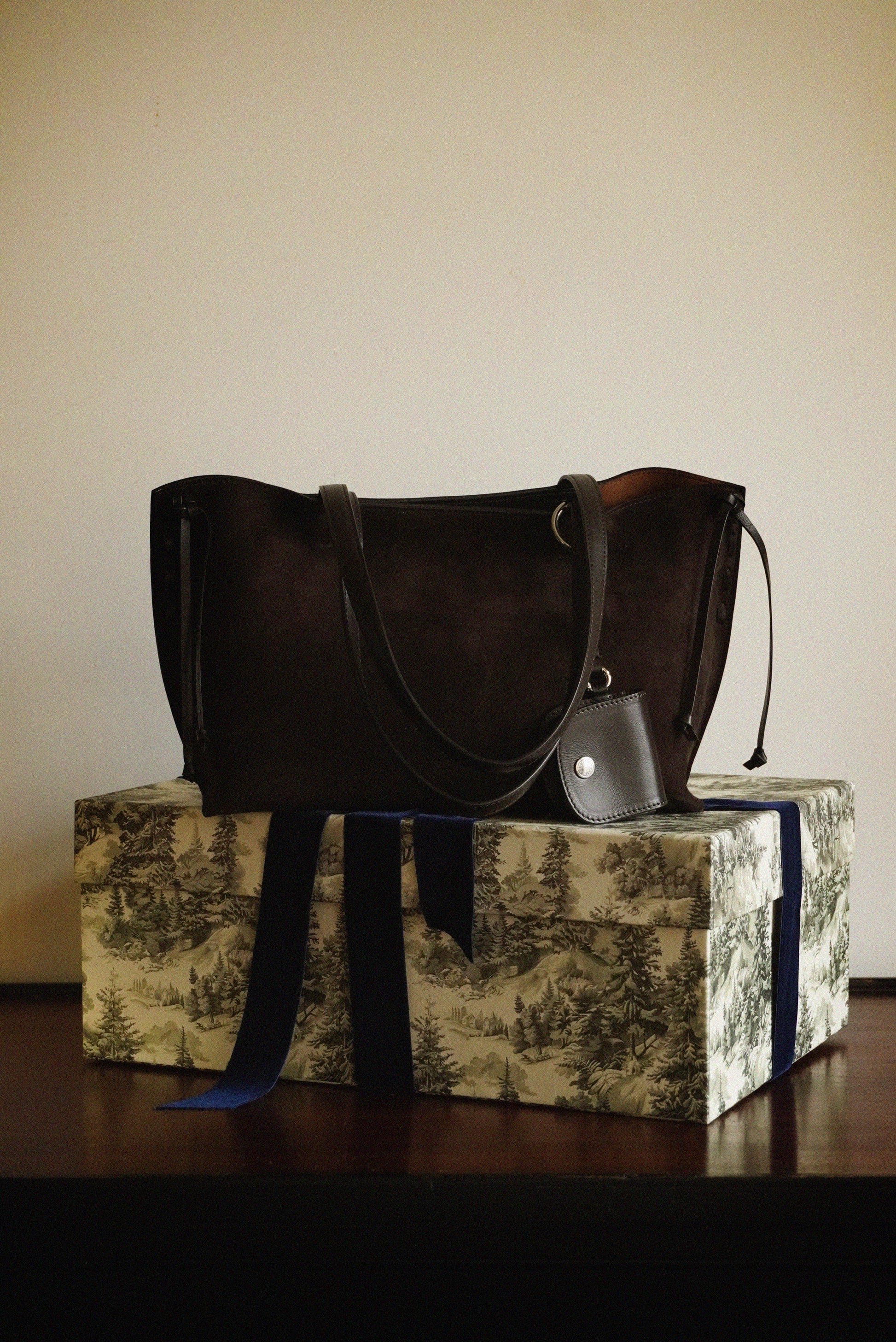 トレセバッグのホリデーエディションは、深みのあるブラウンのゴートスエードをメイン素材に使用し、従来のブラックカウレザーとは異なる、柔らかく奥行きのある質感を表現したシーズン限定モデルです。ショルダーストラップや両サイドのステッチと結び目のディテール、付属のポーチにはすべてカウレザーを用い、スエードよりも濃いブラウンを採用することで、全体に落ち着いた深さを加えています。