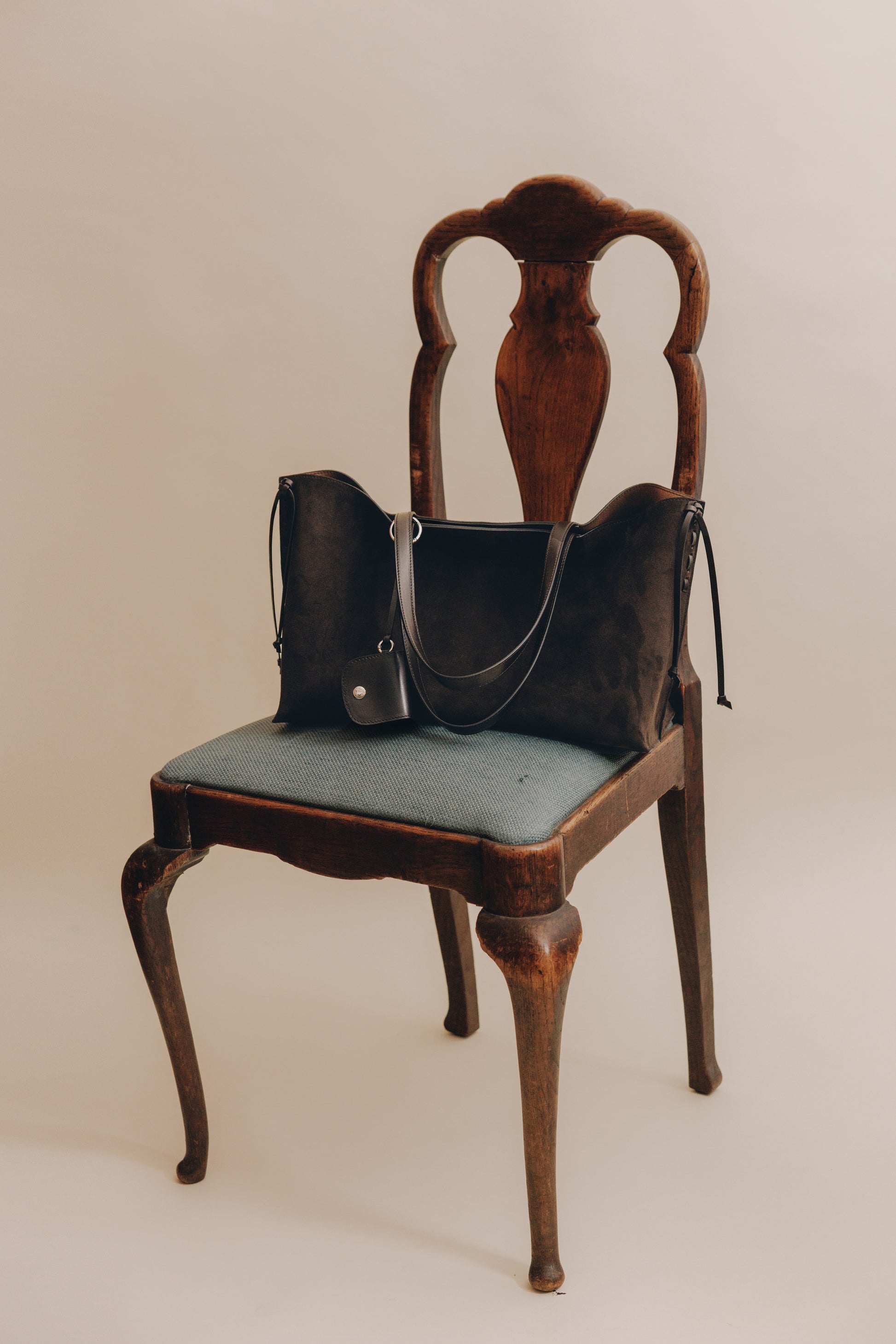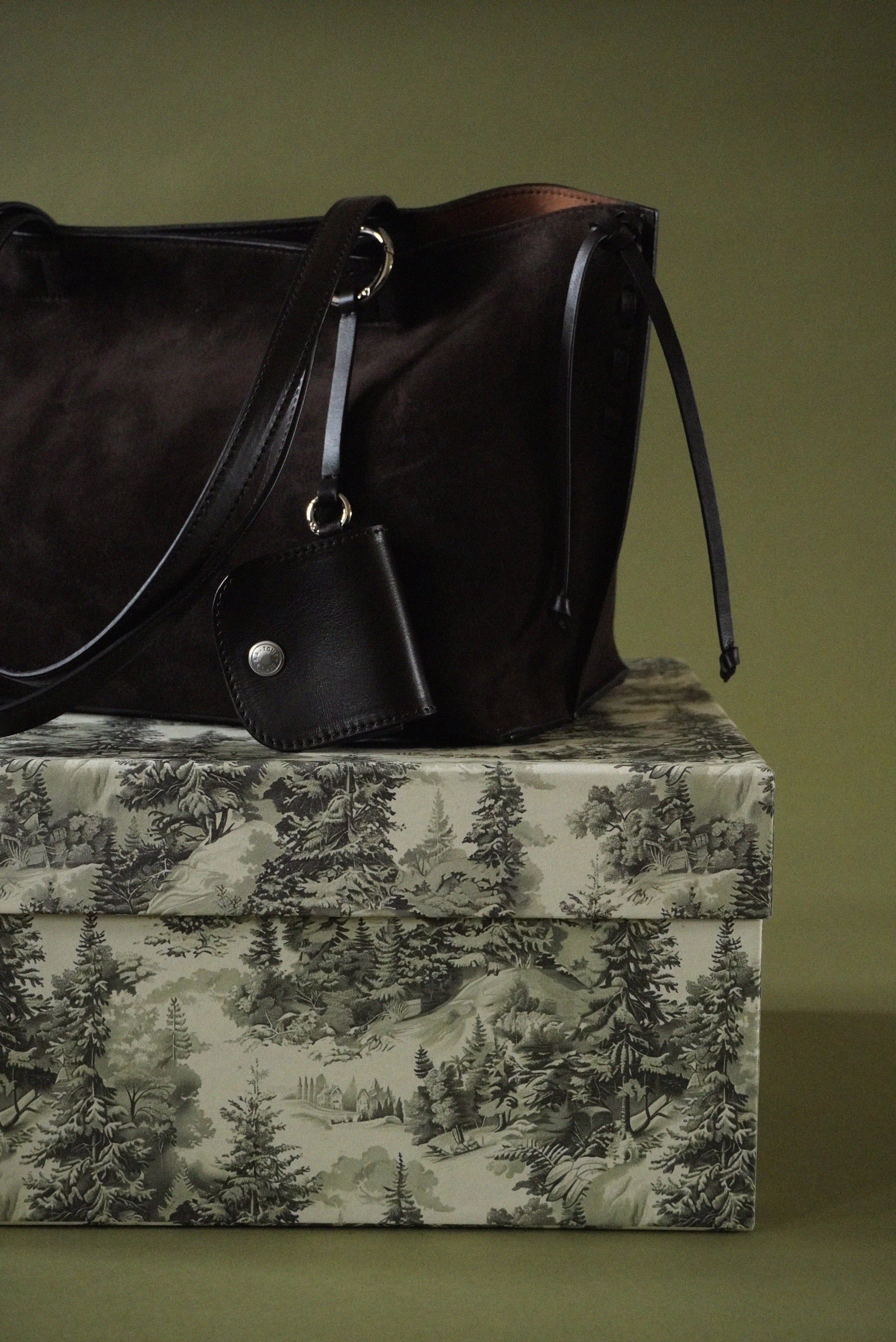 トレセバッグのホリデーエディションは、深みのあるブラウンのゴートスエードをメイン素材に使用し、従来のブラックカウレザーとは異なる、柔らかく奥行きのある質感を表現したシーズン限定モデルです。ショルダーストラップや両サイドのステッチと結び目のディテール、付属のポーチにはすべてカウレザーを用い、スエードよりも濃いブラウンを採用することで、全体に落ち着いた深さを加えています。 ライニングには明るめのブラウン生地を使い、着用時にスエードの深いトーンとやわらかく調和し、温かみのある印象を与えます。付属のレザーポーチはAirPodsなど小物の収納に適しており、ストラップに掛けてアクセントとしてお使いいただけます。